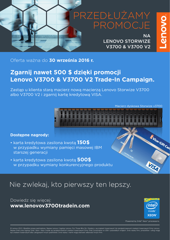 PRZEDŁUŻAMY PROMOCJE NA LENOVO STORWIZE V3700 & V3700 V2 Oferta ważna do 30 września 2016 r. Zgarnij nawet 500 $ dzięki promocji Lenovo V3700 & V3700 V2 Trade-In Campaign. Zastąp u klienta starą macierz nową macierzą Lenovo Storwize V3700 albo V3700 V2 i zgarnij kartę kredytową VISA. Macierz dyskowa Storwize v3700 Dostępne nagrody: •k arta kredytowa zasilona kwotą 150$ w przypadku wymiany pamięci masowej IBM starszej generacji •k arta kredytowa zasilona kwotą 500$ w przypadku wymiany konkurencyjnego produktu Nie zwlekaj, kto pierwszy ten lepszy. Dowiedz się więcej: www.lenovov3700tradein.com Powered by Intel® Xeon® processors. © Lenovo 2015. Wszelkie prawa zastrzeżone. Nazwa Lenovo i logotyp Lenovo, For Those Who Do i System x są znakami towarowymi lub zarejestrowanymi znakami towarowymi firmy Lenovo. Nazwa Intel oraz logotyp Intel, Xeon i Xeon Inside są zarejestrowanym znakami towarowymi firmy Intel Corporation w USA i pozostałych krajach. Inne nazwy firm, produktów i usług mogą być znakami towarowymi albo usługowymi innych podmiotów. Inne nazwy i marki mogą stanowić własność innych firm.