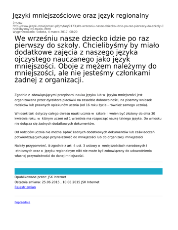 Języki mniejszościowe oraz język regionalny Źródło: http://www.jezyki-mniejszosci.pl/jm/faq/9173,We-wrzesniu-nasze-dziecko-idzie-po-raz-pierwszy-do-szkoly-C hcielibysmy-by-mialo-.html Wygenerowano: Sobota, 4 marca 2017, 08:20 We wrześniu nasze dziecko idzie po raz pierwszy do szkoły. Chcielibyśmy by miało dodatkowe zajęcia z naszego języka ojczystego nauczanego jako język mniejszości. Oboje z mężem należymy do mniejszości, ale nie jesteśmy członkami żadnej z organizacji. Zgodnie z obowiązującymi przepisami nauka języka lub w języku mniejszości jest organizowana przez dyrektora placówki na zasadzie dobrowolności, na pisemny wniosek rodziców lub prawnych opiekunów ucznia (od 16 roku życia - również samego ucznia). Wniosek taki dotyczy całego okresu nauki ucznia w szkole i wnien być złożony do dnia 30 kwietnia roku, w którym uczeń od 1 września ma rozpocząć naukę takiego języka. Do wniosku nie dołącza się żadnych dodatkowych dokumentów. Od rodziców ucznia nie można żądać żadnych dodatkowych dokumentów lub zaświadczeń potwierdzających jego przynależność do mniejszości lub do organizacji mniejszości Należy przypomnieć, iż zgodnie z art. 4 ust. 3 ustawy o mniejszościach narodowych i etnicznych oraz o języku regionalnym nikt nie może być zobowiązany do udowodnienia własnej przynależności do danej mniejszości. Opublikowane przez: JSK Internet Ostatnia zmiana: 25.06.2015 , 10.08.2015 JSK Internet Rejestr zmian Poprzednia