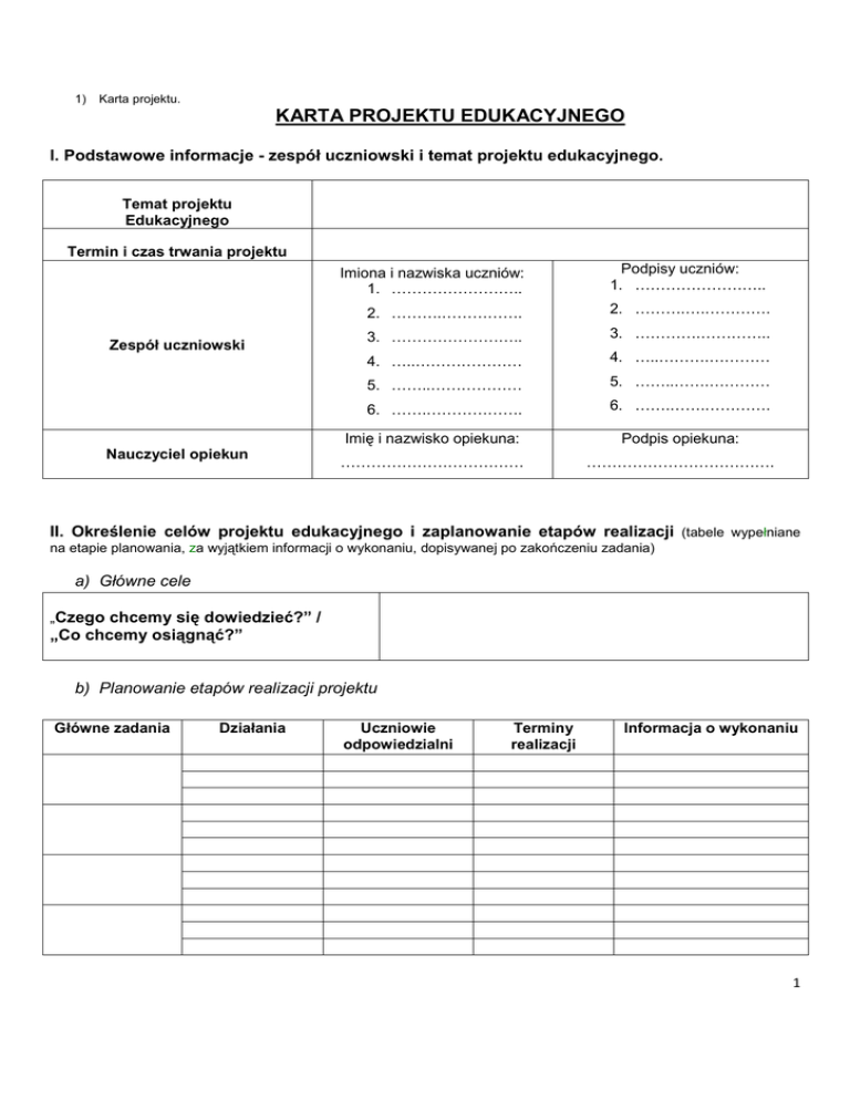 1) Karta projektu. KARTA PROJEKTU EDUKACYJNEGO l. Podstawowe informacje - zespół uczniowski i temat projektu edukacyjnego. Temat projektu Edukacyjnego Termin i czas trwania projektu Zespół uczniowski Nauczyciel opiekun Imiona i nazwiska uczniów: 1. …………………….. Podpisy uczniów: 1. …………………….. 2. ……….……………. 2. ……….….…………. 3. …………………….. 3. ………….………….. 4. …..………………… 4. …..……….………… 5. ……..……………… 5. ……..…….………… 6. …….………………. 6. …….…….…………. Imię i nazwisko opiekuna: Podpis opiekuna: ……………………………… ………………………………. II. Określenie celów projektu edukacyjnego i zaplanowanie etapów realizacji (tabele wypełniane na etapie planowania, za wyjątkiem informacji o wykonaniu, dopisywanej po zakończeniu zadania) a) Główne cele „Czego chcemy się dowiedzieć?” / „Co chcemy osiągnąć?” b) Planowanie etapów realizacji projektu Główne zadania Działania Uczniowie odpowiedzialni Terminy realizacji Informacja o wykonaniu 1 III. Konsultacje z nauczycielem – opiekunem projektu i in. (tabela wypełniana sukcesywnie w czasie realizacji projektu). Termin Temat Imię i nazwisko nauczyciela Podpis nauczyciela IV. Publiczne przedstawienie rezultatów projektu. Termin prezentacji Miejsce prezentacji Forma prezentacji Udział członków zespołu Odbiorcy 2 2) Karta zadania / działania. KARTA ZADANIA (DZIAŁANIA) l. Podstawowe informacje - zespół uczniowski i temat projektu edukacyjnego. Temat projektu Edukacyjnego Zespół uczniowski Nauczyciel opiekun Imiona i nazwiska uczniów: 1. …………………….. Podpisy uczniów: 1. …………………….. 2. . ……….……………. 2. ……….….…………. 3. …………………….. 3. ………….………….. 4. …..………………… 4. …..……….………… 5. ……..……………… 5. ……..…….………… 6. …….………………. 6. …….…….…………. Imię i nazwisko opiekuna: Podpis opiekuna: ……………………………… ………………………………. II. Planowanie realizacji zadań / działań (tabela wypełniana przed przystąpieniem do wykonywania zadań / działań). Zadania / działania Uczniowie odpowiedzialni za wykonanie zadania /działania i ich role Źródła informacji, materiały i zasoby Sojusznicy Termin wykonania 3 III. Uwagi o realizacji zadań / działań (tabela wypełniana po realizacji zadania / działania). Zadania / działania Dotrzymanie terminu wykonania Stopień realizacji Trudności w realizacji Stworzone produkty 4