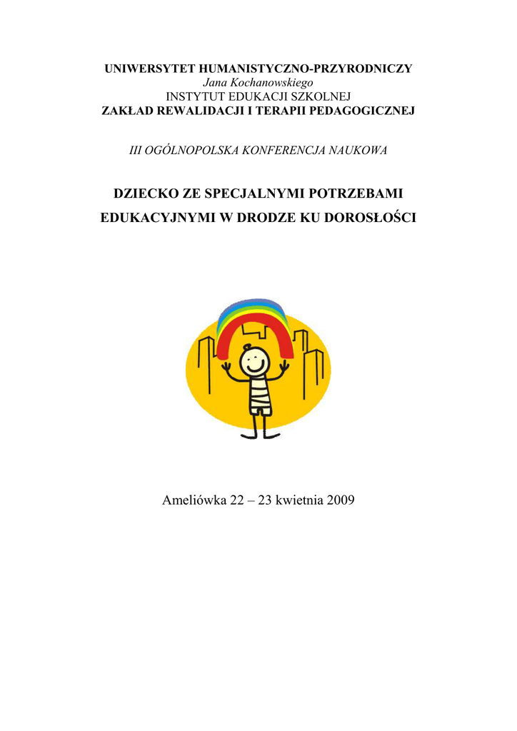 UNIWERSYTET HUMANISTYCZNO-PRZYRODNICZY Jana Kochanowskiego INSTYTUT EDUKACJI SZKOLNEJ ZAKŁAD REWALIDACJI I TERAPII PEDAGOGICZNEJ III OGÓLNOPOLSKA KONFERENCJA NAUKOWA DZIECKO ZE SPECJALNYMI POTRZEBAMI EDUKACYJNYMI W DRODZE KU DOROSŁOŚCI Ameliówka 22 – 23 kwietnia 2009 RAMOWY PROGRAM KONFERENCJI 22 kwietnia 2009 10.00 – 11.00 – Otwarcie Konferencji 11.00 – 14.00 – Sesja plenarna 14.15 – 15.00 – Obiad 15.30 – 18.00 – Obrady w sekcjach 18.30 – 19.30 – Warsztaty 20.00 – Bankiet 23 kwietnia 2009 9.00 – 11.30 – Sesja plenarna 11.30 – 12.00 – Przerwa 12.00 – 14.30 – Sesja plenarna 15.00 – Obiad 22 kwietnia 2009 Sesja plenarna I przewodnictwo: Prof. dr hab. W. Pilecka oraz Prof. dr hab. C. Kosakowski 1. Prof. dr hab. Raisa Iwanowa Łałajewa (Uniwersytet im. A. S. Puszkina w Sankt Petersburgu) Dysortografia jako językowe zaburzenie: problem mechanizmów i korekcji. Дизорфография как языковое расстройство: проблемы механизмов и коррекции 2. Prof. dr hab. Marta Bogdanowicz (Uniwersytet Gdański) Prawa studentów z dysleksją – wyniki kwestionariusza Europejskiego Towarzystwa Dysleksji 3. Prof. dr hab. Franciszek Wojciechowski (Uniwersytet Jagielloński Kraków) Dorastanie w przestrzeni edukacyjnej - swoistość zjawiska w kontekście niepełnosprawności 4. Prof. dr hab. Czesław Kosakowski (Uniwersytet Warmińsko-Mazurski Olsztyn) Dorastanie do Ŝycia z Zespołem Touretta 5. Prof. dr hab. Aniela Korzon (Dolnośląska Szkoła WyŜsza Wrocław) Wychowanie seksualne głuchych w realizacji ścieŜki edukacyjnej wychowanie do Ŝycia w rodzinie 6. Prof. dr hab. Zenon Gajdzica (Uniwersytet Śląski – Cieszyn) Rola kapitału społecznego w drodze ku dorosłości młodzieŜy z lekką niepełnosprawnością intelektualną Sekcja I Realizacja standardowych i specyficznych zadań rozwojowych przez dzieci ze specjalnymi potrzebami edukacyjnymi przewodnictwo: Prof. dr hab. W. Otrębski oraz dr B. Witkowska 1. Dr Bogumiła Witkowska (Uniwersytet Jana Kochanowskiego w Kielcach) Dzieci ze specjalnymi potrzebami edukacyjnymi wobec zadań rozwojowych wczesnego dzieciństwa 2. Mgr Kamila Tusznio (Uniwersytet Jana Kochanowskiego w Kielcach) Potrzeby rozwojowe i edukacyjne dzieci z Zespołem Downa 3. Dr Barbara Winczura (Uniwersytet Wrocławski) Zabawa jako obszar diagnostyczny rozwoju teorii umysłu u dzieci z autyzmem 4. Mgr Małgorzata Kowalczyk (Uniwersytet Jana Kochanowskiego w Kielcach) Aktywność zabawowa dzieci z autyzmem wczesnodziecięcym w wieku przedszkolnym w kontekście uwarunkowań indywidualnych 5. Dr Katarzyna Kokot (Uniwersytet Wrocławski) Rozwój mowy – norma, profilaktyka, zagroŜenia 6. Mgr Izabela Antos (Uniwersytet Jana Kochanowskiego w Kielcach) W trosce o przyszłość dzieci z zaburzeniami mowy 7. Mgr Agnieszka Hamerlińska (Uniwersytet Kazimierza Wielkiego w Bydgoszczy) Wczesna interwencja logopedyczna pierwszym krokiem ku rozwojowi komunikacji dzieci z grupy ryzyka 8. Dr Krystyna Błachnio (Uniwersytet im. A. Mickiewicza w Poznaniu) RóŜnorodność potrzeb logopedycznych dzieci i młodzieŜy specjalnej troski edukacyjnej 9. Dr Agnieszka Lasota (Uniwersytet Pedagogiczny Kraków) Komunikacja niejęzykowa dzieci we wczesnym dzieciństwie w interakcji z dorosłym 10. Dr Katarzyna Kaczorowska-Bray, Dr Ewa Czaplewska (Uniwersytet Gdański) Wyrazy tekstowe i wypowiedzenia w mowie dzieci upośledzonych umysłowo w stopniu umiarkowanym i lekkim 11. Dr Alicja Giermakowska (Uniwersytet Jana Kochanowskiego w Kielcach) Ryzyko dysortografii u dzieci z nieprawidłowym rozwojem artykulacji 12. Mgr Izabella Parulska u uczniów niewidomych (UMCS Lublin) Rozumowanie przez analogie liczbowe Sekcja II Szanse i zagroŜenia młodzieŜy niepełnosprawnej w jej drodze ku dorosłości przewodnictwo: Prof. dr hab. A. Mikrut oraz Prof. dr hab. A. Korzon 1. Dr ElŜbieta Minczakiewicz (Kolegium Nauczycielskie Gliwice) Dorosłość w niepełnosprawności. Fakty i mity 2. Dr Katarzyna Parys (Uniwersytet Pedagogiczny Kraków) Zdolności twórcze osób z upośledzeniem umysłowym w stopniu głębszym 3. Mgr Michał J. Gacek (Uniwersytet Jagielloński Kraków) Samoocena w ujęciu Susan Harter w badaniach nad dziećmi i młodzieŜą o specjalnych potrzebach edukacyjnych 4. Dr Paweł Kurtek (Uniwersytet Jana Kochanowskiego w Kielcach) Koncepcja własnej niepełnosprawności młodzieŜy z lekkim i umiarkowanym stopniem niepełnosprawności intelektualnej 5. Dr Piotr Majewicz (Uniwersytet Pedagogiczny Kraków) Dynamika autopercepcji osób po zabiegach operacyjnych kręgosłupa 6. Dr Jolanta Baran (Uniwersytet Pedagogiczny Kraków) Osoby znaczące młodzieŜy z niepełnosprawnością intelektualną w ich drodze ku dorosłości 7. Dr Karol Bidziński (Uniwersytet Jana Kochanowskiego w Kielcach) Wartości obecne w stylach Ŝycia preferowanych przez młodzieŜ z niepełnosprawnością intelektualną 8. Mgr Ewa Jaglarz, Mgr Jacek Sikorski (Zespół Szkół Ogólnokształcących Integracyjnych Kraków; Uniwersytet Pedagogiczny Kraków) Świadomość środowiska pracowniczego w opinii uczniów gimnazjum integracyjnego 9. Dr Anna Wojnarska (UMCS Lublin) Struktura kompetencji społecznych upośledzonej umysłowo młodzieŜy 10. Mgr Remigiusz J. Kijak (Uniwersytet Kazimierza Wielkiego w Bydgoszczy) Problematyka seksualności osób z niepełnosprawnością intelektualną w stopniu umiarkowanym – prawidłowości rozwoju oraz kontekst społeczny 11. Dr Ewa Szumilas (Uniwersytet Jana Kochanowskiego w Kielcach) Dylematy dorosłości osób z problemami zdrowotno – rozwojowymi. Studium dwóch przypadków – kruchy X i ADHD 12. Dr Marta Wójcik, Dr Urszula Bartnikowska (Uniwersytet Warmińsko - Mazurski Olsztyn) Problemy dorastania młodzieŜy z wadą słuchu w oczach jej nauczycieli i wychowawców Sekcja III Środowiskowe uwarunkowania realizacji zadań rozwojowych przez dzieci i młodzieŜy ze specjalnymi potrzebami edukacyjn
