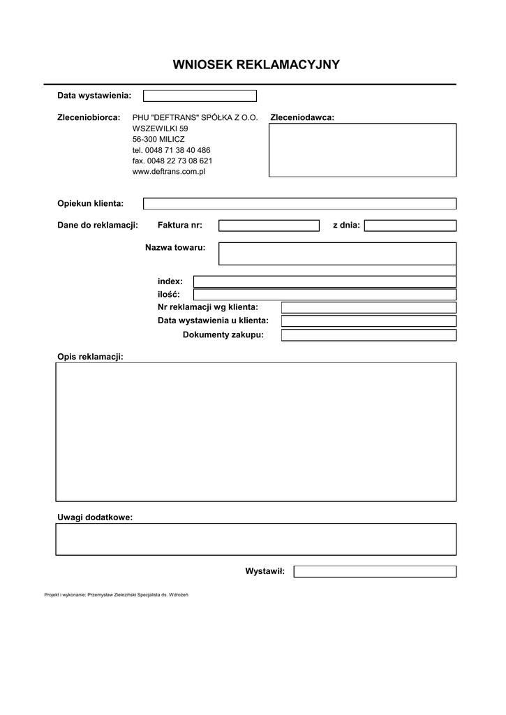 WNIOSEK REKLAMACYJNY Data wystawienia: Zleceniobiorca: PHU "DEFTRANS" SPÓŁKA Z O.O. WSZEWILKI 59 56-300 MILICZ tel. 0048 71 38 40 486 fax. 0048 22 73 08 621 www.deftrans.com.pl Zleceniodawca: Opiekun klienta: Dane do reklamacji: Faktura nr: z dnia: Nazwa towaru: index: ilość: Nr reklamacji wg klienta: Data wystawienia u klienta: Dokumenty zakupu: Opis reklamacji: Uwagi dodatkowe: Wystawił: Projekt i wykonanie: Przemysław Zieleziński Specjalista ds. Wdrożeń
