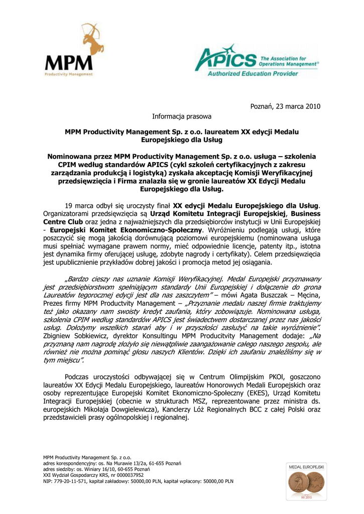 Poznań, 23 marca 2010 Informacja prasowa MPM Productivity Management Sp. z o.o. laureatem XX edycji Medalu Europejskiego dla Usług Nominowana przez MPM Productivity Management Sp. z o.o. usługa – szkolenia CPIM według standardów APICS (cykl szkoleń certyfikacyjnych z zakresu zarządzania produkcją i logistyką) zyskała akceptację Komisji Weryfikacyjnej przedsięwzięcia i Firma znalazła się w gronie laureatów XX Edycji Medalu Europejskiego dla Usług. 19 marca odbył się uroczysty finał XX edycji Medalu Europejskiego dla Usług. Organizatorami przedsięwzięcia są Urząd Komitetu Integracji Europejskiej, Business Centre Club oraz jedna z najważniejszych dla przedsiębiorców instytucji w Unii Europejskiej - Europejski Komitet Ekonomiczno-Społeczny. Wyróżnieniu podlegają usługi, które poszczycić się mogą jakością dorównującą poziomowi europejskiemu (nominowana usługa musi spełniać wymagane prawem normy, mieć odpowiednie licencje, patenty itp., istotna jest dynamika firmy oferującej usługę, zdobyte nagrody i certyfikaty). Celem przedsięwzięcia jest upublicznienie przykładów dobrej jakości i promocja metod jej osiągania. „Bardzo cieszy nas uznanie Komisji Weryfikacyjnej. Medal Europejski przyznawany jest przedsiębiorstwom spełniającym standardy Unii Europejskiej i dołączenie do grona Laureatów tegorocznej edycji jest dla nas zaszczytem” – mówi Agata Buszczak – Męcina, Prezes firmy MPM Productvity Management – „Przyznanie medalu naszej firmie traktujemy też jako okazany nam swoisty kredyt zaufania, który zobowiązuje. Nominowana usługa, szkolenia CPIM według standardów APICS jest świadectwem dostarczanej przez nas jakości usług. Dołożymy wszelkich starań aby i w przyszłości zasłużyć na takie wyróżnienie”. Zbigniew Sobkiewicz, dyrektor Konsultingu MPM Producitvity Management dodaje: „Na przyznaną nam nagrodę złożyło się niewątpliwie zaangażowanie całego naszego zespołu, ale również nie można pominąć głosu naszych Klientów. Dzięki ich zaufaniu znaleźliśmy się w tym miejscu”. Podczas uroczystości odbywającej się w Centrum Olimpijskim PKOl, goszczono laureatów XX Edycji Medalu Europejskiego, laureatów Honorowych Medali Europejskich oraz osoby reprezentujące Europejski Komitet Ekonomiczno-Społeczny (EKES), Urząd Komitetu Integracji Europejskiej (obecnie w strukturach MSZ, reprezentowane przez ministra ds. europejskich Mikołaja Dowgielewicza), Kanclerzy Lóż Regionalnych BCC z całej Polski oraz przedstawicieli prasy ogólnopolskiej i regionalnej. MPM Productivity Management Sp. z o.o. adres korespondencyjny: os. Na Murawie 13/2a, 61-655 Poznań adres siedziby: os. Winiary 16/10, 60-655 Poznań XXI Wydział Gospodarczy KRS, nr 0000037952 NIP: 779-20-11-571, kapitał zakładowy: 50000,00 PLN, kapitał wpłacony: 50000,00 PLN MPM Productivity Management sp. z o.o. to firma szkoleniowo-konsultingowa, specjalizująca się w doradztwie i szkoleniach z zakresu zarządzania łańcuchem dostaw oraz zarządzania produkcją i logistyką w procesie tworzenia wartości dodanej. Firma istnieje od 12 lat i zatrudnia obecnie 7 konsultantów. Od 2009 r. MPM Productivity Management jest pierwszym w Polsce i w Europie Wschodniej oficjalnym przedstawicielem amerykańskiego stowarzyszenia APICS (The Association for Operations Management) jako AEP (Authorized Educational Provider). Dyrektor konsultingu MPM Productivity Management, Zbigniew Sobkiewicz, jest pierwszym Polakiem, który należy do dziewiątki Europejczyków ze stopniem mistrza w hierarchii instruktorów CPIM APICS. Oferta firmy obejmuje szeroki zakres usług w ramach kilku głównych obszarów merytorycznych: Certyfikacja w Zarządzaniu Produkcją i Zapasami wg standardów APICS, Profesjonalne Zarządzanie Zakupami (PPM), Prognozowanie i Zarządzanie Popytem (FCST), Koordynator Total Productive Maintenance (TPM), Lean Manufacturing Autorskimi rozwiązaniami firmy są programy FCST, TPM, PPM, i oraz MPM Strategy, cykl zamkniętych warsztatów dostosowanych do specyfiki klienta, którego celem jest przełamanie barier w komunikacji między działami organizacji. MPM Productivity Management jest członkiem założycielem Polskiej Izby Firm Szkoleniowych. Więcej informacji: www.mpm24.com Dodatkowych informacji udzielają: Agata Buszczak - Męcina, tel: (61) 82 09 267, kom: 0 501 528 509, e-mail: [email protected] MPM Productivity Management Sp. z o.o. adres korespondencyjny: os. Na Murawie 13/2a, 61-655 Poznań adres siedziby: os. Winiary 16/10, 60-655 Poznań XXI Wydział Gospodarczy KRS, nr 0000037952 NIP: 779-20-11-571, kapitał zakładowy: 50000,00 PLN, kapitał wpłacony: 50000,00 PLN