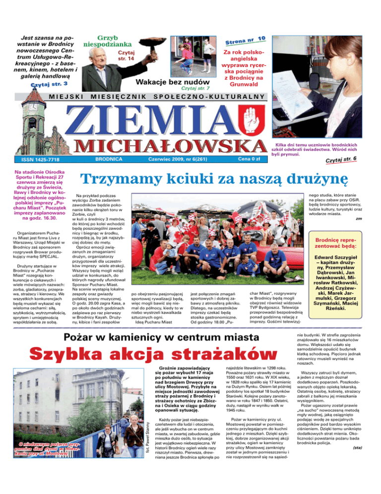 Grzyb niespodzianka Jest szansa na powstanie w Brodnicy nowoczesnego Centrum Usługowo-Rekreacyjnego - z basenem, kinem, hotelem i galerią handlową Strona Czytaj str. 14 Wakacje bez nudów Czytaj str. 3 Czytaj str. 7 MIEJSKI MIESIĘCZNIK nr 10 Za rok polskoangielska wyprawa rycerska pociągnie z Brodnicy na Grunwald S P O Ł E C Z N O - KU LT U R A L N Y Kilka dni temu uczniowie brodnickich szkół odebrali świadectwa. Wśród nich byli prymusi. BRODNICA ISSN 1425-7718 Na stadionie Ośrodka Sportu i Rekreacji 27 czerwca zmierzą się drużyny ze Świecia, Iławy i Brodnicy w kolejnej odsłonie ogólnopolskiej imprezy „Pucharu Miast”. Początek imprezy zaplanowano na godz. 16.30. Organizatorem Pucharu Miast jest firma Live z Warszawy, Urząd Miejski w Brodnicy zaś sponsorem rozgrywek Browar produkujący markę SPECJAL. Drużyny startujące w Brodnicy w „Pucharze Miast” rozegrają konkurencje o ciekawych i wiele mówiących nazwach: zorba, gladiatorzy, przeprawa, strażacy i kierowcy. We wszystkich konkurencjach będą musieli wykazać się wieloma cechami: siłą, szybkością, wytrzymałością, sprytem i umiejętnością współdziałania ze sobą. Czerwiec 2009, nr 6(261) Czytaj str. Cena 0 zł 6 Trzymamy kciuki za naszą drużynę Na przykład podczas wyścigu Zorba zadaniem zawodników będzie pokonanie kilku okrążeń toru w Zorbie, czyli w kuli o średnicy 3 metrów, do której po kolei wchodzić będą poszczególni zawodnicy i biegnąc w środku, rozpędzą ją, by jak najszybciej dobiec do mety. Oprócz emocji związanych ze zmaganiami drużyn, organizatorzy przygotowali dla uczestników imprezy wiele atrakcji. Wszyscy będą mogli wziąć udział w konkursach, do których nagrody ufundował Sponsor Pucharu Miast. Na scenie wystąpią lokalne zespoły oraz gwiazdy polskiej sceny muzycznej. O godz. 20.00 zagra Kasa, a po około dwóch godzinach zaśpiewa po raz pierwszy w Brodnicy Kayah. Drużyny, kibice i fani zespołów nego studia, które stanie na placu zabaw przy OSiR. będą brodniccy sportowcy, ludzie kultury, turystyki oraz włodarze miasta. zm Brodnicę reprezentować będą: po obejrzeniu pasjonującej sportowej rywalizacji będą, więc mogli bawić się niemal do północy, kiedy to w niebo wystrzeli kawalkada sztucznych ogni. Ideą Pucharu Miast jest połączenie zmagań sportowych i dobrej zabawy z atmosferą pikniku. Dlatego, na uczestników imprezy czekać będą stosika gastronomiczne. Od godziny 18.00 „Pu- char Miast”, rozgrywany w Brodnicy będą mogli obejrzeć również widzowie TVP Bydgoszcz. Telewizja przeprowadzi bezpośrednią ponad godzinną relację z imprezy. Gośćmi telewizyj- Pożar w kamienicy w centrum miasta O niedawnym pożarze przypomina ślad dymu w mieszkaniu przy ul. Mostowej fot. Paweł Stanny Szybka akcja strażaków Groźnie zapowiadający się pożar wybuchł 17 maja po południu w kamienicy nad brzegiem Drwęcy przy ulicy Mostowej. Przybyłe na miejsce jednostki zawodowej straży pożarnej z Brodnicy i strażacy ochotnicy ze Zbiczna i Osieka w ciągu godziny opanowali sytuację. najeździe litewskim w 1298 roku. Poważne pożary strawiły miasto w 1550 oraz 1631 roku. W XIX wieku, w 1828 roku spaliło się 17 kamienic na Dużym Rynku. Osiem lat później podobny los spotkał 18 budynków Starówki. Kolejne pożary zanotowano w roku 1847 i 1850. Ostatni, duży, nastąpił w wyniku walk w 1945 roku. Każdy pożar jest niebezpieczeństwem dla ludzi i otoczenia, ale jeśli wybucha on w centrum miasta, w zwartej zabudowie, gdzie mieszka dużo osób, to sytuacja jest wyjątkowo niebezpieczna. W historii Brodnicy ogień wiele razy niszczył miasto. Pierwsza, drewniana jeszcze Brodnica spłonęła po Pożar w kamienicy przy ul. Mostowej powstał w pomieszczeniu przylegającym do kuchni jednego z mieszkań. Dzięki szybkiej, dobrze zorganizowanej akcji strażaków, ogień w kamienicy przy ulicy Mostowej zamknięty został w jednym pomieszczeniu i nie rozprzestrzenił się na sąsied- Edward Szczygieł – kapitan drużyny, Przemysław Dąbrowski, Jan Iwankowski, Mirosław Ratkowski, Andrzej Czyżewski, Marek Jarmulski, Grzegorz Szymański, Maciej Rżeński. nie budynki. W strefie zagrożenia znajdowało się 16 mieszkańców domu. Większości udało się samodzielnie opuścić budynek klatką schodową. Pięcioro jednak ratownicy musieli wynieść na noszach. Wszyscy zatruci byli dymem, a jeden z mężczyzn doznał dodatkowo poparzeń. Poszkodowanych objęto opieką lekarską. Ostatnią osobę, kobietę, strażacy zabrali z balkonu jej mieszkania wysięgnikiem. Pożar ugaszony został prawie „na sucho” nowoczesną metodą mgły wodnej, jaką osiągnięto podając wodę ze specjalnych podajników pod bardzo wysokim ciśnieniem. Dzięki temu uniknięto dodatkowych strat mienia. Okoliczności powstania pożaru bada brodnicka policja. (sta) 2 MIEJSKI MIESIĘCZNIK S P O Ł E C Z N O - KU LT U R A L N Y nr 6 (261), czerwiec 2009 Wydarzenia List od prezydenta RP przeczytał wiceburmistrz Jarosław Radacz Pamiętaliśmy o tym szczególnym dniu 4 czerwca 2009 roku, w dwudziestą rocznicę pierwszych wolnych wyborów parlamentarnych w powojennej Polsce, odbyło się uroczyste spotkanie w sali wielkiej Pałacu Anny Wazówny. Podczas uroczystości zorganizowanej przez brodnicki samorząd zastępca burmistrza Jarosław Radacz odczytał okolicznościowy list Prezydenta RP, nauczyciel historii Radosław Stawski przedstawił krótki rys historyczny wydarzenia, dotyczący pierwszych wolnych wyborów w powojennej Polsce. Natomiast Miejski Chór Canto Grazioso wystąpił z minikoncertem pieśni i piosenek polskich. W czasie trwania uroczystości delegacja z Urzędu Miejskiego w Brodnicy składała kwiaty pod pomnikiem Jana Pawła II oddając w ten sposób ukłon wielkiemu Polakowi, którego działania pomogły rodakom odzyskać wiarę w możliwość dokonania zmian w socjalistycznej Polsce. zm Brodnica i region zagłosowały 23,74 proc. brodn