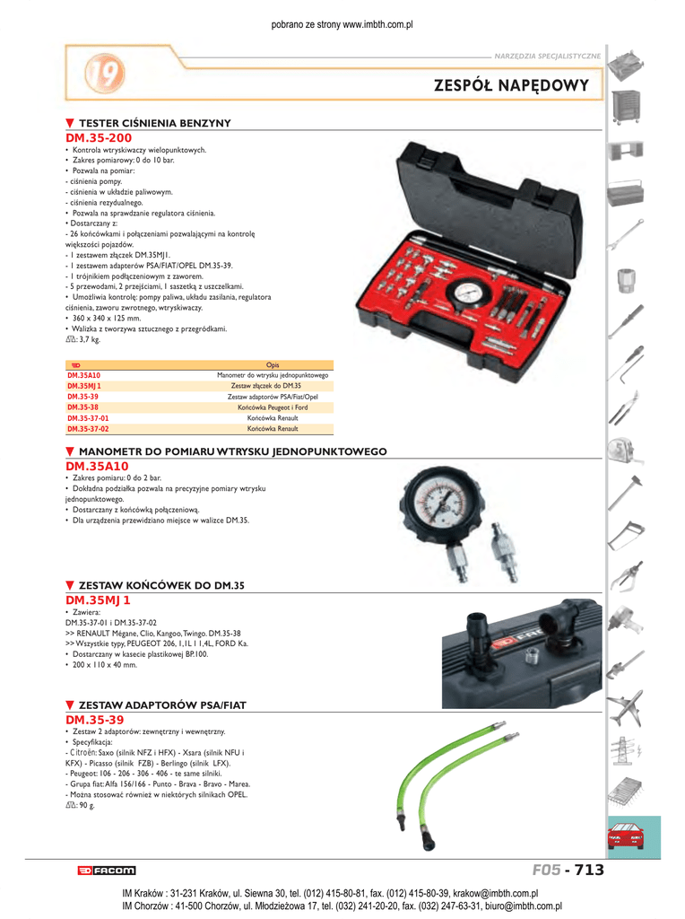 Section 19-1 GMP PL_noir 1/03/05 14:53 Page 713 pobrano ze strony www.imbth.com.pl NARZĘDZIA SPECJALISTYCZNE ZESPÓŁ NAPĘDOWY ▼ TESTER CIŚNIENIA BENZYNY DM.35-200 • Kontrola wtryskiwaczy wielopunktowych. • Zakres pomiarowy: 0 do 10 bar. • Pozwala na pomiar: - ciśnienia pompy. - ciśnienia w układzie paliwowym. - ciśnienia rezydualnego. • Pozwala na sprawdzanie regulatora ciśnienia. • Dostarczany z: - 26 końcówkami i połączeniami pozwalającymi na kontrolę większości pojazdów. - 1 zestawem złączek DM.35MJ1. - 1 zestawem adapterów PSA/FIAT/OPEL DM.35-39. - 1 trójnikiem podłączeniowym z zaworem. - 5 przewodami, 2 przejściami, 1 saszetką z uszczelkami. • Umożliwia kontrolę: pompy paliwa, układu zasilania, regulatora ciśnienia, zaworu zwrotnego, wtryskiwaczy. • 360 x 340 x 125 mm. • Walizka z tworzywa sztucznego z przegródkami. D: 3,7 kg. F DM.35A10 DM.35MJ1 DM.35-39 DM.35-38 DM.35-37-01 DM.35-37-02 Opis Manometr do wtrysku jednopunktowego Zestaw złączek do DM.35 Zestaw adaptorów PSA/Fiat/Opel Końcówka Peugeot i Ford Końcówka Renault Końcówka Renault ▼ MANOMETR DO POMIARU WTRYSKU JEDNOPUNKTOWEGO DM.35A10 • Zakres pomiaru: 0 do 2 bar. • Dokładna podziałka pozwala na precyzyjne pomiary wtrysku jednopunktowego. • Dostarczany z końcówką połączeniową. • Dla urządzenia przewidziano miejsce w walizce DM.35. ▼ ZESTAW KOŃCÓWEK DO DM.35 DM.35MJ1 • Zawiera: DM.35-37-01 i DM.35-37-02 >> RENAULT Mégane, Clio, Kangoo,Twingo. DM.35-38 >> Wszystkie typy, PEUGEOT 206, 1,1L I 1,4L, FORD Ka. • Dostarczany w kasecie plastikowej BP.100. • 200 x 110 x 40 mm. ▼ ZESTAW ADAPTORÓW PSA/FIAT DM.35-39 • Zestaw 2 adaptorów: zewnętrzny i wewnętrzny. • Specyfikacja: - Citroën: Saxo (silnik NFZ i HFX) - Xsara (silnik NFU i KFX) - Picasso (silnik FZB) - Berlingo (silnik LFX). - Peugeot: 106 - 206 - 306 - 406 - te same silniki. - Grupa fiat: Alfa 156/166 - Punto - Brava - Bravo - Marea. - Można stosować również w niektórych silnikach OPEL. D: 90 g. Katalog elektroniczny na www.facom.com F05 - 713 IM Kraków : 31-231 Kraków, ul. Siewna 30, tel. (012) 415-80-81, fax. (012) 415-80-39, [email protected] IM Chorzów : 41-500 Chorzów, ul. Młodzieżowa 17, tel. (032) 241-20-20, fax. (032) 247-63-31, [email protected]