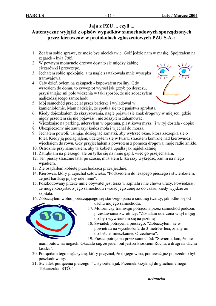 HARCUŚ - 11 - Luty / Marzec 2004 Jaja z PZU ... czyli ... Autentyczne wyjątki z opisów wypadków samochodowych sporządzonych przez kierowców w protokołach zgłoszeniowych PZU S.A. : 1. Zdałem sobie sprawę, że może być nieciekawie. Golf jedzie nam w maskę. Spojrzałem na zegarek - była 7:05. 2. W pewnym momencie drzewo dostało się między kabinę ciężarówki i przyczepę. 3. Jechałem sobie spokojnie, a tu nagle zaatakowała mnie wysepka tramwajowa. 4. Cały dzień byłem na zakupach - kupowałem rośliny. Gdy wracałem do domu, to żywopłot wyrósł jak grzyb po deszczu, przysłaniając mi pole widzenia w taki sposób, że nie zobaczyłem nadjeżdżającego samochodu. 5. Mój samochód przeleciał przez barierkę i wylądował w kamieniołomie. Mam nadzieję, że spotka się to z państwa aprobatą. 6. Kiedy dojeżdżałem do skrzyżowania, nagle pojawił się znak drogowy w miejscu, gdzie nigdy przedtem się nie pojawiał i nie zdążyłem zahamować. 7. Wjeżdżając na parking, uderzyłem w ogromną, plastikową mysz. (i w ryj dostała - dopis) 8. Ubezpieczony nie zauważył końca mola i wjechał do morza. 9. Jechałem powoli, usiłując dosięgnąć szmatki, aby wytrzeć okno, która zaczepiła się o fotel. Kiedy ją pociągnąłem, uderzyłem się w twarz, straciłem kontrolę nad kierownicą i wjechałem do rowu. Gdy przyjechałem z powrotem z pomocą drogową, moje radio znikło. 10. Ostrożnie przyhamowałem, aby ta kobieta upadła jak najdelikatniej. 11. Zatrąbiłam na pieszego, ale on tylko się na mnie gapił, więc go przejechałam. 12. Ten pieszy strasznie latał po szosie, musiałem kilka razy wykręcać, zanim na niego wpadłem. 13. Źle osądziłem kobietę przechodzącą przez jezdnię. 14. Kierowca, który przejechał człowieka: "Podszedłem do leżącego pieszego i stwierdziłem, że jest bardziej pijany ode mnie". 15. Poszkodowany przeze mnie obywatel jest teraz w szpitalu i nie chowa urazy. Powiedział, że mogę korzystać z jego samochodu i wziąć jego żonę aż do czasu, kiedy wyjdzie ze szpitala. 16. Zobaczyłem wolno poruszającego się starszego pana o smutnej twarzy, jak odbił się od dachu mojego samochodu. 17. Motorniczy tramwaju potrącona przez samochód podczas przestawiania zwrotnicy: "Zostałam uderzona w tył mojej osoby i wywróciłam się na jezdnię". 18. Świadek potrącenia pieszego: "Zobaczyłem, że w powietrzu na wysokości 2 do 3 metrów leci, znany mi osobiście, mieszkaniec Orzechowa". 19. Piesza potrącona przez samochód: "Stwierdziłam, że nie mam butów na nogach. Okazało się, że jeden but jest za kioskiem Ruchu, a drugi na dachu kiosku". 20. Potrąciłam tego mężczyznę, który przyznał, że to jego wina, ponieważ już poprzednio był poszkodowany. 21. Świadek potrącenia pieszego: "Usłyszałem jak Przemek krzyknął do głuchoniemego Tokarczuka: STÓJ". netmarko