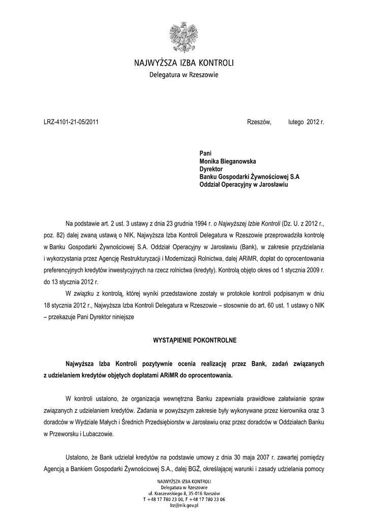 LRZ-4101-21-05/2011 Rzeszów, lutego 2012 r. Pani Monika Bieganowska Dyrektor Banku Gospodarki śywnościowej S.A Oddział Operacyjny w Jarosławiu Na podstawie art. 2 ust. 3 ustawy z dnia 23 grudnia 1994 r. o NajwyŜszej Izbie Kontroli (Dz. U. z 2012 r., poz. 82) dalej zwaną ustawą o NIK, NajwyŜsza Izba Kontroli Delegatura w Rzeszowie przeprowadziła kontrolę w Banku Gospodarki śywnościowej S.A. Oddział Operacyjny w Jarosławiu (Bank), w zakresie przydzielania i wykorzystania przez Agencję Restrukturyzacji i Modernizacji Rolnictwa, dalej ARiMR, dopłat do oprocentowania preferencyjnych kredytów inwestycyjnych na rzecz rolnictwa (kredyty). Kontrolą objęto okres od 1 stycznia 2009 r. do 13 stycznia 2012 r. W związku z kontrolą, której wyniki przedstawione zostały w protokole kontroli podpisanym w dniu 18 stycznia 2012 r., NajwyŜsza Izba Kontroli Delegatura w Rzeszowie – stosownie do art. 60 ust. 1 ustawy o NIK – przekazuje Pani Dyrektor niniejsze WYSTĄPIENIE POKONTROLNE NajwyŜsza Izba Kontroli pozytywnie ocenia realizację przez Bank, zadań związanych z udzielaniem kredytów objętych dopłatami ARiMR do oprocentowania. W kontroli ustalono, Ŝe organizacja wewnętrzna Banku zapewniała prawidłowe załatwianie spraw związanych z udzielaniem kredytów. Zadania w powyŜszym zakresie były wykonywane przez kierownika oraz 3 doradców w Wydziale Małych i Średnich Przedsiębiorstw w Jarosławiu oraz przez doradców w Oddziałach Banku w Przeworsku i Lubaczowie. Ustalono, Ŝe Bank udzielał kredytów na podstawie umowy z dnia 30 maja 2007 r. zawartej pomiędzy Agencją a Bankiem Gospodarki śywnościowej S.A., dalej BGś, określającej warunki i zasady udzielania pomocy finansowej dla rolnictwa polegającej m.in. na stosowaniu dopłat do oprocentowania kredytów, udzielonych na sfinansowanie części kosztów inwestycji w rolnictwie. NajwyŜsza Izba Kontroli pozytywnie ocenia działania informacyjne Banku, skierowane do potencjalnych kredytobiorców. O moŜliwości i warunkach zaciągnięcia kredytów, klienci informowani byli w Banku, w siedzibie klienta, podczas spotkań w Ośrodku Doradztwa Rolniczego i Urzędach Gmin. W czasie masowych imprez wiejskich (doŜynki, Święto Ziemi) rozdawane były ulotki i broszury informacyjne. Ponadto informacje o dostępnych kredytach zamieszczane były na stronie internetowej BGś oraz udzielane poprzez infolinię. Ustalono, Ŝe w latach 2009-2011 do Banku wpłynęło 71 wniosków kredytowych, które zostały pozytywnie rozpatrzone. Jeden klient, pomimo pozytywnego rozpatrzenia wniosku zrezygnował z podpisania umowy kredytowej. Udzielonych zostało natomiast 70 kredytów na łączną wartość 11.836,9 tys. zł, w tym: w 2009 r. - 27 kredytów na wartość 2.824 tys. zł, w 2010 r. – 28 kredytów na wartość 6.211,8 tys. zł i w 2011 r. (III kwartały) – 15 kredytów na wartość 2.801,1 tys. zł. W poszczególnych liniach kredytowych w kontrolowanym okresie udzielonych zostało: w linii nKZ „zakup uŜytków rolnych” - 41 kredytów na wartość 6.855,4 tys. zł, w linii nMR „na utworzenie lub urządzenie gospodarstw rolnych przez osoby, które nie ukończyły 40 roku Ŝycia” - 24 kredyty na wartość 4.536,2 tys. zł, w linii nIP „realizacja inwestycji w gospodarstwach rolnych, działach specjalnych produkcji rolnej i przetwórstwie produktów rolnych” 3 kredyty na wartość 293 tys. zł, w linii nNT „realizacji inwestycji w zakresie nowych technologii produkcji w rolnictwie zapewniających wysoką jakość produktu” - 2 kredyty na wartość 152,3 tys. zł. Dopłaty ARiMR w latach 2009 – 2011 (III kwartał), do oprocentowania udzielonych przez Bank kredytów wyniosły łącznie 2.329 tys. zł, z tego: w 2009 r. – 734 tys. zł, w 2010 r. – 692 tys. zł oraz w 2011 r. (III kwartały) – 903 tys. zł. W ocenie NajwyŜszej Izby Kontroli, w Banku były przestrzegane przepisy dotyczące procedur i warunków udzielania kredytów. Analiza dokumentacji związanej z udzielonymi przez Bank 24 kredytami na łączną wartość 8.615,8 tys. zł wykazała, Ŝe Bank przy ich udzielaniu stosował przepisy rozporządzenia Rady Ministrów z dnia 22 stycznia 2009 r. w sprawie realizacji niektórych działań Agencji Restrukturyzacji i Modernizacji Rolnictwa (Dz. U. z 2009 r. Nr 22, poz. 121 ze zm.). Przestrzegane były równieŜ postanowienia wyŜej cyt. umowy z dnia 30 maja 2007 r. oraz zasady postępowania obowiązujące w BGś S.A., w procesie zawierania z klientami instytucjonalnymi transakcji kredytowych określone w „Podręczniku kredytowym klientów instytucjonalnych” z dnia 11 maja 2006 r. Udzielając 24 kredytów będących przedmiotem analizy, Bank naliczał kredytobiorcom prowizję w kwotach nie przekraczających 2% wartości udzielonego kredytu. Określone w umowach kredytowych środki własne, kredytobiorcy wnieśli i udokumentowali przed uruchomieniem przez Bank środków kredytowych. Do składanych wniosków kredytowych, kredytobiorcy załączali plany przedsięwzięć, na które były zaciągane kredyty. Nie stwierdzono, aby w czasie składania wniosków kredytowych przez kredytobiorców korzystających z linii 2 kredytowej nMR, ukończyli oni 40 rok Ŝycia. Ustalono równieŜ, Ŝe określone w umowach kredytowych kwoty udzielonych kredytów nie przekraczały: 80% wartości nakładów inwestycyjnych na gospodarstwo rolne lub nakładów na realizację w gospodarstwach rolnych przedsięwzięć, 90% wartości zakupu nieruchomości rolnych przeznaczonych na utworzenie gospodarstwa rodzinnego lub powiększenie takiego gospodarstwa oraz 70% wartości nakładów inwestycyjnych w przetwórstwie rolno-spoŜywczym lub na działy specjalne produkcji rolnej. Nie stwierdzono przypadków, by kredytem z linii kredytowej nKZ „na zakup gruntów”, sfinansowano zakup działek od współmałŜonka kredytobiorcy, jak równieŜ, by do dnia 31.12.2011 r. przedmiotowe grunty zostały sprzedane. Ustalono, Ŝe w 5 przypad