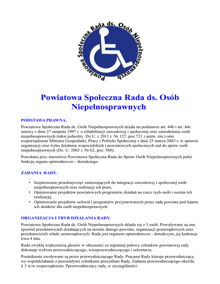 Powiatowa Społeczna Rada ds. Osób Niepełnosprawnych PODSTAWA PRAWNA. Powiatowa Społeczna Rada ds. Osób Niepełnosprawnych działa na podstawie art. 44b i art. 44c ustawy z dnia 27 sierpnia 1997 r. o rehabilitacji zawodowej i społecznej oraz zatrudnieniu osób niepełnosprawnych (tekst jednolity Dz.U. z 2011 r. Nr 127, poz.721 z późn. zm.) oraz rozporządzenia Ministra Gospodarki, Pracy i Polityki Społecznej z dnia 25 marca 2003 r. w sprawie organizacji oraz trybu działania wojewódzkich i powiatowych społecznych rad do spraw osób niepełnosprawnych (Dz. U. 2003 r. Nr 62, poz. 560). Powołana przy starostwie Powiatowa Społeczna Rada do Spraw Osób Niepełnosprawnych pełni funkcję organu opiniodawczo - doradczego. ZADANIA RADY. • Inspirowanie przedsięwzięć zmierzających do integracji zawodowej i społecznej osób niepełnosprawnych oraz realizacji ich praw, • Opiniowanie projektów powiatowych programów działań na rzecz tych osób i ocenia ich realizację, • Opiniowanie projektów uchwał i programów przyjmowanych przez radę powiatu pod kątem ich skutków dla osób niepełnosprawnych. ORGANIZACJA I TRYB DZIAŁANIA RADY. Powiatowa Społeczna Rada ds. Osób Niepełnosprawnych składa się z 5 osób. Powoływane są one spośród przedstawicieli działających na terenie danego powiatu, organizacji pozarządowych oraz przedstawicieli władz samorządowych. Rada jest organem opiniodawczo - doradczym, jej kadencja trwa 4 lata. Rada zwykłą większością głosów w obecności co najmniej połowy członków powiatowej rady dokonuje wyboru przewodniczącego, wiceprzewodniczącego i sekretarza. Posiedzenia zwoływane są przez przewodniczącego Rady. Pracami Rady kieruje przewodniczący, we współdziałaniu z pozostałymi członkami prezydium Rady. Zadania przewodniczącego określa § 3 w/w rozporządzenia. Pprzewodniczący rady, w szczególności: 1. 2. 3. 4. ustala przedmiot i termin posiedzeń rady; przewodniczy posiedzeniom rady oraz posiedzeniom jej prezydium; reprezentuje radę w stosunku do innych organów i instytucji; zaprasza na posiedzenia rady przedstawicieli nauki oraz przedstawicieli organów i instytucji niereprezentowanych w radzie; 5. inicjuje i organizuje prace rady. Posiedzenia powiatowej rady odbywają się co najmniej raz na kwartał. W czasie spotkań członkowie poruszają tematykę związaną w szczególności z problemami dotyczącymi integracji zawodowej i społecznej osób niepełnosprawnych, ich edukacji oraz sytuacji życiowej a także realizacji praw osób niepełnosprawnych. Na posiedzenia mogą być zapraszani, w celu prezentacji stanowiska w omawianych sprawach, przedstawiciele nauki oraz innych organów, organizacji i instytucji niereprezentowanych w Powiatowej Radzie. Każdorazowo po spotkaniu jest spisany protokół. Powiatowa Rada wyraża swoją opinie w sprawach należących do zakresu jej działania, w formie uchwały lub odpowiedniego zapisu w protokole. Głosowania są jawne. Zebrania członków Społecznej Rady są przygotowywane w imieniu Starosty przez Wydział Spraw Obywatelskich i Powiatowe Centrum Pomocy Rodzinie w Bełchatowie. SKŁAD POWIATOWEJ SPOŁECZNEJ RADY DS. OSÓB NIEPEŁNOSPRAWNYCH WEDŁUG PEŁNIONYCH FUNCKJI. Członkowie Powiatowej Społecznej Rady ds. Osób Niepełnosprawnych przy Starostwie Powiatowym w Bełchatowie na lata 2011-2015 zostali powołani Zarządzeniem nr 58/2011 Starosty Bełchatowskiego z dnia 01 czewca 2011 r. W skład Rady wchodzą: • PRZEWODNICZĄCA – Marzena Polak • WICEPRZEWODNICZĄCY – Krzysztof Kamieniak • SEKRETARZ – Agnieszka Mysłowska • CZŁONEK – Jolanta Gandziarek • CZŁONEK – Zofia Ligocka KONTAKT. Uwagi, wnioski i zapytania do członków Powiatowej Społecznej Rady do Spraw Osób Niepełnosprawnych przy Staroście Bełchatowskim prosimy kierować na adres: POWIATOWA SPOŁECZNA RADA DO SPRAW OSÓB NIEPEŁNOSPRAWNYCH PRZY STAROŚCIE BEŁCHATOWSKIM ul. Pabianicka 1 97-400 Bełchatów (pok. 401) Tel. 44 635 86 87 E mail: [email protected]