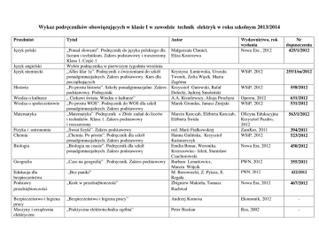 Wykaz podręczników obowiązujących w klasie I w zawodzie technik elektryk w roku szkolnym 2013/2014 Przedmiot Tytuł Autor Język polski „Ponad słowami”. Podręcznik do języka polskiego dla liceum i technikum. Zakres podstawowy i rozszerzony. Klasa 1. Część 1 Wybór podręcznika w pierwszym tygodniu września „Alles klar 1a”. Podręcznik z ćwiczeniami do szkół ponadgimnazjalnych. Zakres podstawowy. Kurs dla początkujących „Po prostu historia”. Szkoły ponadgimnazjalne. Zakres podstawowy. Podręcznik „ Ciekawi świata. Wiedza o kulturze” „Po prostu WOS”. Podręcznik do WOS dla szkól ponadgimnazjalnych. Zakres podstawowy „Matematyka”. Podręcznik + Zbiór zadań do liceów i techników. Klasa 1. Zakres podstawowy i rozszerzony „Świat fizyki”. Zakres podstawowy „Chemia. Po prostu”. Podręcznik dla szkół ponadgimnazjalnych. Zakres podstawowy „Biologia na czasie”. Podręcznik dla szkół ponadgimnazjalnych. Zakres podstawowy Małgorzata Chmiel, Eliza Kostrzewa Język angielski Język niemiecki Historia Wiedza o kulturze Wiedza o społeczeństwie Matematyka Fizyka i astronomia Chemia Biologia Geografia „Czas na geografię” . Podręcznik. Zakres podstawowy Edukacja dla bezpieczeństwa Podstawy przedsiębiorczości „Bez paniki” Bezpieczeństwo i higiena pracy Maszyny i urządzenia elektryczne „Krok w przedsiębiorczość” Krystyna Łuniewska, Urszula Tworek, Zofia Wąsik. Maria Zagórna Krzysztof Gutowski, Rafał Dolecki, Jędrzej Smoleński A.A. Kisielewscy, Alicja Prochyra Marek Grondas, Janusz Żmijski Marcin Kurczab, Elżbieta Kurczab, Elżbieta Świda red. Marii Fiałkowskiej Hanna Gulińska, Krzysztof Kuśmierczyk Emilia Bonar, Weronika Krzeszowiec- Jeleń, Stanisław Czachorowski Barbara Lenartowicz, Marcin Wójcik M. Borowiecki, Z. Pytasz, E. Regała Zbigniew Makieła, Tomasz Rachwał Wydawnictwo, rok wydania Nowa Era , 2012 Nr dopuszczenia 425/1/2012 WSiP, 2012 255/1/m/2012 WSiP, 2012 558/2012 Operon, 2012 WSiP, 2012 631/2012 531/2012 Oficyna Edukacyjna Krzysztof Pazdro, 2012 ZamKor, 2011 WSiP, 2012 563/1/2012 394/2011 523/2012 Nowa Era, 2012 450/2012 PWN, 2012 355/2011 PWN, 2012 422/2012 Nowa Era, 2012 467/2012 „Bezpieczeństwo i higiena pracy” Andrzej Komosa Ekonomik, 2012 - „Praktyczna elektrotechnika ogólna” Peter Bastian Rea, 2002 - Elektrotechnika i elektronika Technologia i materiałoznawstwo elektryczne Religia „Podstawy elektrotechniki i elektroniki dla elektryków” „Zbiór zadań z elektrotechniki” „ Elektrotechnika” „Technologia i materiałoznawstwo elektryczne” „Być świadkiem zmartwychwstałego w kościele”. Podręcznik do nauczania religii w klasach 1 liceum i technikum Andrzej Chochowski WSiP, 2008 - Aleksy Markiewicz Stanisław Bolkowski Stefan Okoniewski WSiP, dowolny - red. Ks. P. Pierzchała, WSiP, 2012 WSiP, dowolny - Wydawnictwo Katechetyczne, 2012 -