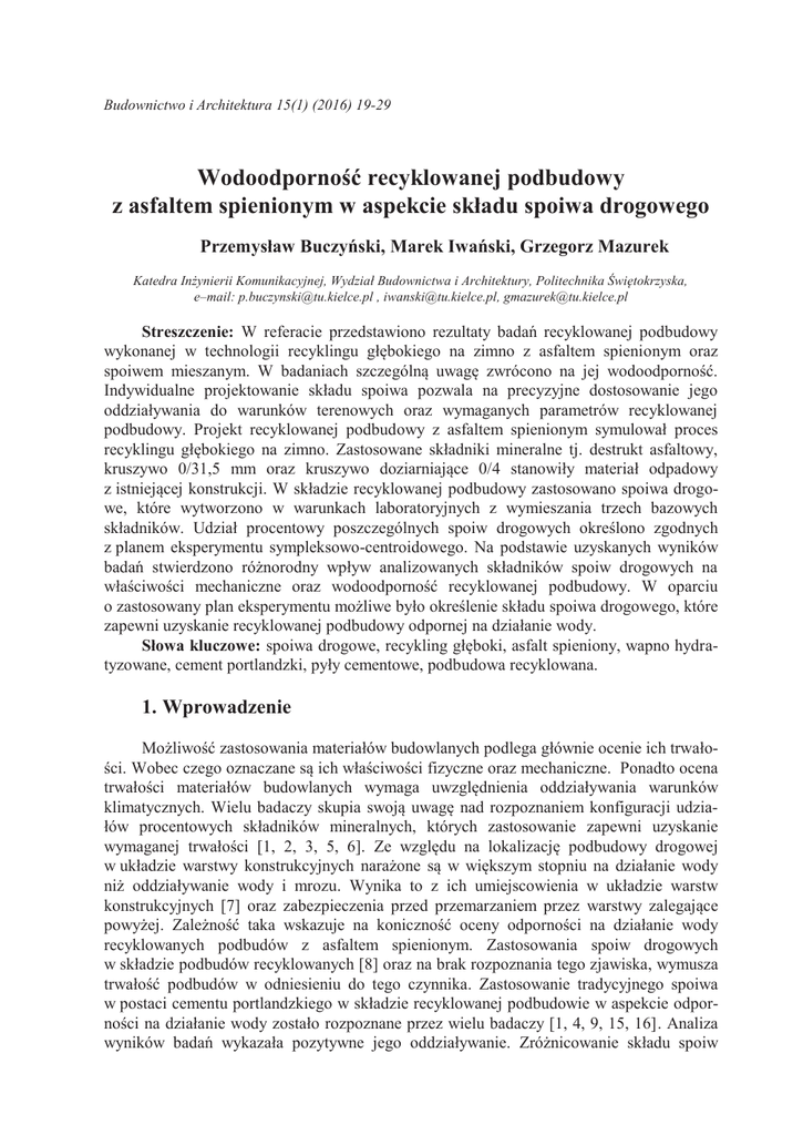 Budownictwo i Architektura 15(1) (2016) 19-29 Wodoodporność recyklowanej podbudowy z asfaltem spienionym w aspekcie składu spoiwa drogowego Przemysław Buczyński, Marek Iwański, Grzegorz Mazurek Katedra Inżynierii Komunikacyjnej, Wydział Budownictwa i Architektury, Politechnika Świętokrzyska, e–mail: [email protected] , [email protected], [email protected] Streszczenie: W referacie przedstawiono rezultaty badań recyklowanej podbudowy wykonanej w technologii recyklingu głębokiego na zimno z asfaltem spienionym oraz spoiwem mieszanym. W badaniach szczególną uwagę zwrócono na jej wodoodporność. Indywidualne projektowanie składu spoiwa pozwala na precyzyjne dostosowanie jego oddziaływania do warunków terenowych oraz wymaganych parametrów recyklowanej podbudowy. Projekt recyklowanej podbudowy z asfaltem spienionym symulował proces recyklingu głębokiego na zimno. Zastosowane składniki mineralne tj. destrukt asfaltowy, kruszywo 0/31,5 mm oraz kruszywo doziarniające 0/4 stanowiły materiał odpadowy z istniejącej konstrukcji. W składzie recyklowanej podbudowy zastosowano spoiwa drogowe, które wytworzono w warunkach laboratoryjnych z wymieszania trzech bazowych składników. Udział procentowy poszczególnych spoiw drogowych określono zgodnych z planem eksperymentu sympleksowo-centroidowego. Na podstawie uzyskanych wyników badań stwierdzono różnorodny wpływ analizowanych składników spoiw drogowych na właściwości mechaniczne oraz wodoodporność recyklowanej podbudowy. W oparciu o zastosowany plan eksperymentu możliwe było określenie składu spoiwa drogowego, które zapewni uzyskanie recyklowanej podbudowy odpornej na działanie wody. Słowa kluczowe: spoiwa drogowe, recykling głęboki, asfalt spieniony, wapno hydratyzowane, cement portlandzki, pyły cementowe, podbudowa recyklowana. 1. Wprowadzenie Możliwość zastosowania materiałów budowlanych podlega głównie ocenie ich trwałości. Wobec czego oznaczane są ich właściwości fizyczne oraz mechaniczne. Ponadto ocena trwałości materiałów budowlanych wymaga uwzględnienia oddziaływania warunków klimatycznych. Wielu badaczy skupia swoją uwagę nad rozpoznaniem konfiguracji udziałów procentowych składników mineralnych, których zastosowanie zapewni uzyskanie wymaganej trwałości [1, 2, 3, 5, 6]. Ze względu na lokalizację podbudowy drogowej w układzie warstwy konstrukcyjnych narażone są w większym stopniu na działanie wody niż oddziaływanie wody i mrozu. Wynika to z ich umiejscowienia w układzie warstw konstrukcyjnych [7] oraz zabezpieczenia przed przemarzaniem przez warstwy zalegające powyżej. Zależność taka wskazuje na koniczność oceny odporności na działanie wody recyklowanych podbudów z asfaltem spienionym. Zastosowania spoiw drogowych w składzie podbudów recyklowanych [8] oraz na brak rozpoznania tego zjawiska, wymusza trwałość podbudów w odniesieniu do tego czynnika. Zastosowanie tradycyjnego spoiwa w postaci cementu portlandzkiego w składzie recyklowanej podbudowie w aspekcie odporności na działanie wody zostało rozpoznane przez wielu badaczy [1, 4, 9, 15, 16]. Analiza wyników badań wykazała pozytywne jego oddziaływanie. Zróżnicowanie składu spoiw 20 Przemysław Buczyński, Marek Iwański, Grzegorz Mazurek drogowych wynikający z wprowadzenia w jego składzie np. popiołów lotnych oraz pyłów cementowych [10, 11, 12], może w odmiennym stopniu wpływać na właściwości recyklowanej podbudowy. Zarówno w zakresie właściwości fizyczno-mechaniczne oraz odporności na działanie wody. W związku z powyższym niezbędne wydaje się określenie odporności na działanie wody recyklowanej podbudowy z asfaltem spienionym w aspekcie rodzaju składników spoiw drogowych. 2. Obiekt badań Przedmiotem badań w aspekcie wpływu składników spoiwa na wodoodporność recyklowanej podbudowy z asfaltem spienionym jest zaprojektowana mieszanka mineralnospoiwowa zgodnie z kryterium dobrego uziarnienia określonego w wytycznych [13, 14]. Próbki zagęszczono w formach Marshalla dla wilgotności optymalnej równej 5,3% w efekcie czego uzyskano maksymalną gęstość szkieletu mineralno-spoiwowego równą 2,227 Mg/m3. Wilgotność optymalną określono za pomocą metody Proctora wg PN-EN 13286-2. Do wytworzenia piany asfaltowej wykorzystano asfalt drogowy o przedziale penetracji 50/70 w ilości 3%. Natomiast spoiwo w recyklowanej podbudowie stanowiło 2,5% mieszanki mineralnej. 2.1. Projekt mieszanki mineralno-spoiwowej z asfaltem spienionym Projekt recyklowanej mieszanki podbudowy obejmował zastosowanie materiałów mineralnych, których zestawienie pozwoliło na symulację procesu recyklingu głębokiego na zimno w technologii "in situ". W recyklowanej mieszance zastosowano cztery składniki mineralne tj.: destrukt asfaltowy (RAP) o uziarnieniu 0/31,5 mm w ilości 50% (m/m), kruszywo naturalne wapienne z istniejącej podbudowy o uziarnieniu 0/31,5 mm w ilości 20%(m/m), kruszywo naturalne dolomitowe o ciągłym uziarnieniu 0/4 mm w ilości 22%(m/m) oraz pyły mineralne pochodzenia gabrowego w ilości 5% (m/m). Należy dodać, że zastosowanie pyłów mineralnych podyktowane było uzyskaniem wymaganej zawartości frakcji wypełniającej (poniżej 0,063 mm), co w przypadku technologii recyklingu głębokiego na zimno z asfaltem spienionym jest pożądane. W trakcie spieniania piana asfaltowa łączy się z drobnoziarnistym materiałem tworząc "zbrojenie rozproszone" z wytworzonego w ten sposób mastyksu [13, 17]. Możliwość zastosowania pyłów mineralnych w składzie recyklowanej podbudowy z asfaltem spienionym została opisana szczegółowo w pracach [18,19]. 2.2. Właściwości asfaltu spienionego W technologii recyklingu głębokiego z asfaltem spienionym wymagane jest zastosowanie takiego typu asfaltu, dla którego uzyskuje się rekomendowane parametry spieniania. Właściwości te oceniane są na podstawie wskaźnika ekspansji ERm (maximum Expans