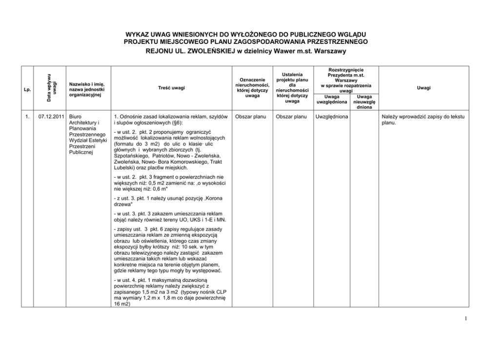 Lp. 1. Data wpływu uwagi WYKAZ UWAG WNIESIONYCH DO WYŁOŻONEGO DO PUBLICZNEGO WGLĄDU PROJEKTU MIEJSCOWEGO PLANU ZAGOSPODAROWANIA PRZESTRZENNEGO REJONU UL. ZWOLEŃSKIEJ w dzielnicy Wawer m.st. Warszawy Nazwisko i imię, nazwa jednostki organizacyjnej 07.12.2011 Biuro Architektury i Planowania Przestrzennego Wydział Estetyki Przestrzeni Publicznej Treść uwagi 1. Odnośnie zasad lokalizowania reklam, szyldów i slupów ogłoszeniowych (§6): Oznaczenie nieruchomości, której dotyczy uwaga Ustalenia projektu planu dla nieruchomości której dotyczy uwaga Rozstrzygnięcie Prezydenta m.st. Warszawy w sprawie rozpatrzenia uwagi Uwaga Uwaga uwzględniona nieuwzglę dniona Obszar planu Obszar planu Uwzględniona Uwagi Należy wprowadzić zapisy do tekstu planu. - w ust. 2. pkt. 2 proponujemy ograniczyć możliwość lokalizowania reklam wolnostojących (formatu do 3 m2) do ulic o klasie· ulic głównych i wybranych zbiorczych (tj. Szpotańskiego, Patriotów, Nowo - Zwoleńska, Zwoleńska, Nowo- Bora Komorowskiego, Trakt Lubelski) oraz plac6w miejskich. - w ust. 2. pkt. 3 fragment o powierzchniach nie większych niż: 0,5 m2 zamienić na: ,o wysokości nie większej niż: 0,6 m" - z ust. 3. pkt. 1 należy usunąć pozycję ,Korona drzewa" - w ust. 3. pkt. 3 zakazem umieszczania reklam objąć należy również tereny UO, UKS i 1-E i MN. - zapisy ust. 3 pkt. 6 zapisy regulujące zasady umieszczania reklam ze zmienną ekspozycją obrazu lub oświetlenia, którego czas zmiany ekspozycji byłby krótszy niż: 10 sek. w tym obrazu telewizyjnego należy zastąpić zakazem umieszczania takich reklam lub wskazać konkretne miejsca na terenie objętym planem, gdzie reklamy tego typu mogły by występować. - w ust. 4. pkt. 1 maksymalną dozwoloną powierzchnię reklamy należy zwiększyć z zapisanego 1,5 m2 na 3 m2 (typowy nośnik CLP ma wymiary 1,2 m x 1,8 m co daje powierzchnię 16 m2) 1 - do ust. 6 należy dodać zapis, że reklamy na budynkach powinny być umieszczane wyłącznie na obiektach posiadających funkcję usługową. 2. Odnośnie zasad lokalizowania ogrodzeń (§7) -w ust. 2. pkt. 5 sugerujemy aby zapis mówiący o obowiązku stosowania ogrodzeń ażurowych od wysokości 0,6 m od poziomu gruntu zastąpić sformułowaniem określającym jaka procentowa cześć ogrodzenia ma składać się z części pełnych, a jaka z ażurowych (np. nie mniej niż: 60% części ażurowych). Obecny zapis uniemożliwia w praktyce tworzenie slupków, czy pełnych narożników ogrodzeń. - w ust. 3. Wykreślić należy pkt. 4 3. Odnośnie zasad lokalizowania i kształtowania kiosków (par. 10 ust. 9) - w ust. 9 pkt. 1 zapis „ w sąsiedztwie jednego przystanku dopuszcza się lokalizowanie nie więcej niż 2 kiosków o jednakowej architekturze i wystroju w odległości nie większej niż 10 m od przystanku” należy zamienić na „w sąsiedztwie jednego przystanku dopuszcza się lokalizowanie nie więcej niż 1 kiosku w odległości nie większej niż 50 m od znaku D15 lub D17” Sugestia by na rysunku planu wyznaczyć konkretne miejsca dopuszczalnych lokalizacji kiosków. 4. Odnośnie zasad kolorystyki budynków Propozycja wprowadzenia zapisu dot. Kolorystyki elewacji w brzmieniu: „Na powierzchniach tynkowanych i wykonanych z betonu barwionego obowiązuje stosowanie kolorów wg. Systemu NCS o odcieniach posiadających do 20% domieszki czerni oraz nie przekraczające 20% chromatyczności barwy. Dopuszcza się stosowanie odcieni spoza wyznaczonych przedziałów wyłącznie na fragmentach ścian budynku, nie przekraczających 20% powierzchni danej elewacji. Obowiązek określania kolorów w oparciu o ww. system nie dotyczy materiałów elewacyjnych w kolorach dla nich naturalnych - np. miedź, stal nierdzewna , ceramika, szkło 2 Zapis można uzupełnić o określenie dopuszczalnych przedziałów kolorystycznych w oparciu o krąg kolorów systemu NCS. Należy wprowadzić definicję słownikową systemu NCS (do par. 2 projektu planu) uzupełnioną o wyjaśnienie, że dwie pierwsze cyfry z zapisu numerycznego barwy świadczą o procentowej domieszce czerni, zaś dwie kolejne o stopniu chromatyczności. 2. 07.12.2011 Andrzej Pawłowski Wniosek o zatoczkę dojazdowo parkingową wzdłuż budynku o nr 116 gdyż wg. nowych planów nie ma możliwości dojazdu klienta i dostawców. Dostawy typu paletowego. ul. Zwoleńska 116 ob. 3-11-55 dz. ew. 17/1 f9.1 MW/MN/U Nieuwzglę dniona Ulica Zwoleńska KDG jest planowana od wielu lat jako element Trasy Mostu na Zaporze – drogi o charakterze dzielnicowym łączącej Wawer z terenami po zachodniej stronie Wisły. Została ona wyznaczona jako droga główna w Studium uwarunkowań i kierunków zagospodarowania przestrzennego m.st . Warszawy. Rozporządzenie w sprawie warunków technicznych, jakim powinny odpowiadać drogi i ich usytuowanie określa najmniejszą szerokość w liniach rozgraniczających ulicy głównej o przekroju dwujezdniowym wynoszącą 35m. W wyjątkowych wypadkach można tę szerokość zmniejszyć, dlatego w projekcie planu przyjęto dla ulicy 5 KDG od 30,5m do 34,5m (z uwagi na istniejące zagospodarowanie. Plan, z projektem ulicy Zwoleńskiej jedynie w przedstawionej formie, uzyskał niezbędne uzgodnienia. Plan nie ustala dokładnego przekroju ulicy; krawędzie jezdni na rysunku planu są informacją, a nie ustaleniem planu. Dla ul. Zwoleńskiej 5KDG nie ustala się minimalnej powierzchni biologicznie czynnej ani konieczności wykonania pasa zieleni - określi to projekt drogowy. 3 3. 13.12.2011 Bożena Kałuska Prośba o zwrócenie uwagi na dom przy granicy drogi. ob. 3.13.39 c2.1MN/U dz. ew. 7/1 2KDL Uwzględniona Zawęzić linię rozgraniczającą ul. Zwoleńskiej 2 KDL na wysokości dz. ew. nr 6/1 i 7/1 do granicy dz. ew. nr 7/1. Uwzględniona częściowo W tekście planu, w par. 14 ust. 6 dodać pkt 10 o następującej treści: ustala się skablowanie istniejących napowietrznych linii o napięciu 110kV w liniach rozgraniczających ulic: B
