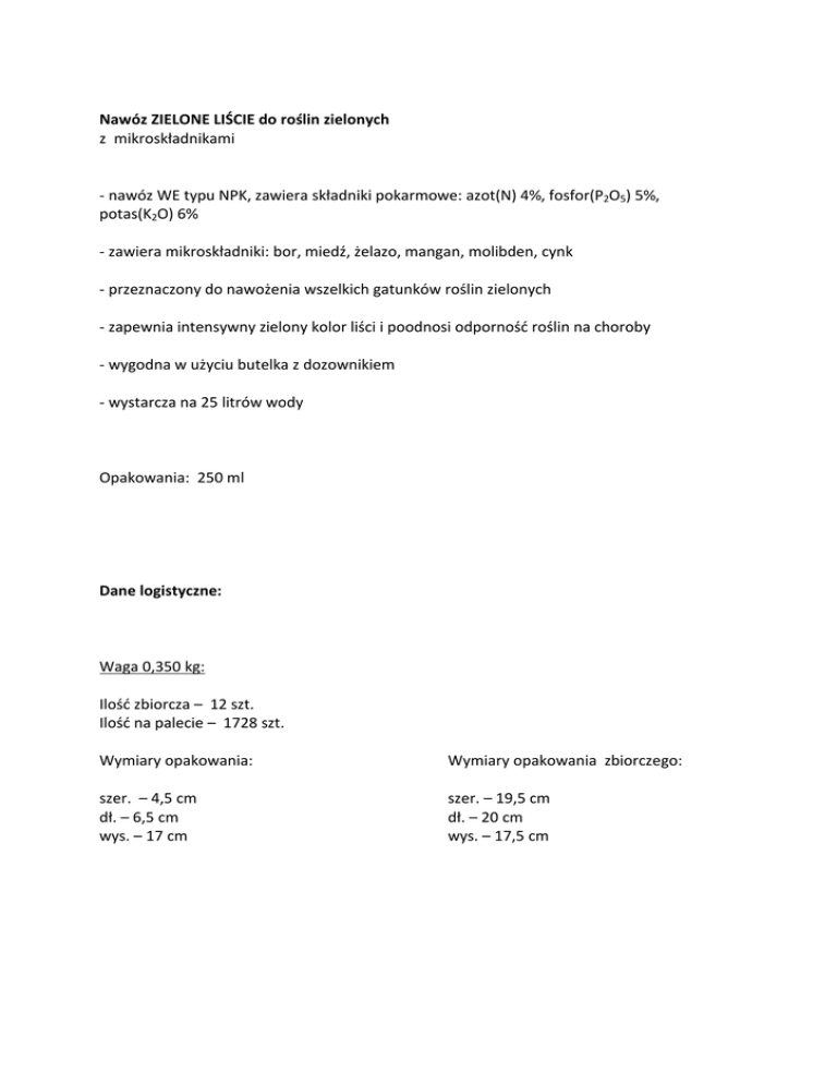 Nawóz ZIELONE LIŚCIE do roślin zielonych z mikroskładnikami - nawóz WE typu NPK, zawiera składniki pokarmowe: azot(N) 4%, fosfor(P2O5) 5%, potas(K2O) 6% - zawiera mikroskładniki: bor, miedź, żelazo, mangan, molibden, cynk - przeznaczony do nawożenia wszelkich gatunków roślin zielonych - zapewnia intensywny zielony kolor liści i poodnosi odporność roślin na choroby - wygodna w użyciu butelka z dozownikiem - wystarcza na 25 litrów wody Opakowania: 250 ml Dane logistyczne: Waga 0,350 kg: Ilość zbiorcza – 12 szt. Ilość na palecie – 1728 szt. Wymiary opakowania: Wymiary opakowania zbiorczego: szer. – 4,5 cm dł. – 6,5 cm wys. – 17 cm szer. – 19,5 cm dł. – 20 cm wys. – 17,5 cm
