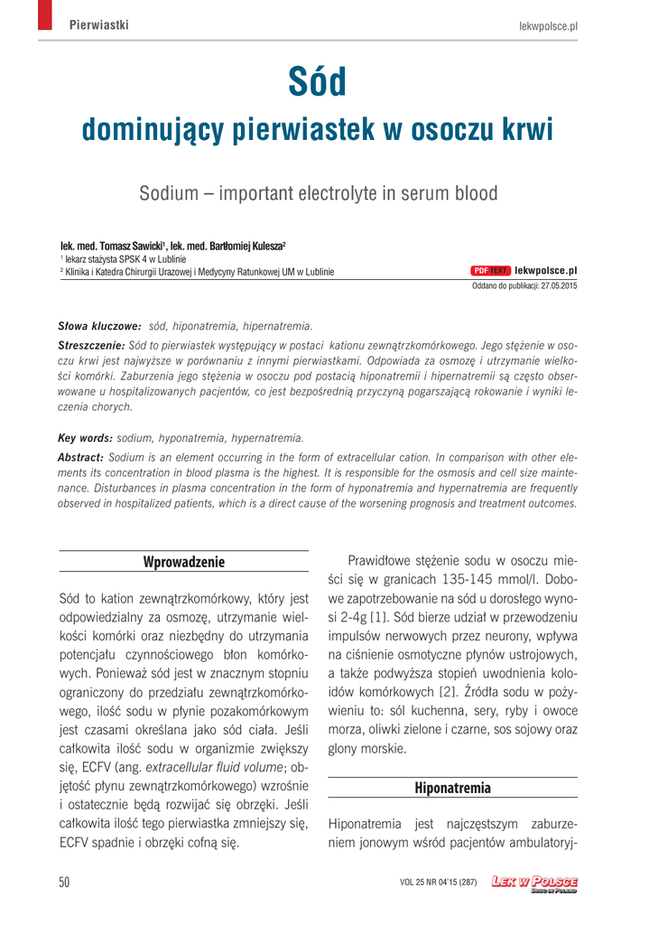 Pierwiastki lekwpolsce.pl Sód dominujący pierwiastek w osoczu krwi Sodium – important electrolyte in serum blood lek. med. Tomasz Sawicki1, lek. med. Bartłomiej Kulesza2 1 2 lekarz stażysta SPSK 4 w Lublinie Klinika i Katedra Chirurgii Urazowej i Medycyny Ratunkowej UM w Lublinie PDF TEXT lekwpolsce.pl Oddano do publikacji: 27.05.2015 Słowa kluczowe: sód, hiponatremia, hipernatremia. Streszczenie: Sód to pierwiastek występujący w postaci kationu zewnątrzkomórkowego. Jego stężenie w osoczu krwi jest najwyższe w porównaniu z innymi pierwiastkami. Odpowiada za osmozę i utrzymanie wielkości komórki. Zaburzenia jego stężenia w osoczu pod postacią hiponatremii i hipernatremii są często obserwowane u hospitalizowanych pacjentów, co jest bezpośrednią przyczyną pogarszającą rokowanie i wyniki leczenia chorych. Key words: sodium, hyponatremia, hypernatremia. Abstract: Sodium is an element occurring in the form of extracellular cation. In comparison with other elements its concentration in blood plasma is the highest. It is responsible for the osmosis and cell size maintenance. Disturbances in plasma concentration in the form of hyponatremia and hypernatremia are frequently observed in hospitalized patients, which is a direct cause of the worsening prognosis and treatment outcomes. Wprowadzenie Sód to kation zewnątrzkomórkowy, który jest odpowiedzialny za osmozę, utrzymanie wielkości komórki oraz niezbędny do utrzymania potencjału czynnościowego błon komórkowych. Ponieważ sód jest w znacznym stopniu ograniczony do przedziału zewnątrzkomórkowego, ilość sodu w płynie pozakomórkowym jest czasami określana jako sód ciała. Jeśli całkowita ilość sodu w organizmie zwiększy się, ECFV (ang. extracellular fluid volume; objętość płynu zewnątrzkomórkowego) wzrośnie i ostatecznie będą rozwijać się obrzęki. Jeśli całkowita ilość tego pierwiastka zmniejszy się, ECFV spadnie i obrzęki cofną się. 50 Prawidłowe stężenie sodu w osoczu mieści się w granicach 135-145 mmol/l. Dobowe zapotrzebowanie na sód u dorosłego wynosi 2-4g [1]. Sód bierze udział w przewodzeniu impulsów nerwowych przez neurony, wpływa na ciśnienie osmotyczne płynów ustrojowych, a także podwyższa stopień uwodnienia koloidów komórkowych [2]. Źródła sodu w pożywieniu to: sól kuchenna, sery, ryby i owoce morza, oliwki zielone i czarne, sos sojowy oraz glony morskie. Hiponatremia Hiponatremia jest najczęstszym zaburzeniem jonowym wśród pacjentów ambulatoryjVOL 25 NR 04’15 (287) Pierwiastki lekwpolsce.pl nych i hospitalizowanych. Niedobór sodu bardzo często występuje u pacjentów z demencją, przewlekłą i ostrą niewydolnością nerek, marskością wątroby, odleżynami, niewydolnością serca i depresją [4]. Pacjenci z niewydolnością serca oraz hiponatremią mają gorsze wyniki podczas hospitalizacji oraz gorsze długoterminowe rokowania niż pacjenci będący w normonatremii [4]. Niskie stężenie sodu w surowicy < 135 mmol/l nie określa, czy całkowity sód zewnątrzkomórkowy jest zwiększony, zmniejszony lub prawidłowy. Wiadomo tylko, że występuje nadmiar wody w stosunku do sodu. W większości przypadków niedobór sodu we krwi jest spowodowany zaburzeniami czynności wydalania wody w obecności jej stałego poboru. Gdy hiponatremia rozwija się szybko, mogą wystąpić poważne objawy spowodowane przez obrzęk mózgu, takie jak: letarg, śpiączka lub drgawki. Jeśli sama hiponatremia rozwija się powoli w ciągu kilku dni, mogą nie wystąpić żadne niepożądane objawy. Pacjent, który ma poważne objawy hiponatremii, wymaga pilnej terapii, podczas gdy średnioobjawowy lub bezobjawowy pacjent powinien być traktowany bardziej zachowawczo [5,6]. Przyczyny hiponatremii W większości stanów hiponatremii krew jest hipoosmolarna. Jednak są dwie sytuacje, w których płyn pozakomórkowy nie jest ani hipoosmolarny, ani hipotoniczny. Są to: pseudohiponatremia i hiponatremia z hipertonicznością. PSEUDOHIPONATREMIA Pseudohiponatremia jest bardzo rzadką sytuacją, w której stężenie sodu w osoczu jest niskie, ale prawidłowa jest osmolarność płynu pozakomórkowego. Niskie stężenie sodu jest VOL 25 NR 04’15 (287) artefaktem spowodowanym akumulacją innych składników (triglicerydów lub białka) w osoczu. Pseudohiponatremia może wystąpić w dwóch sytuacjach: • poważna hipertriglicerydemia (stężenie triglicerydów w tysiącach mg/dl) • poważna hiperproteinemia, która może wystąpić np. w szpiczaku mnogim (stężenie białek osocza > 10 mg/dl). HIPONATREMIA Z HIPERTONIĄ Hiponatremia z hipertonią jest inną szczególną formą hiponatremii, najczęściej spowodowaną ciężką hiperglikemią w niekontrolowanej cukrzycy. Poziom sodu jest niski z powodu transcellularnego przesunięcia wody, ale zarówno zmierzona, jak i obliczona osmolarność osocza jest bardzo wysoka. Ponieważ glukoza jest substancją osmotycznie czynną, zatem wysokie stężenie glukozy powoduje przepływ wody z wewnątrz komórki do płynu pozakomórkowego, co zmniejsza stężenie sodu w osoczu. W konsekwencji zmniejsza się stężenie sodu, spowodowane wzrostem objętości płynu pozakomórkowego. Stężenie sodu spada o ok. 1,6 mmol/l na każdy wzrost 100 mg/dl glukozy w stężeniu powyżej 100 mg/dl. Aby rozpoznać hiponatremię z hipertonią, zmierzona osmolarność musi być wyraźnie podwyższona przez hiperglikemię. Podawanie hipertonicznego mannitolu może również powodować hiponatremię ze zwiększonym ciśnieniem osmotycznym. Jest to mniej powszechne niż hiperglikemia, ale mechanizm jest taki sam: mannitol powoduje przesunięcie wody z przedziału komórkowego z towarzyszącym zmniejszeniem stężenia sodu. Zmierzona osmolarność jest zwiększona, przy równoczesnym zmniejszeniu stężenia osoczowego sodu i niskiej obliczonej osmolarności [7]. 51 Pierwiastki HIPONATREMIA Z HIPOTONIĄ („PRAWDZIWA” HIPONATREMIA) Hipon