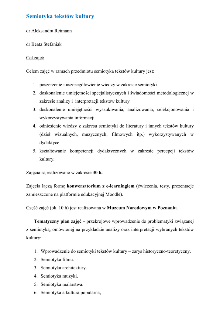 Semiotyka tekstów kultury dr Aleksandra Reimann dr Beata Stefaniak Cel zajęć Celem zajęć w ramach przedmiotu semiotyka tekstów kultury jest: 1. poszerzenie i uszczegółowienie wiedzy w zakresie semiotyki 2. doskonalenie umiejętności specjalistycznych i świadomości metodologicznej w zakresie analizy i interpretacji tekstów kultury 3. doskonalenie umiejętności wyszukiwania, analizowania, selekcjonowania i wykorzystywania informacji 4. odniesienie wiedzy z zakresu semiotyki do literatury i innych tekstów kultury (dzieł wizualnych, muzycznych, filmowych itp.) wykorzystywanych w dydaktyce 5. kształtowanie kompetencji dydaktycznych w zakresie percepcji tekstów kultury. Zajęcia są realizowane w zakresie 30 h. Zajęcia łączą formę konwersatorium z e-learningiem (ćwiczenia, testy, prezentacje zamieszczone na platformie edukacyjnej Moodle). Część zajęć (ok. 10 h) jest realizowana w Muzeum Narodowym w Poznaniu. Tematyczny plan zajęć – przekrojowe wprowadzenie do problematyki związanej z semiotyką, omówionej na przykładzie analizy oraz interpretacji wybranych tekstów kultury: 1. Wprowadzenie do semiotyki tekstów kultury – zarys historyczno-teoretyczny. 2. Semiotyka filmu. 3. Semiotyka architektury. 4. Semiotyka muzyki. 5. Semiotyka malarstwa. 6. Semiotyka a kultura popularna, 7. Semiotyka komunikacji. Zagadnienia metodologiczne obejmują starsze oraz najnowsze teorie badań (m.in. komparatystykę interdyscyplinarną, intermedialność), poza tym wpisują się w zagadnienia korespondencji sztuk (m.in. filiacje literacko-muzyczne, malarskofilmowe, jak i zjawiska należące do innych pograniczy sztuk). Przekrojowe wprowadzenie do tematyki związanej z semiotyką zostaje omówione w oparciu o literaturę podaną w bibliografii. Uwzględnia rys historyczny semiotyki na tle innych metodologii (formalizm, strukturalizm, semiotyka). Omówienie wybranych zjawisk literackich oraz artystycznych (filmowych, muzycznych, wizualnych etc.) ma pomóc w przygotowaniu do analizy oraz interpretacji dzieł w edukacji polonistycznej. Zajęcia ze sztuki interpretacji malarstwa odbędą się w Muzeum Narodowym w Poznaniu (lekcje muzealne). Forma zaliczenia Uczestnik zajęć zobowiązany jest rozwiązać test zamieszczony na platformie edukacyjnej Moodle. Test składa się z pytań zamkniętych i otwartych. Osiągnięcie 55 procent pozytywnych odpowiedzi gwarantuje zaliczenie przedmiotu. Bibliografia będzie podawana na bieżąco przed omawianym na zajęciach zagadnieniem. Antologie Alina Biała, „Literatura i architektura”, Warszawa 2010. Alina Biała, „Literatura i taniec”, Częstochowa 2013. Alina Biała, „Literatura i muzyka”, Warszawa 2011. Umberto Eco, „Semiologia życia codziennego”, Warszawa 1996. Umberto Eco, „Tryb symboliczny”, w: „Teorie literatury XX wieku. Antologia”, pod red. Anny Burzyńskiej i Michała P. Markowskiego, Kraków 2006, s. 304- 353. Jurij M. Łotman, „Problem znaczenia w tekście artystycznym”, w: „Teorie literatury XX wieku. Antologia”, pod red. Anny Burzyńskiej i Michała P. Markowskiego, Kraków 2006, s. 285-302. Jerzy Pelc, „Semiotyka – nauka, metoda, program”, Wrocław –Warszawa 1978.