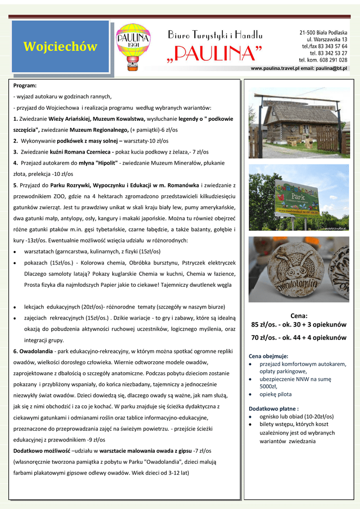 WYCIECZKA DO PARYŻA Wojciechów 6 dni Program: - wyjazd autokaru w godzinach rannych, - przyjazd do Wojciechowa i realizacja programu według wybranych wariantów: 1. Zwiedzanie Wieży Ariańskiej, Muzeum Kowalstwa, wysłuchanie legendy o " podkowie szczęścia", zwiedzanie Muzeum Regionalnego, (+ pamiątki)-6 zł/os 2. Wykonywanie podkówek z masy solnej – warsztaty-10 zł/os 3. Zwiedzanie kuźni Romana Czernieca - pokaz kucia podkowy z żelaza,- 7 zł/os 4. Przejazd autokarem do młyna "Hipolit" - zwiedzanie Muzeum Minerałów, płukanie złota, prelekcja -10 zł/os 5. Przyjazd do Parku Rozrywki, Wypoczynku i Edukacji w m. Romanówka i zwiedzanie z przewodnikiem ZOO, gdzie na 4 hektarach zgromadzono przedstawicieli kilkudziesięciu gatunków zwierząt. Jest tu prawdziwy unikat w skali kraju biały lew, pumy amerykańskie, dwa gatunki małp, antylopy, osły, kangury i makaki japońskie. Można tu również obejrzeć różne gatunki ptaków m.in. gęsi tybetańskie, czarne łabędzie, a także bażanty, gołębie i kury -13zł/os. Ewentualnie możliwość wzięcia udziału w różnorodnych: warsztatach (garncarstwa, kulinarnych, z fizyki (15zł/os) pokazach (15zł/os.) - Kolorowa chemia, Obróbka bursztynu, Pstryczek elektryczek Dlaczego samoloty latają? Pokazy kuglarskie Chemia w kuchni, Chemia w łazience, Prosta fizyka dla najmłodszych Papier jakie to ciekawe! Tajemniczy dwutlenek węgla lekcjach edukacyjnych (20zł/os)- różnorodne tematy (szczegóły w naszym biurze) zajęciach rekreacyjnych (15zł/os.) . Dzikie wariacje - to gry i zabawy, które są idealną okazją do pobudzenia aktywności ruchowej uczestników, logicznego myślenia, oraz integracji grupy. 6. Owadolandia - park edukacyjno-rekreacyjny, w którym można spotkać ogromne repliki owadów, wielkości dorosłego człowieka. Wiernie odtworzone modele owadów, zaprojektowane z dbałością o szczegóły anatomiczne. Podczas pobytu dzieciom zostanie pokazany i przybliżony wspaniały, do końca niezbadany, tajemniczy a jednocześnie niezwykły świat owadów. Dzieci dowiedzą się, dlaczego owady są ważne, jak nam służą, jak się z nimi obchodzić i za co je kochać. W parku znajduje się ścieżka dydaktyczna z ciekawymi gatunkami i odmianami roślin oraz tablice informacyjno-edukacyjne, przeznaczone do przeprowadzania zajęć na świeżym powietrzu. - przejście ścieżki edukacyjnej z przewodnikiem -9 zł/os Dodatkowo możliwość –udziału w warsztacie malowania owada z gipsu -7 zł/os (własnoręcznie tworzona pamiątka z pobytu w Parku "Owadolandia", dzieci malują farbami plakatowymi gipsowe odlewy owadów. Wiek dzieci od 3-12 lat) Cena: 85 zł/os. - ok. 30 + 3 opiekunów 70 zł/os. - ok. 44 + 4 opiekunów Cena obejmuje: przejazd komfortowym autokarem, opłaty parkingowe, ubezpieczenie NNW na sumę 5000zł, opiekę pilota Dodatkowo płatne : ognisko lub obiad (10-20zł/os) bilety wstępu, których koszt uzależniony jest od wybranych wariantów zwiedzania