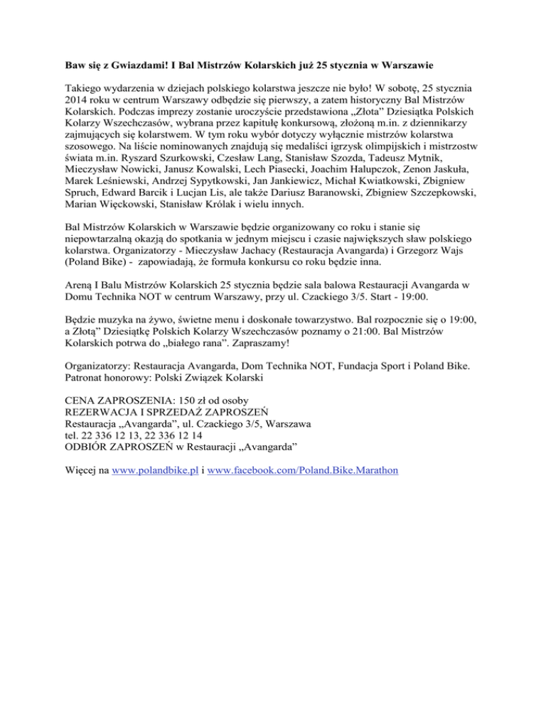 Baw się z Gwiazdami! I Bal Mistrzów Kolarskich już 25 stycznia w Warszawie Takiego wydarzenia w dziejach polskiego kolarstwa jeszcze nie było! W sobotę, 25 stycznia 2014 roku w centrum Warszawy odbędzie się pierwszy, a zatem historyczny Bal Mistrzów Kolarskich. Podczas imprezy zostanie uroczyście przedstawiona „Złota” Dziesiątka Polskich Kolarzy Wszechczasów, wybrana przez kapitułę konkursową, złożoną m.in. z dziennikarzy zajmujących się kolarstwem. W tym roku wybór dotyczy wyłącznie mistrzów kolarstwa szosowego. Na liście nominowanych znajdują się medaliści igrzysk olimpijskich i mistrzostw świata m.in. Ryszard Szurkowski, Czesław Lang, Stanisław Szozda, Tadeusz Mytnik, Mieczysław Nowicki, Janusz Kowalski, Lech Piasecki, Joachim Halupczok, Zenon Jaskuła, Marek Leśniewski, Andrzej Sypytkowski, Jan Jankiewicz, Michał Kwiatkowski, Zbigniew Spruch, Edward Barcik i Lucjan Lis, ale także Dariusz Baranowski, Zbigniew Szczepkowski, Marian Więckowski, Stanisław Królak i wielu innych. Bal Mistrzów Kolarskich w Warszawie będzie organizowany co roku i stanie się niepowtarzalną okazją do spotkania w jednym miejscu i czasie największych sław polskiego kolarstwa. Organizatorzy - Mieczysław Jachacy (Restauracja Avangarda) i Grzegorz Wajs (Poland Bike) - zapowiadają, że formuła konkursu co roku będzie inna. Areną I Balu Mistrzów Kolarskich 25 stycznia będzie sala balowa Restauracji Avangarda w Domu Technika NOT w centrum Warszawy, przy ul. Czackiego 3/5. Start - 19:00. Będzie muzyka na żywo, świetne menu i doskonałe towarzystwo. Bal rozpocznie się o 19:00, a Złotą” Dziesiątkę Polskich Kolarzy Wszechczasów poznamy o 21:00. Bal Mistrzów Kolarskich potrwa do „białego rana”. Zapraszamy! Organizatorzy: Restauracja Avangarda, Dom Technika NOT, Fundacja Sport i Poland Bike. Patronat honorowy: Polski Związek Kolarski CENA ZAPROSZENIA: 150 zł od osoby REZERWACJA I SPRZEDAŻ ZAPROSZEŃ Restauracja „Avangarda”, ul. Czackiego 3/5, Warszawa tel. 22 336 12 13, 22 336 12 14 ODBIÓR ZAPROSZEŃ w Restauracji „Avangarda” Więcej na www.polandbike.pl i www.facebook.com/Poland.Bike.Marathon