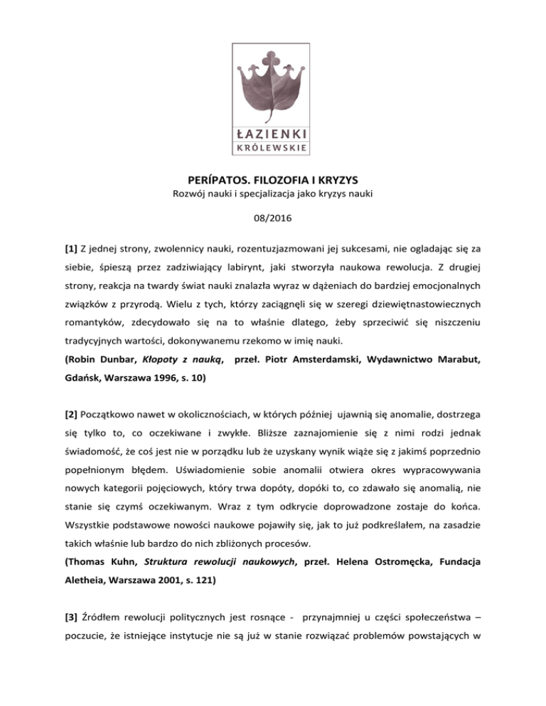 PERÍPATOS. FILOZOFIA I KRYZYS Rozwój nauki i specjalizacja jako kryzys nauki 08/2016 [1] Z jednej strony, zwolennicy nauki, rozentuzjazmowani jej sukcesami, nie ogladając się za siebie, śpieszą przez zadziwiający labirynt, jaki stworzyła naukowa rewolucja. Z drugiej strony, reakcja na twardy świat nauki znalazła wyraz w dążeniach do bardziej emocjonalnych związków z przyrodą. Wielu z tych, którzy zaciągnęli się w szeregi dziewiętnastowiecznych romantyków, zdecydowało się na to właśnie dlatego, żeby sprzeciwić się niszczeniu tradycyjnych wartości, dokonywanemu rzekomo w imię nauki. (Robin Dunbar, Kłopoty z nauką, przeł. Piotr Amsterdamski, Wydawnictwo Marabut, Gdańsk, Warszawa 1996, s. 10) [2] Początkowo nawet w okolicznościach, w których później ujawnią się anomalie, dostrzega się tylko to, co oczekiwane i zwykłe. Bliższe zaznajomienie się z nimi rodzi jednak świadomość, że coś jest nie w porządku lub że uzyskany wynik wiąże się z jakimś poprzednio popełnionym błędem. Uświadomienie sobie anomalii otwiera okres wypracowywania nowych kategorii pojęciowych, który trwa dopóty, dopóki to, co zdawało się anomalią, nie stanie się czymś oczekiwanym. Wraz z tym odkrycie doprowadzone zostaje do końca. Wszystkie podstawowe nowości naukowe pojawiły się, jak to już podkreślałem, na zasadzie takich właśnie lub bardzo do nich zbliżonych procesów. (Thomas Kuhn, Struktura rewolucji naukowych, przeł. Helena Ostromęcka, Fundacja Aletheia, Warszawa 2001, s. 121) [3] Źródłem rewolucji politycznych jest rosnące - przynajmniej u części społeczeństwa – poczucie, że istniejące instytucje nie są już w stanie rozwiązać problemów powstających w otoczeniu, które one same po części ukształtowały. Analogicznie, źródłem rewolucji naukowych jest rosnące - znów zazwyczaj wśród wąskiej grupy społeczności uczonych poczucie, że istniejący paradygmat przestał spełnić adekwatnie swe funkcje w poznawaniu tego aspektu przyrody, którego badania sam poprzednio umożliwił. Zarówno w rozwoju politycznym, jaki i naukowym poczucie to prowadzi do kryzysu, który jest warunkiem wstępnym rewolucji. (Thomas Kuhn, Struktura rewolucji naukowych, przeł. Helena Ostromęcka, Fundacja Aletheia, Warszawa 2001, s. 168-168) [4] (…) wynika z tego, że za pomocą argumentacji nie można odsunąć na bok „nienaukowych” sposobów postępowania. Powiedzenie „procedura, której użyłeś, jest nienaukowa, więc nie możemy zawierzyć twoim wynikom i dać ci pieniędzy na badania” zakłada, że „nauka” ma osiągnięcia i zawdzięcza owe osiągnięcia stosowaniu jednolitych procedur. Pierwszy składnik tego stwierdzenia („nauka zawsze ma osiągnięcia”) nie jest prawdziwy, jeśli przez „naukę” rozumiemy to, co robią naukowcy – niepowodzenia są również liczne. Drugi składnik – przyczyną sukcesów są jednolite procedury – nie jest prawdziwy, ponieważ procedury takie nie istnieją. Naukowcy są jak architekci, wznoszący budynki zróżnicowane pod względem wielkości i kształtu, których oceniać można dopiero po fakcie, tzn. dopiero po skończeniu przez nich gmachu. Może on stać, może się przewrócić – nie wiadomo. (Paul K. Feyerabend, Przeciw metodzie, przeł. Stefan Wiertlewski, Wydawnictwo Siedmioróg, Wrocław 2001, s.11) [5] Jeśli studia nad nauką dokonały czegokolwiek, myślałem sobie, to z pewnością raczej dodały rzeczywistości (reality) nauce, a nie jej odjęły. Zamiast słomianych naukowców zwisających ze ścian gabinetowych filozofów nauki z przeszłości, nakreśliliśmy obrazy barwnych postaci, zagłębionych w swoich laboratoriach, pełnych pasji, zapatrzonych w mnóstwo instrumentów, przesiąkniętych specjalistyczną wiedzą techniczną (know-how), ściśle połączonych z jakimś większym, tętniącym życiem otoczeniem. (Bruno Latour, Nadzieja Pandory, przeł. Krzysztof Arbiszewski, Wydawnictwo Naukowe Uniwersytetu Mikołaja Kopernika, Toruń 2013, s. 31)