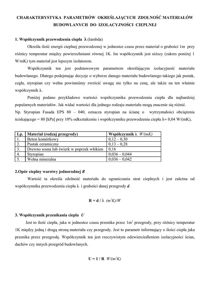 CHARAKTERYSTYKA PARAMETRÓW OKREŚLAJĄCYCH ZDOLNOŚĆ MATERIAŁÓW BUDOWLANYCH DO IZOLACYJNOŚCI CIEPLNEJ 1. Współczynnik przewodzenia ciepła λ (lambda) Określa ilość energii cieplnej przewodzonej w jednostce czasu przez materiał o grubości 1m przy różnicy temperatur między powierzchniami równej 1K. Im współczynnik jest niższy (zakres poniżej 1 W/mK) tym materiał jest lepszym izolatorem. Współczynnik ten jest podstawowym parametrem określającym izolacyjność materiału budowlanego. Dlatego podejmując decyzje o wyborze danego materiału budowlanego takiego jak pustak, cegła, styropian czy wełna powinniśmy zwrócić uwagę nie tylko na cenę, ale także na ten właśnie współczynnik λ. Poniżej podano przykładowe wartości współczynnika przewodzenia ciepła dla najbardziej popularnych materiałów. Jak widać wartości dla jednego rodzaju materiału mogą znacznie się różnić. Np. Styropian Fasada EPS 80 – 040, oznacza styropian na ścianę o wytrzymałości obciążenia ściskającego = 80 [kPa] przy 10% odkształceniu i współczynniku przewodzenia ciepła λ= 0,04 W/(mK), Lp. 1. 2. 3. 4. 5. Materiał (rodzaj przegrody) Beton komórkowy Pustak ceramiczny Drewno sosna lub świerk w poprzek włókien Styropian Wełna mineralna Współczynnik λ W/(mK) 0,12 – 0,30 0,13 – 0,28 0,16 0,036 – 0,044 0,036 – 0,042 2.Opór cieplny warstwy jednorodnej R Wartość ta określa zdolność materiału do ograniczania strat cieplnych i jest zależna od współczynnika przewodzenia ciepła λ i grubości danej przegrody d. R = d / λ (m2K)/W 3. Współczynnik przenikania ciepła U Jest to ilość ciepła, jaka w jednostce czasu przenika przez 1m2 przegrody, przy różnicy temperatur 1K między jedną i drugą stroną materiału czy przegrody. Jest to parametr informujący o ilości ciepła jaka przenika przez przegrodę. Współczynnik ten jest rzeczywistym odzwierciedleniem izolacyjności ścian, dachów czy innych przegród budowlanych. U = 1 / R W/(m2K) Przykład ściany dwuwarstwowej: 1. mur z betonu komórkowego: λ = 0,30 W/(mK), d = 0,25m 2. styropian: FASADA EPS 80 – 040 λ = 0,04 W/(mK), d = 0,08m Opór ściany: R = 0,25/0,30 + 0,08/0,04 = 0,71+2 = 2,83 (m2K)/W To całkowity współczynnik U naszej ściany wyniesie: U = 1 / 2,71= 0,35 W/(m2K) Wynik ten przewyższa maksymalną dopuszczalną wartość współczynnika U dla ścian zewnętrznych budynku mieszkalnego, który wynosi 0,3 W/(m2K). Dlatego taką ścianę należy przeprojektować aby spełniała ona „Rozporządzenie Warunki Techniczne” jakim powinny odpowiadać budynki. Odpowiednie ocieplenie budynku sprawi, że poniesione koszty na ogrzewanie naszego domu będą znacznie niższe. Upraszczając można założyć, że koszt dziesięciokrotności współczynnika przenikania ciepła (10x U). ogrzewania budynku jest równy
