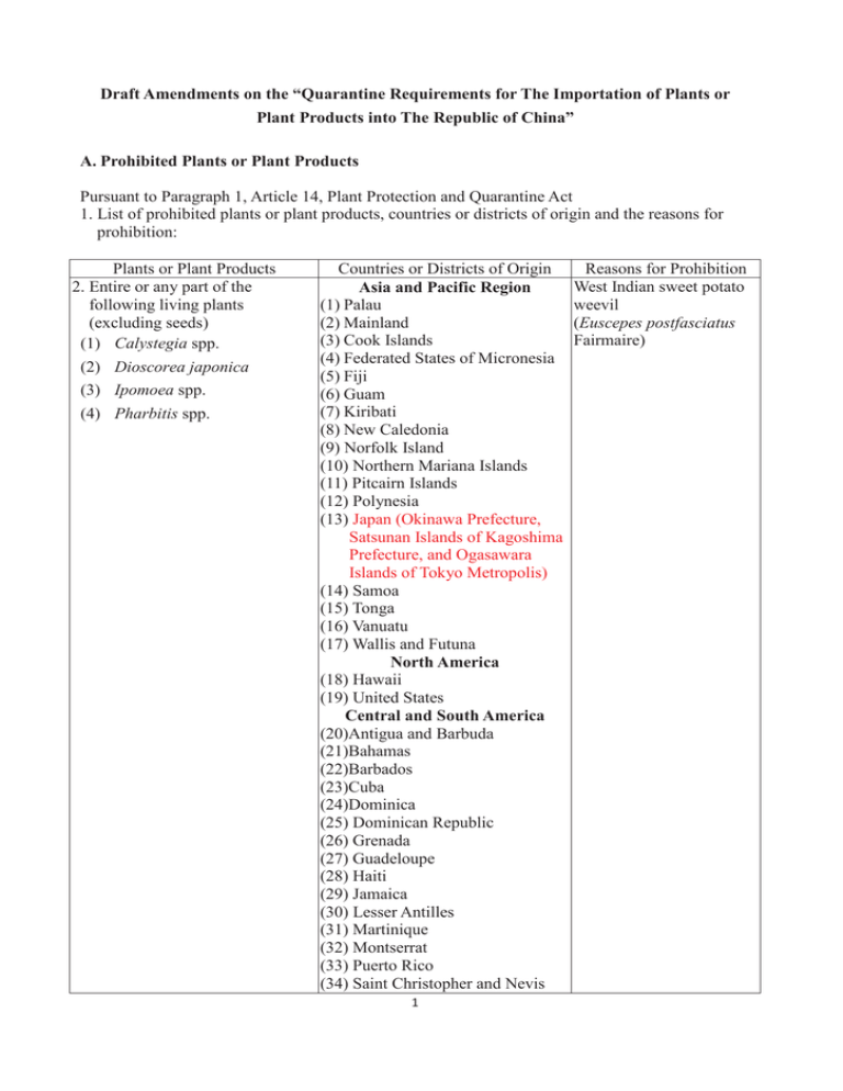 Draft Amendments on the “Quarantine Requirements for The Importation of Plants or Plant Products into The Republic of China” A. Prohibited Plants or Plant Products Pursuant to Paragraph 1, Article 14, Plant Protection and Quarantine Act 1. List of prohibited plants or plant products, countries or districts of origin and the reasons for prohibition: Plants or Plant Products 2. Entire or any part of the following living plants (excluding seeds) (1) Calystegia spp. (2) Dioscorea japonica (3) Ipomoea spp. (4) Pharbitis spp. Countries or Districts of Origin Asia and Pacific Region (1) Palau (2) Mainland (3) Cook Islands (4) Federated States of Micronesia (5) Fiji (6) Guam (7) Kiribati (8) New Caledonia (9) Norfolk Island (10) Northern Mariana Islands (11) Pitcairn Islands (12) Polynesia (13) Japan (Okinawa Prefecture, Satsunan Islands of Kagoshima Prefecture, and Ogasawara Islands of Tokyo Metropolis) (14) Samoa (15) Tonga (16) Vanuatu (17) Wallis and Futuna North America (18) Hawaii (19) United States Central and South America (20)Antigua and Barbuda (21)Bahamas (22)Barbados (23)Cuba (24)Dominica (25) Dominican Republic (26) Grenada (27) Guadeloupe (28) Haiti (29) Jamaica (30) Lesser Antilles (31) Martinique (32) Montserrat (33) Puerto Rico (34) Saint Christopher and Nevis 1 Reasons for Prohibition West Indian sweet potato weevil (Euscepes postfasciatus Fairmaire) B. Quarantine Requirements for Enterable Plants or Plant Products under Precautionary Requirements Pursuant to Subparagraph 2 of the first paragraph, Article 14, Plant Protection and Quarantine Act 1. Names of enterable plants or plant products, countries or districts of their origin, and entry requirements. Plants or Plant Countries or Districts of Diseases or Pests Quarantine Requirements Products Origin 37. Plants or plant Pseudomonas The importation of the Asia and Pacific parts: syringae pv. syringae plants or plant parts shall be Region (1) Afghanistan A. The following accompanied by the (2) Azerbaijan living plants and phytosanitary certificates above-ground plant (3) Australia issued by the plant (4) Bangladesh parts for quarantine authority of (5) Belarus propagative use exporting countries, stating (6)Mainland China (excluding cut that the plants or plant parts flowers, seeds, and (7) Georgia have been thoroughly (8) India inspected during growing fruits)烉 (9) Iran season or laboratory tested (1) Abelmoschus (10) Israel before export and found free esculentus (11) Japan from Pseudomonas syringae =Hibiscus (12) Korea, pv. Syringae; oherwise, the esculentus Democratic plants or plant parts will be (2) Aconitum spp. People's Republic destroyed or reshipped. (3) Actinidia of chinensis (13) Korea, Republic (4) Actinidia of deliciosa (14) Kyrgyz (5) Alnus glutinosa (15) Lebanon (6) Aralia spp. (16) New Zealand (7) Arbutus spp. (17) Russian (8) Betula pendula Federation (9) Calystegia (18) Pakistan sepium (19) Sri Lanka (10)Capsicum (20) Thailand annuum (21) Turkey (11)Carthamus (22) Ukraine tinctorius (12)Centaurea stoebe (23) Uzbekistan (13)Chrysanthemum Africa (24) Algeria indicum (25) Egypt (14)Cinnamomum (26) Ethiopia camphora (27) Kenya (15)Citrus spp. (28) Lesotho (16)Coffea arabica (29) Libya (17)Cucumis sativus (30) Malawi (18)Cucurbita spp. (31) Morocco (19)Cyamopsis (32) Nigeria tetragonoloba (20)Cydonia oblonga (33) South Africa (34) Tanzania (21)Dahlia pinnata 15 (22)Daphne odora (35) Tunisia (23)Diospyros kaki (36) Uganda (37) Zimbabwe (24)Forsythia intermedia Europe (38) Austria (25)Fortunella spp. (39) Belgium (26)Fragaria vesca (40) Bosnia and (27)Glycine max Herzegovina (28)Hibiscus spp. (29)Hordeum vulgare (41) Bulgaria (42) Cyprus (30)Juglans regia (31)Lablab purpureus (43) Czech (44) Denmark (32)Ligustrum (45) France ovalifolium (33)Litchi chinensis (46) Germany (47) Greece (34)Magnolia spp. (35)Mangifera indica (48) Hungary (36)Malus domestica (49) Ireland (37)Mucuna pruriens (50) Italy (51) Latvia (38)Musa (52) Lithuania paradisiacal (39)Nerium oleander (53) Macedonia (54) Moldova (40)Nicotiana (55) Netherlands tabacum (56) Poland (41)Olea europaea (57) Portugal (42)Oryza sativa (43)Passiflora edulis (58) Romania (44)Persea americana (59) Serbia (60) Republic of (45)Phaseolus Slovenia coccineus (61) Spain (46)Phaseolus (62) Sweden lunatus (63) Switzerland (47)Phaseolus (64) United Kingdom vulgaris (48)Philadelphus spp. North America (66) Canada (49)Pinus radiata (67) Mexico (50)Piper nigrum (68) United States (51)Pisum sativum (52)Populus spp. Central and South (53)Prunus spp. America (69) Barbados (54)Pyrus spp. (70) El Salvador (55)Rhododendron (71) Guatemala spp. (72) Honduras (56)Rosa spp. (73) Panama (57)Salix spp. (74) Puerto Rico (58)Solanum (75) Argentina betaceum = (76) Brazil Cyphomandra (77) Chile betacea (78) Uruguay (59)Solanum (79) Venezuela lycopersicum =Lycopersium 16 esculentum (60)Sorghum bicolor (61)Triticum aestivum (62)Vernicia fordii= Aleurites fordii (63)Vicia spp. (64)Vigna spp. (65)Vitis spp. (66)Zea mays B. The following seeds for planting: (1) Cyamopsis tetrag onoloba (2) Glycine max (3) Lablab purpureus (4) Oryza sativa (5) Phaseolus coccineus (6) Phaseolus lunatus (7) Phaseolus vulgaris (8) Sorghum bicolor (9) Triticum aestivum (10)Vicia spp. (11)Vigna spp. 6. Importation of lilies (excluding Lilium spp. bulbs imported from the Netherlands or Chile), gladiolus, and dahlia bulbs shall comply with the “Quarantine Requirements for The Importation of Lilies, Gladiolus, and Dahlia Bulbs.” The importation of Lilium spp. bulbs originated from the Netherlands shall follow the “Quarantine Requirements for the Importation of Lily flower Bulbs from The Netherlands”, and the importation of Lilium spp. bulbs originated from Chile shall follow the “Quarantine Requirements for the Importation of Lily flower Bulbs from Chile”. 10. Importation of plants or plant products shall be subjected to appropriate quarantine treatment for mitigating following pests if they are intercept