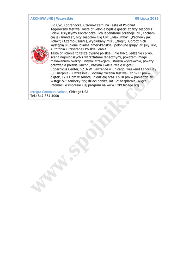 ARCHIWALNE | Wszystkie 08 Lipca 2013 w w w .s po jn ik Integra Communications, Chicago USA Tel.: 847-864-4000 .c o m Big Cyc, Kobranocka, Czarno-Czarni na Taste of Polonia! Tegoroczny festiwal Taste of Polonia będzie gościć aż trzy zespoły z Polski. Usłyszymy Kobranockę i ich legendarne przeboje jak „Kocham cię jak Irlandię”, hity zespołów Big Cyc („Makumba”, „Pechowy jak Polak”) i Czarno-Czarni („Wydłubany miś”, „Nogi”). Oprócz nich wystąpią ulubione lokalne amerykańskie i polonijne grupy jak July Trio, Autofobia i Przystanek Polskie Granie. Taste of Polonia to także pyszne polskie (i nie tylko) jedzenie i piwo, scena najmłodszych z warsztatami tanecznymi, pokazami magii, malowaniem twarzy i innymi atrakcjami, stoiska wystawców, pokazy gotowania polskiej kuchni, kasyno i wiele, wiele więcej! Copernicus Center, 5216 W. Lawrence w Chicago, weekend Labor Day (30 sierpnia - 2 września). Godziny trwania festiwalu to 5-11 pm w piątek, 12-11 pm w sobotę i niedzielę oraz 12-10 pm w poniedziałek. Wstęp: $7; seniorzy: $5; dzieci poniżej lat 12: bezpłatnie. Więcej infomacji o imprezie i jej program na www.TOPChicago.org