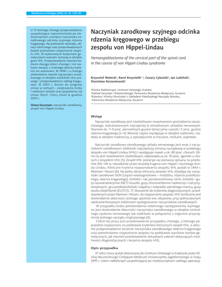Współczesna Onkologia (2006) vol. 10; 1 (18–20) U 37-letniego chorego przeprowadzono uzupełniające napromienianie po niedoszczętnym usunięciu naczyniaka zarodkowego odcinka szyjnego rdzenia kręgowego. Na podstawie wywiadu, obrazu klinicznego oraz przeprowadzonych badań postawiono rozpoznanie zespołu VHL. W wykonanych badaniach genetycznych wykryto mutację w obrębie genu VHL. Przeprowadzono również badanie dwojga dzieci chorego i nie wykryto mutacji, u trzeciego dziecka badania nie wykonano. W 1998 r. u chorego stwierdzono nawrót naczyniaka zarodkowego w obrębie siatkówki oka prawego i przeprowadzono zabieg koagulacji. W 2003 r. doszło do progresji zmian w nerkach – zwiększenia liczby i wielkości torbieli oraz pojawienia się zmian litych. Chory zmarł w grudniu 2003 r. Naczyniak zarodkowy szyjnego odcinka rdzenia kręgowego w przebiegu zespołu von Hippel-Lindau Hemangioblastoma of the cervical part of the spinal cord in the course of von Hippel-Lindau syndrome Krzysztof Małecki1, Karol Krzystolik2, 3, Cezary Cybulski2, Jan Lubiński2, Stanisław Korzeniowski1 1Klinika Radioterapii, Centrum Onkologii, Kraków Genetyki i Patomorfologii, Pomorska Akademia Medyczna, Szczecin 3Katedra i Klinika Okulistyki z Zakładem Patofizjologii Narządu Wzroku, Pomorska Akademia Medyczna, Szczecin 2Zakład Słowa kluczowe: naczyniak zarodkowy, zespół von Hippel-Lindau. Wstęp Naczyniak zarodkowy jest niezłośliwym nowotworem pochodzenia naczyniowego, zlokalizowanym najczęściej w ośrodkowym układzie nerwowym. Stanowi ok. 7–9 proc. pierwotnych guzów tylnej jamy czaszki i 5 proc. guzów rdzenia kręgowego [1–4]. Równie często występuje w obrębie siatkówki, rzadziej w obrębie nadnerczy, a sporadycznie w trzustce, nerkach, wątrobie. Naczyniak zarodkowy ośrodkowego układu nerwowego jest wraz z naczyniakiem zarodkowym siatkówki najczęstszą zmianą narządową w przebiegu zespołu von Hippel-Lindau (VHL) i występuje nawet u ok. 80 proc. chorych. Mimo że jest nowotworem niezłośliwym, odpowiada za ok. 50 proc. zgonów u chorych z zespołem VHL [5]. Zespół VHL został po raz pierwszy opisany na przełomie XIX i XX w. niezależnie przez okulistę Eugena von Hippel i neurologa Arvida Lindau. Kliniczne kryteria rozpoznawania zespołu VHL podali w 1964 r. Melmon i Rosen [6]. Na pełny obraz kliniczny zespołu VHL składają się naczyniaki zarodkowe OUN (często wieloogniskowe – móżdżku, rdzenia przedłużonego, rdzenia kręgowego), torbiele i rak jasnokomórkowy nerki, torbiele i guzy neuroendokrynne (NET) trzustki, guzy chromochłonne nadnerczy i ciał przyzwojowych, gruczolakotorbielaki najądrzy i więzadła szerokiego macicy, guzy worka śródchłonki (ELST) [5, 7]. Stosownie do kryteriów diagnostycznych, przedstawionych przez Melmon i Rosen, do rozpoznania zespołu VHL konieczne jest stwierdzenie obecności jednego spośród ww. objawów, przy jednoczesnym udokumentowanym rodzinnym występowaniu naczyniaków zarodkowych. W przypadku braku potwierdzenia rodzinnego występowania, wymagane jest stwierdzenie obecności naczyniaka zarodkowego w obrębie centralnego systemu nerwowego lub siatkówki w połączeniu z zajęciem przynajmniej jednego narządu miąższowego [6]. Celem tej pracy jest przedstawienie przypadku chorego, u którego poprzednio rozpoznano na podstawie kryteriów klinicznych zespół VHL, a obecnie przeprowadzono leczenie naczyniaka zarodkowego rdzenia kręgowego oraz potwierdzono rozpoznanie zespołu na podstawie wyników testów genetycznych, jak również przedstawienie aktualnych zaleceń dotyczących możliwości diagnostycznych i leczenia zespołu VHL. Opis przypadku 37-letni chory został skierowany do Centrum Onkologii w Krakowie przez Klinikę Neurochirurgii Collegium Medicum Uniwersytetu Jagiellońskiego w maju 1995 r. celem radioterapii uzupełniającej po niedoszczętnym zabiegu operacyj- Współczesna Onkologia (2006) vol. 10; 1 (18–20) A 37-year-old patient was irradiated after a subtotal excision of the hemangioblastoma of the cervical spinal cord. On the basis of history, physical examination and performed additional tests, the diagnosis of VHL syndrome was established. The genetic examination revealed VHL gene mutation. Genetic tests were also performed in two children of the patient and did not reveal any mutations. The last one child was not examined. In 1998 the patient underwent coagulation because of hemangioblastoma recurrence in the right retina. In 2003 patient developed a progressive disease in the kidneys. The patient died in December 2003. Key words: hemangioblastoma, von Hippel-Lindau syndrome. nym. W wywiadzie ustalono, że w 1985 r. chory przeszedł operację doszczętnego usunięcia naczyniaka zarodkowego móżdżku. Ponadto poddany był zabiegom koagulacji naczyniaków zarodkowych w obrębie siatkówki oka lewego w 1981 r. i siatkówki oka prawego w 1992 r. Na podstawie obrazu klinicznego postawiono rozpoznanie zespołu VHL. W badaniu rezonansu magnetycznego wykonanym przed zabiegiem stwierdzono na wysokości C3–C5 śródrdzeniowy guz o wymiarach 33 x 22 mm, powodujący znaczne poszerzenie rdzenia i kanału centralnego. Drugi guzek o średnicy 5 mm zaobserwowano w tylnej części rdzenia na poziomie Th1. Operację przeprowadzono w kwietniu 1995 r. Polegała ona na częściowym usunięciu naczyniaka zarodkowego odcinka szyjnego rdzenia kręgowego, zlokalizowanego na poziomie od C3 do C5. Wynik badania histopatologicznego potwierdził rozpoznanie kliniczne naczyniaka zarodkowego. Przy przyjęciu do Centrum Onkologii stwierdzono dość dobry stan ogólny chorego, niedowład spastyczny kończyn górnych i dolnych, zaburzenia czucia głębokiego w kończynach dolnych do wysokości stawów skokowych, ślepotę oka lewego i ograniczenie pola widzenia w oku prawym. W związku z niedoszczętnością zabiegu operacyjnego przeprowadzono uzupełniające napromienianie w warunkach telegammaterapii 60Co. Zastosowano t