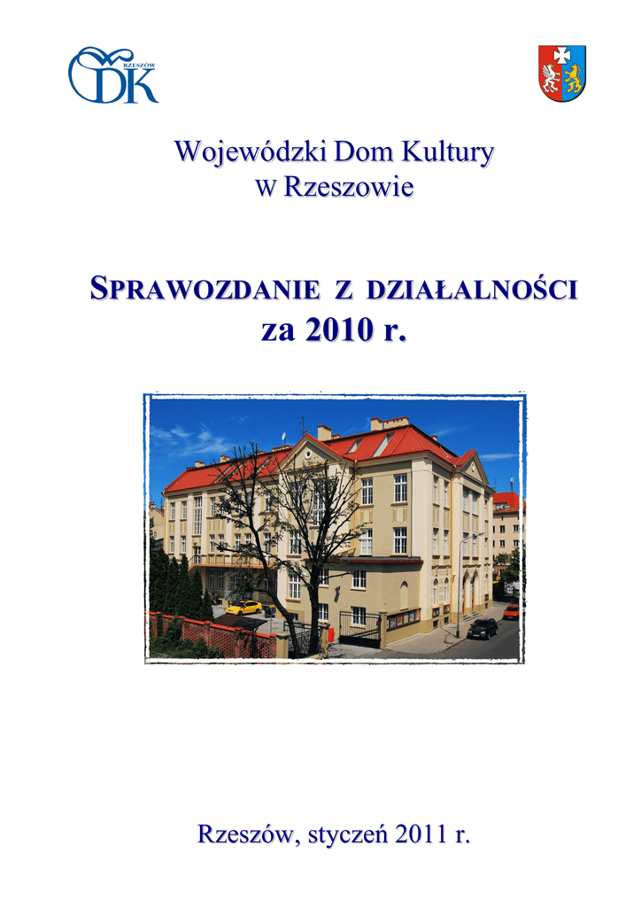 Wojewódzki Dom Kultury W Rzeszowie SPRAWOZDANIE Z DZIAŁALNOŚCI za 2010 r. Rzeszów, styczeń 2011 r. S P I S T R E Ś C I I. DZIAŁALNOŚĆ INSTRUKCYJNO-METODYCZNA 1. Doskonalenie zawodowe pracowników domów i ośrodków kultury oraz społecznych animatorów kultury 3 2. Współpraca merytoryczna i organizacyjna z terenowymi placówkami kultury 4 II. DZIAŁALNOŚĆ O ZASIĘGU WOJEWÓDZKIM I OGÓLNOPOLSKIM 1. Imprezy własne, konkursy, przeglądy i spotkania WDK 5 2. Współorganizacja imprez 8 3. Koncerty i zgrupowania artystyczne zespołów WDK 9 4. Wystawy artystyczne 11 5. Inne formy 12 6. Usługi kulturalne 14 III. WSPÓŁPRACA ZAGRANICZNA 15 IV. DZIAŁALNOŚĆ ŚRODOWISKOWA 1. Zespoły artystyczne 16 2. Kluby i koła zainteresowań 16 3. Stowarzyszenia społeczno - kulturalne 17 2 I. DZIAŁALNOŚĆ INSTRUKCYJNO - METODYCZNA 1. DOSKONALENIE ZAWODOWE PRACOWNIKÓW DOMÓW I OŚRODKÓW KULTURY ORAZ SPOŁECZNYCH ANIMATORÓW KULTURY SEMINARIA - SZKOLENIA - WARSZTATY - PLENERY • • • • • • • • • • • • • • • • • • • • Seminarium nt. grafiki komputerowej. Otwarte warsztaty na temat fotografii cyfrowej - z Centrum Sony w Rzeszowie. Szkolenie nt. „Finansowanie projektów kulturalnych ze środków MKiDN”. „Balans bieli - teoria i praktyka” - Seminarium fotograficzne - z Centrum Sony w Rzeszowie. Spotkanie autorskie Edwarda Guziakiewicza z Mielca w ramach Podkarpackiej Izby Poetów. „Jak fotografować ruch, aby uzyskać wrażenie ruchu w fotografii” - Seminarium fotograficzne i warsztaty - z Centrum Sony w Rzeszowie. „Głębia ostrości i perspektywa” - Seminarium fotograficzne - z Centrum Sony w Rzeszowie. Promocja książki Piotra Duraka „Ostatni Rok” w ramach Podkarpackiej Izby Poetów. Seminarium nt. „Tajniki warsztatu recytatorskiego”. „Pedagogika zabawy” w pracy animatora kultury - dwie edycje warsztatów. Niedzielne Wprawki Taneczne dla sympatyków tańca towarzyskiego. Plener Plastyczny Amatorskiego Klubu Plastycznego WDK w Markowej. Otwarte warsztaty filmowe - ze Studiem filmowym „Exd’Art”. Szkolenie nt. pozyskiwania środków pozabudżetowych na działalność kulturalną. Warsztaty i seminarium filmowe - organizowane w ramach XXIII Festiwalu filmowego OPFA - z Wojskowym Centrum Edukacji Obywatelskiej w Warszawie. Plener Malarski „Brzozowiec 2010” dla Członków Amatorskiego Klubu Plastycznego. „Obrzędy i zwyczaje doroczne okresu zimowego w aspekcie widowisk scenicznych” - seminarium dla animatorów teatrów obrzędowych. „Zajęcia kreatywne w pracy z osobami z niepełnosprawnością intelektualną - formy plastyczne, muzyczno-ruchowe i integracyjne”- warsztaty dla opiekunów pracujących w DPS i WTZ. 2 Warsztaty taneczne Dziecięcego Zespołu Artystycznego UŚMIECH. „Stół w świątecznej oprawie” warsztaty rękodzieła artystycznego. 3 KURSY • • • • • • Kurs dla elektroakustyków - 45 uczestników. Kurs Kwalifikacyjny II stopnia z dziedziny tańca współczesnego /6 zjazdów/. Kurs tańca I stopnia - 7 grup - 80 uczestników. Kurs tańca II stopnia - 2 grupy - 6 uczestników. Kurs tańca III stopnia - 1 grupa - 10 uczestników. Kurs tańca IV stopnia - 1 grupa - 9 uczestników. 2. WSPÓŁPRACA MERYTORYCZNA I ORGANIZACYJNA Z TERENOWYMI PLACÓWKAMI KULTURY • • • • • 317 - wyjazdów pracowników w teren, które dotyczyły: 17 - konsultacji programów zespołów artystycznych, 17 - organizacji imprez, 147 - udziału w przeglądach, imprezach, konkursach, wystawach, plenerach, jury, 14 - udziału w szkoleniach, 49 - udziału z zespołami WDK w koncertach, 90 - inne. Wyjazdy instruktorów do placówek terenowych /m.in. konsultacje, poradnictwo merytoryczne i organizacyjne, udział w jury konkursów i przeglądów/: - VIII Konkurs Recytatorski Poezji o Annie Jenke w Zespole Szkół w Rogóżnie, - Eliminacje Rejonowe Ogólnopolskiego Konkursu Recytatorskiego w MGOK w Sędziszowie Młp., - XXVI Wojewódzki Przegląd Zespołów Artystycznych Szkolnictwa Specjalnego w Osiedlowym Domu Kultury w Rzeszowie, - IX Gimnazjalny Przegląd Teatrów Obcojęzycznych w Gimnazjum nr 8 w Rzeszowie, - VI Wojewódzki Przegląd Twórczości Dzieci i Młodzieży Niepełnosprawnej „Żywioły” w Zespole Szkół Specjalnych w Kolbuszowej Dolnej, - Konkurs Recytatorski Powiatu Lubaczowskiego „Recytator Roku 2010” w Miejskim Domu Kultury w Lubaczowie, - XXX Wojewódzki Konkurs Chórów Szkolnych A'Capella Dzieci i Młodzieży, - XXXV Międzywojewódzki Sejmik Wiejskich Zespołów Teatralnych - Tarnogród, - XV Kolbuszowskie Spotkania Orkiestrowe im. Walentego Kaziora, - Konkurs Poezji Patriotycznej „Moja mała ojczyzna” - MOK w Dynowie, Pomoc merytoryczna i organizacyjna terenowym domom i ośrodkom kultury w przygotowaniu i przeprowadzeniu imprez o zasięgu wojewódzkim i ogólnopolskim. Konsultacje zespołów amatorskich przygotowujących się do udziału w konkursach wojewódzkich i ogólnopolskich. Konsultacje dla zainteresowanych instruktorów i animatorów kultury w WDK. 4 • • • • • Udostępnianie materiałów repertuarowych i metodycznych na miejscu. Założenie aktualnego katalogu Poradni Repertuarowej. Dokumentacja folkloru z imprez organizowanych przez WDK - w systemie DVD. Stała współpraca ze Szkołą Mistrzostwa Tańca Sportowego „Aksel”. Opieka nad studentami odbywającymi praktyki w WDK. WYDAWNICTWA • • • • • • • Tomik tekstów nagrodzonych i wyróżnionych w Konkursie Poetyckim „Ja i Świat”. Podkarpacki Informator Kulturalny - 5 numerów. Kalendarz Imprez Kulturalnych Województwa Podkarpackiego na rok 2010. Opracowanie materiału „Organizacja działalności społeczno - kulturalnej w gminach/miastach województwa podkarpackiego w 2009 r.”. Katalog XIII Międzynarodowego Niekonwencjonalnego Konkursu Fotograficznego „Foto Odlot”. Katalog 26. Ogólnopolskiej Wystawy Twórczości Pedagogów Plastyki. 6. Zeszyt Regionalny „Kapele Ludow