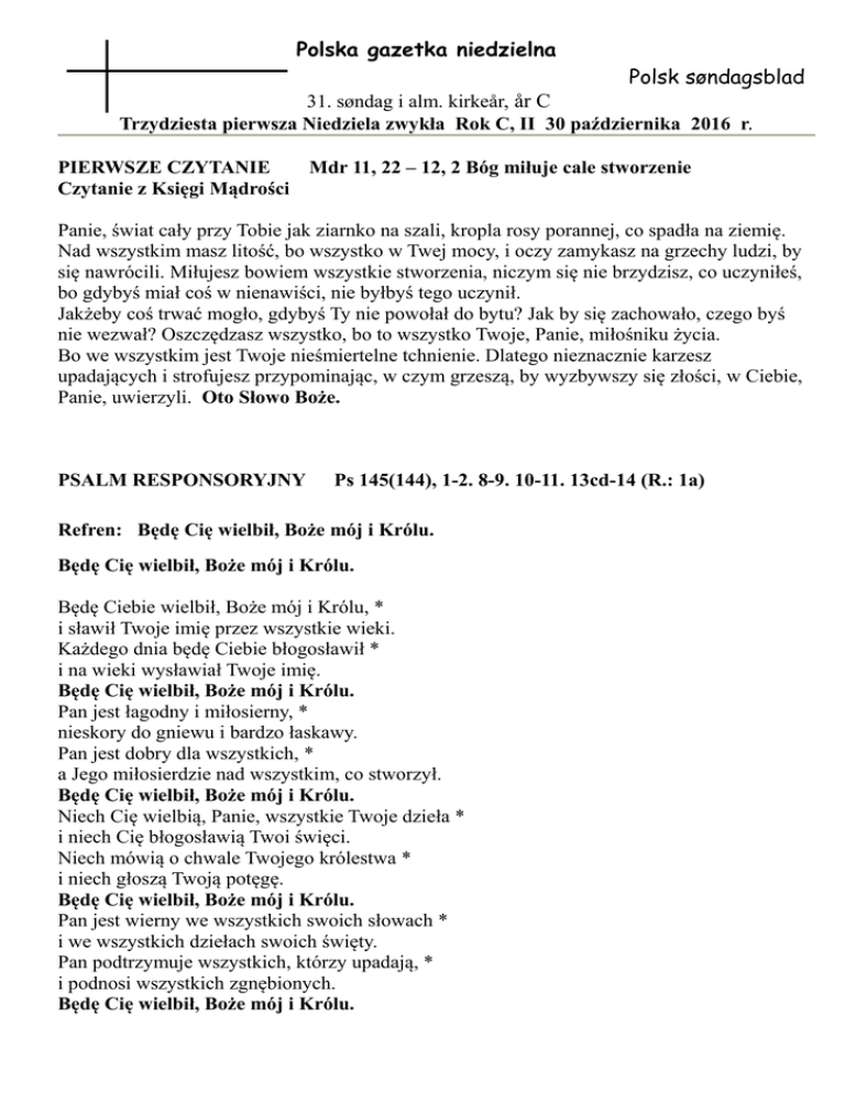 Polska gazetka niedzielna Polsk søndagsblad 31. søndag i alm. kirkeår, år C Trzydziesta pierwsza Niedziela zwykła Rok C, II 30 października 2016 r. PIERWSZE CZYTANIE Mdr 11, 22 – 12, 2 Bóg miłuje cale stworzenie Czytanie z Księgi Mądrości Panie, świat cały przy Tobie jak ziarnko na szali, kropla rosy porannej, co spadła na ziemię. Nad wszystkim masz litość, bo wszystko w Twej mocy, i oczy zamykasz na grzechy ludzi, by się nawrócili. Miłujesz bowiem wszystkie stworzenia, niczym się nie brzydzisz, co uczyniłeś, bo gdybyś miał coś w nienawiści, nie byłbyś tego uczynił. Jakżeby coś trwać mogło, gdybyś Ty nie powołał do bytu? Jak by się zachowało, czego byś nie wezwał? Oszczędzasz wszystko, bo to wszystko Twoje, Panie, miłośniku życia. Bo we wszystkim jest Twoje nieśmiertelne tchnienie. Dlatego nieznacznie karzesz upadających i strofujesz przypominając, w czym grzeszą, by wyzbywszy się złości, w Ciebie, Panie, uwierzyli. Oto Słowo Boże. PSALM RESPONSORYJNY Ps 145(144), 1-2. 8-9. 10-11. 13cd-14 (R.: 1a) Refren: Będę Cię wielbił, Boże mój i Królu. Będę Cię wielbił, Boże mój i Królu. Będę Ciebie wielbił, Boże mój i Królu, * i sławił Twoje imię przez wszystkie wieki. Każdego dnia będę Ciebie błogosławił * i na wieki wysławiał Twoje imię. Będę Cię wielbił, Boże mój i Królu. Pan jest łagodny i miłosierny, * nieskory do gniewu i bardzo łaskawy. Pan jest dobry dla wszystkich, * a Jego miłosierdzie nad wszystkim, co stworzył. Będę Cię wielbił, Boże mój i Królu. Niech Cię wielbią, Panie, wszystkie Twoje dzieła * i niech Cię błogosławią Twoi święci. Niech mówią o chwale Twojego królestwa * i niech głoszą Twoją potęgę. Będę Cię wielbił, Boże mój i Królu. Pan jest wierny we wszystkich swoich słowach * i we wszystkich dziełach swoich święty. Pan podtrzymuje wszystkich, którzy upadają, * i podnosi wszystkich zgnębionych. Będę Cię wielbił, Boże mój i Królu. DRUGIE CZYTANIE 2 Tes 1, 11 – 2, 2 Uświęcenie chrześcijan przynosi Czytanie z Drugiego Listu świętego Pawła Apostoła do Tesaloniczan Bracia: Modlimy się zawsze za was, aby Bóg nasz uczynił was godnymi swego wezwania, aby z mocą udoskonalił w was wszelkie pragnienie dobra oraz czyn płynący z wiary. Aby w was zostało uwielbione imię Pana naszego Jezusa Chrystusa, a wy w Nim, za łaską Boga naszego i Pana Jezusa Chrystusa. W sprawie przyjścia Pana naszego Jezusa Chrystusa i naszego zgromadzenia wokół Niego prosimy was, bracia, abyście się nie dali zbyt łatwo zachwiać w waszym rozumieniu ani zastraszyć bądź przez ducha, bądź przez mowę, bądź przez list rzekomo od nas pochodzący, jakoby już nastawa! dzień Pański. Oto słowo Boże. ŚPIEW PRZED EWANGELIĄ J 3, 16 Alleluja, Alleluja, Alleluja Tak Bóg umiłował świat, że dał swojego Syna Jednorodzonego; każdy, kto w Niego wierzy, ma życie wieczne. Alleluja, Alleluja, Alleluja EWANGELIA Łk 19, 1-10 Syn Człowieczy przyszedł szukać i zbawić to, co zginęło Słowa Ewangelii według świętego Łukasza Jezus wszedł do Jerycha i przechodził przez miasto. A był tam pewien człowiek, imieniem Zacheusz, zwierzchnik celników i bardzo bogaty. Chciał on koniecznie zobaczyć Jezusa, kto to jest, ale nie mógł z powodu tłumu, gdyż był niskiego wzrostu. Pobiegł więc naprzód i wspiął się na sykomorę, aby móc Go ujrzeć, tamtędy bowiem miał przechodzić. Gdy Jezus przyszedł na to miejsce, spojrzał w górę i rzekł do niego: «Zacheuszu, zejdź prędko, albowiem dziś muszę się zatrzymać w twoim domu». Zeszedł więc z pośpiechem i przyjął Go rozradowany. A wszyscy widząc to szemrali: «Do grzesznika poszedł w gościnę». Lecz Zacheusz stanął i rzekł do Pana: «Panie, oto połowę mego majątku daję ubogim, a jeśli kogo w czym skrzywdziłem, zwracam poczwórnie». Na to Jezus rzekł do niego: «Dziś zbawienie stało się udziałem tego domu, gdyż i on jest synem Abrahama. Albowiem Syn Człowieczy przyszedł szukać i zbawić to, co zginęło». Oto słowo Pańskie. Zapraszamy na parafialną stronę internetową: http://fredrikstad.katolsk.no