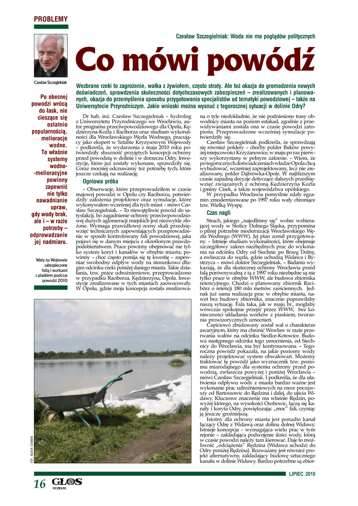 PROBLEMY Czes³aw Szczegielniak: Woda nie ma pogl¹dów politycznych Co mówi powódź Czesław Szczegielniak Po obecnej powodzi wróc¹ do ³ask, nie ciesz¹ce siê ostatnio popularnoœci¹, melioracje wodne. To w³aœnie systemy wodno-melioracyjne powinny zapewniæ nie tylko nawadnianie upraw, gdy wody brak, ale i – w razie potrzeby – odprowadzanie jej nadmiaru. FOT. AGATA COMBIK Wały na Wojnowie zabezpieczone folią i workami z piaskiem podczas powodzi 2010 Wezbrane rzeki to zagro¿enie, walka z ¿ywio³em, czêsto straty. Ale te¿ okazja do gromadzenia nowych doœwiadczeñ, sprawdzenia skutecznoœci dotychczasowych zabezpieczeñ – zrealizowanych i planowanych, okazja do przemyœlenia sposobu przygotowania specjalistów od tematyki powodziowej – tak¿e na Uniwersytecie Przyrodniczym. Jakie wnioski mo¿na wysnuæ z tegorocznej sytuacji w dolinie Odry? Dr hab. inż. Czesław Szczegielniak – hydrolog z Uniwersytetu Przyrodniczego we Wrocławiu, autor programu przeciwpowodziowego dla Opola, Kędzierzyna-Koźla i Raciborza oraz studium wykonalności dla Wrocławskiego Węzła Wodnego, pracujący jako ekspert w Sztabie Kryzysowym Wojewody – podkreśla, że wydarzenia z maja 2010 roku potwierdziły słuszność przyjętych koncepcji ochrony przed powodzią w dolinie i w dorzeczu Odry. Inwestycje, które już zostały wykonane, sprawdziły się. Coraz mocniej odczuwamy też potrzebę tych, które jeszcze czekają na realizację. Ogniowa próba – Obserwacje, które przeprowadziłem w czasie majowej powodzi w Opolu czy Raciborzu, potwierdziły założenia projektowe oraz symulacje, które wykonywałem wcześniej dla tych miast – mówi Czesław Szczegielniak. – To niewątpliwie powód do satysfakcji, bo zagadnienie ochrony przeciwpowodziowej dużych aglomeracji miejskich jest niezwykle złożone. Wymaga prawidłowej oceny skali przedsięwzięć technicznych zapewniających przeprowadzenie w sposób kontrolowany fali powodziowej, jaka pojawi się w danym miejscu z określonym prawdopodobieństwem. Prace powinny obejmować nie tylko system koryt i kanałów w obrębie miasta; powinny – choć często pomija się tę kwestię – zapewniać swobodny odpływ wody na stosunkowo długim odcinku rzeki poniżej danego miasta. Takie działania, tzw. prace udrożnieniowe, przeprowadzono w przypadku Raciborza, Kędzierzyna, Opola. Inwestycje zrealizowane w tych miastach zaowocowały. W Opolu, gdzie moja koncepcja została zrealizowa- na o tyle niedokładnie, że nie podniesiono trasy obwodnicy miasta na poziom estakad, zgodnie z przewidywaniami została ona w czasie powodzi zatopiona. Przeprowadzone wcześniej symulacje potwierdziły się. Czesław Szczegielniak podkreśla, że sprawdzają się również poldery – choćby polder Buków powyżej miejscowości Krzyżanowice, w maju po raz pierwszy wykorzystany w pełnym zakresie. – Wiem, że po tegorocznych doświadczeniach władze Opola chcą wybudować, wcześniej zaprojektowany, lecz nie zrealizowany, polder Dąbrówka-Opole. W najbliższym czasie zapadną decyzje dotyczące dalszych przedsięwzięć związanych z ochroną Kędzierzyna Koźla i gminy Cisek, a także województwa opolskiego. W przypadku Wrocławia pomyślnie zdały egzamin zmodernizowane po 1997 roku wały chroniące tzw. Wielką Wyspę. Czas nagli Strach, jakiego „najedliśmy się” wobec wzbierającej wody w Stolicy Dolnego Śląska, przypomina o pilnej potrzebie modernizacji Wrocławskiego Węzła Wodnego (WWW). Jej plan został przygotowany. – Istnieje studium wykonalności, które obejmuje szczegółowy zakres niezbędnych prac do wykonania na odcinku Odry od Siechnic po Brzeg Dolny, a zwłaszcza do węzła, gdzie uchodzą Widawa i Bystrzyca – mówi doktor Szczegielniak. – Badania wykazują, że dla skutecznej ochrony Wrocławia przed falą porównywalną z tą z 1997 roku niezbędne są nie tylko prace w obrębie WWW, ale budowa zbiornika retencyjnego. Chodzi o planowany zbiornik Racibórz o retencji 180 mln metrów sześciennych. Jednak już sama realizacja prac w obrębie miasta, nawet bez budowy zbiornika, znacznie poprawiłaby naszą sytuację. Fala taka, jak w maju br., mogłaby wówczas spokojnie przejść przez WWW, bez konieczności układania worków z piaskiem, tworzenia prowizorycznych umocnień. Częściowo zbudowany został wał o charakterze awaryjnym, który ma chronić Wrocław w razie przerwania wałów na odcinku Siedlce-Kotowice. Budowa następnego odcinka tego umocnienia, od Siechnicy do Wrocławia, ma być kontynuowana. – Tegoroczna powódź pokazała, na jakie poziomy wody należy projektować system obwałowań. Możemy traktować tę powódź jako wyznacznik tzw. poziomu miarodajnego dla systemu ochrony przed powodzią, zwłaszcza powyżej i poniżej Wrocławia – mówi Czesław Szczegielniak. I podkreśla, że dla ułatwienia odpływu wody z miasta bardzo ważne jest wykonanie prac udrożnieniowych na rzece począwszy od Bartoszowic do Rędzina i dalej, do ujścia Widawy. Kluczowe znaczenie ma właśnie Rędzin, powyżej którego, na wysokości Osobowic, łączą się kanały i koryta Odry, powiększając „moc” fali, czyniąc ją jeszcze groźniejszą. Istotny dla ochrony miasta jest ponadto kanał łączący Odrę z Widawą oraz dolina dolnej Widawy. Istnieje koncepcja – wymagająca wielu prac w tym rejonie – zakładająca podwojenie ilości wody, którą w czasie powodzi należy tam kierować. Daje to możliwość „odciążenia” Rędzina (Widawa uchodzi do Odry poniżej Rędzina). Rozważany jest również projekt alternatywny, zakładający budowę sztucznego kanału w dolinie Widawy. Bardzo potrzebne są zbior- LIPIEC 2010 16 FOT. AGATA COMBIK PROBLEMY Na fot. powyżej zalane boisko w Łanach pod Wrocławiem podczas powodzi 2010 roku niki retencyjne na dopływach Odry – m.in. Nysie Kłodzkiej, Bystrzycy, Ślęży, Widawie – gdzie nie ma jak gromadzić nadmiaru wody. Doktor Szczegielniak podkreśla, że p