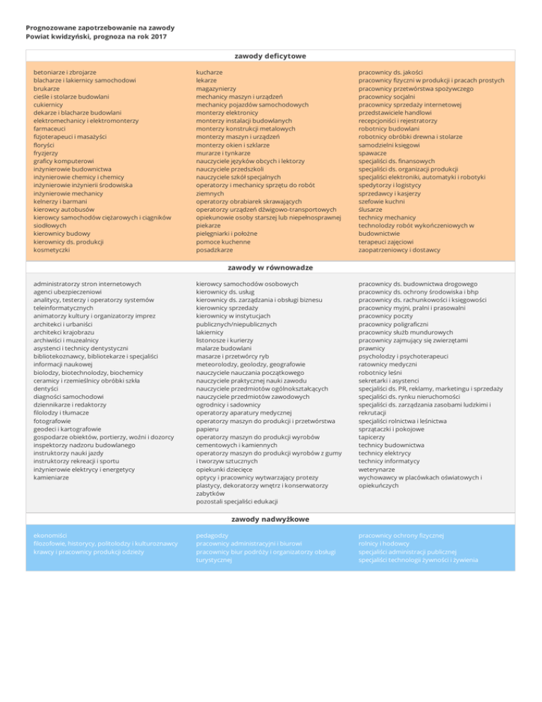 Prognozowane zapotrzebowanie na zawody Powiat kwidzyński, prognoza na rok 2017 zawody deficytowe betoniarze i zbrojarze blacharze i lakiernicy samochodowi brukarze cieśle i stolarze budowlani cukiernicy dekarze i blacharze budowlani elektromechanicy i elektromonterzy farmaceuci fizjoterapeuci i masażyści floryści fryzjerzy graficy komputerowi inżynierowie budownictwa inżynierowie chemicy i chemicy inżynierowie inżynierii środowiska inżynierowie mechanicy kelnerzy i barmani kierowcy autobusów kierowcy samochodów ciężarowych i ciągników siodłowych kierownicy budowy kierownicy ds. produkcji kosmetyczki kucharze lekarze magazynierzy mechanicy maszyn i urządzeń mechanicy pojazdów samochodowych monterzy elektronicy monterzy instalacji budowlanych monterzy konstrukcji metalowych monterzy maszyn i urządzeń monterzy okien i szklarze murarze i tynkarze nauczyciele języków obcych i lektorzy nauczyciele przedszkoli nauczyciele szkół specjalnych operatorzy i mechanicy sprzętu do robót ziemnych operatorzy obrabiarek skrawających operatorzy urządzeń dźwigowo-transportowych opiekunowie osoby starszej lub niepełnosprawnej piekarze pielęgniarki i położne pomoce kuchenne posadzkarze pracownicy ds. jakości pracownicy fizyczni w produkcji i pracach prostych pracownicy przetwórstwa spożywczego pracownicy socjalni pracownicy sprzedaży internetowej przedstawiciele handlowi recepcjoniści i rejestratorzy robotnicy budowlani robotnicy obróbki drewna i stolarze samodzielni księgowi spawacze specjaliści ds. finansowych specjaliści ds. organizacji produkcji specjaliści elektroniki, automatyki i robotyki spedytorzy i logistycy sprzedawcy i kasjerzy szefowie kuchni ślusarze technicy mechanicy technolodzy robót wykończeniowych w budownictwie terapeuci zajęciowi zaopatrzeniowcy i dostawcy zawody w równowadze administratorzy stron internetowych agenci ubezpieczeniowi analitycy, testerzy i operatorzy systemów teleinformatycznych animatorzy kultury i organizatorzy imprez architekci i urbaniści architekci krajobrazu archiwiści i muzealnicy asystenci i technicy dentystyczni bibliotekoznawcy, bibliotekarze i specjaliści informacji naukowej biolodzy, biotechnolodzy, biochemicy ceramicy i rzemieślnicy obróbki szkła dentyści diagności samochodowi dziennikarze i redaktorzy filolodzy i tłumacze fotografowie geodeci i kartografowie gospodarze obiektów, portierzy, woźni i dozorcy inspektorzy nadzoru budowlanego instruktorzy nauki jazdy instruktorzy rekreacji i sportu inżynierowie elektrycy i energetycy kamieniarze kierowcy samochodów osobowych kierownicy ds. usług kierownicy ds. zarządzania i obsługi biznesu kierownicy sprzedaży kierownicy w instytucjach publicznych/niepublicznych lakiernicy listonosze i kurierzy malarze budowlani masarze i przetwórcy ryb meteorolodzy, geolodzy, geografowie nauczyciele nauczania początkowego nauczyciele praktycznej nauki zawodu nauczyciele przedmiotów ogólnokształcących nauczyciele przedmiotów zawodowych ogrodnicy i sadownicy operatorzy aparatury medycznej operatorzy maszyn do produkcji i przetwórstwa papieru operatorzy maszyn do produkcji wyrobów cementowych i kamiennych operatorzy maszyn do produkcji wyrobów z gumy i tworzyw sztucznych opiekunki dziecięce optycy i pracownicy wytwarzający protezy plastycy, dekoratorzy wnętrz i konserwatorzy zabytków pozostali specjaliści edukacji pracownicy ds. budownictwa drogowego pracownicy ds. ochrony środowiska i bhp pracownicy ds. rachunkowości i księgowości pracownicy myjni, pralni i prasowalni pracownicy poczty pracownicy poligraficzni pracownicy służb mundurowych pracownicy zajmujący się zwierzętami prawnicy psycholodzy i psychoterapeuci ratownicy medyczni robotnicy leśni sekretarki i asystenci specjaliści ds. PR, reklamy, marketingu i sprzedaży specjaliści ds. rynku nieruchomości specjaliści ds. zarządzania zasobami ludzkimi i rekrutacji specjaliści rolnictwa i leśnictwa sprzątaczki i pokojowe tapicerzy technicy budownictwa technicy elektrycy technicy informatycy weterynarze wychowawcy w placówkach oświatowych i opiekuńczych zawody nadwyżkowe ekonomiści filozofowie, historycy, politolodzy i kulturoznawcy krawcy i pracownicy produkcji odzieży pedagodzy pracownicy administracyjni i biurowi pracownicy biur podróży i organizatorzy obsługi turystycznej pracownicy ochrony fizycznej rolnicy i hodowcy specjaliści administracji publicznej specjaliści technologii żywności i żywienia