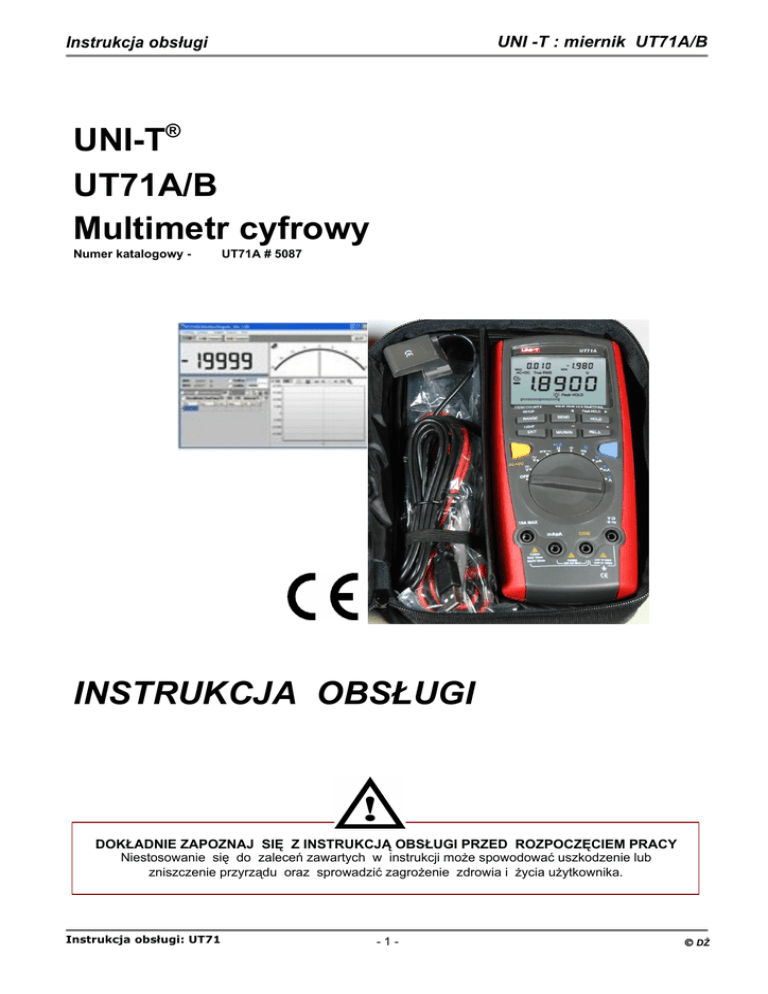 UNI -T : miernik UT71A/B Instrukcja obsługi UNI-T® UT71A/B Multimetr cyfrowy Numer katalogowy - UT71A # 5087 INSTRUKCJA OBSŁUGI DOKŁADNIE ZAPOZNAJ SIĘ Z INSTRUKCJĄ OBSŁUGI PRZED ROZPOCZĘCIEM PRACY Niestosowanie się do zaleceń zawartych w instrukcji może spowodować uszkodzenie lub zniszczenie przyrządu oraz sprowadzić zagrożenie zdrowia i życia użytkownika. Instrukcja obsługi: UT71 -1- DŻ UNI -T : miernik UT71A/B Instrukcja obsługi Rozdział Zawartość Strona Informacje ogólne 1 Wstęp Wyposażenie Bezpieczeństwo użytkowania Międzynarodowe symbole bezpieczeństwa i elektryczne Dane techniczno-eksploatacyjne 2 Dane znamionowe Zasilanie: wskaźnik stanu, oszczędzanie energii [Sleep Mode]. Podświetlenie ekranu LCD. Wymiana baterii i bezpiecznika. 3 4 A) B) C) D) E) F) G) H) I) 5 A) B) C) D) E) F) G) H) I) J) K) 5 5 5 6 6 Opis funkcjonalny Opis panela czołowego Przełącznik obrotowy Przyciski funkcyjne Funkcje miernika a wskazania (ikony) na ekranie LCD Wybór zakresu Opis ekranu LCD Wskaźnik linijkowy (Bar Graph) Stosowanie MAX MIN 7 7 7 7 9 9 10 10 10 Pomiary Pomiar napięcia V DC lub V AC Pomiar prądu A DC lub A AC Pomiar rezystancji Test ciągłości obwodu Test diody (złącza półprzewodnika) Pomiar pojemności Pomiar częstotliwości / cyklu (wypełnienia) Pomiar temperatury [tylko UT71B] Pomiar pętli prądowej 4~20mA [tylko UT71B] 11 12 12 13 13 13 14 14 14 15 Zmiana ustawień fabrycznych. 15 15 Wybór opcji Setup (Ustawienia) 6 3 3 3 3 4 Zakresy pomiarowe i dokładności Pomiar napięcia V DC Pomiar napięcia V AC Pomiar prądu A DC Pomiar prądu A AC (możliwy pomiar AC+DC) Pomiar rezystancji Test ciągłości obwodu Test diody (złącza półprzewodnika) Pomiar pojemności Pomiar częstotliwości Pomiar temperatury [tylko UT71B] Pomiar pętli prądowej 4~20mA [tylko UT71B] Instrukcja obsługi: UT71 -2- 16 16 16 16 16 17 17 17 17 17 18 18 DŻ UNI -T : miernik UT71A/B Instrukcja obsługi 1. INFORMACJE OGÓLNE Wstęp Dziękujemy za zakup miernika UNI-T UT71A/B. Załączona instrukcja obsługi miernika zawiera ważne informacje dotyczące bezpieczeństwa pracy i właściwego użytkowanie miernika. Zalecamy zapoznanie się z instrukcją, w szczególności z uwagami oznaczonymi symbolem Ważna informacja ! Multimetr UNI-T UT71A/B (dalej nazywany miernikiem) posiada funkcje pomiaru napięcia i prądu (stałego i przemiennego, rezystancji, pojemności, częstotliwości, diody, ciągłości obwodu, tryb względny, AC True RMS, AC+DC, wskaźnik rozładowania baterii, dwustopniowe podświetlenie skali, Data Hold, automatyczne wyłączanie zasilania oraz pełne zabezpieczenie przed przeciążeniem. Miernik UT71B ma dodatkowo pomiar temperatury, pętli 4-20mA, tryb magazynowania danych [Data Store] oraz odczyt przechowywanych danych [Data Recall]. Wyposażenie ● ● ● ● Instrukcja obsługi Przewody pomiarowe Przyłącza pomiarowe Przyłącze interfejsu USB 1 1kpl 2kpl 1 ● ● ● ● Płyta CD (program, instrukcja) Futerał ochronny Bateria 9V [NEDA 1604, 6F22, lub 006P] Sonda temperatury: T/C:K [tylko UT71B] 1 1 1 1 W wypadku stwierdzenia niekompletnego wyposażenia proszę skontaktować się ze sprzedawcą Bezpieczeństwo użytkowania Miernik spełnia standardy IEC-61010 bezpieczeństwa pomiarów: dla zakresu ochrony środowiska stopień 2, dla zakresu przeciążeń napięciowych [ CAT III 1000V, CAT.IV 600V ] oraz posiada podwójną izolację. CAT.III: poziom dystrybucji, instalacje mieszane, mniejsze nieustalone przepięcie niż w CAT.IV. CAT.IV: Poziom podstawowy zaopatrzenia, systemy kablowe, linie napowietrzne. Miernik należy używać tylko do pomiarów wyspecyfikowanych (zgodnych) w instrukcji, w przeciwnym wypadku zabezpieczenia miernika mogą być niewystarczające. Zagrożenie: sygnalizuje warunki i czynności, które moga powodować zagrożenie utraty zdrowia lub życia użytkownika. Informuje o sposobach zabezpieczenia się przed porażeniem prądem elektrycznym. UWAGA: sygnalizuje warunki i czynności, które moga powodować uszkodzenie miernika, prowadzące do niedokładnych pomiarów (wskazań). ZAGROŻENIE ! Używanie miernika niezgodnie z instrukcją może spowodować, że zabezpieczenia miernika nie wystarczą do bezpiecznej pracy. Przed rozpoczęciem pracy lub naprawy miernika, należy uważnie zapoznać się z następującymi informacjami. ► Nie doprowadzać do miernika napięć powyżej 1000VDC/AC. ► Nie używać miernika w środowisku wybuchowym (gazy, opary). ► Nie używać miernika w warukach kondensacji wilgoci. ► Podczas pomiarów nie dotykać części metalowych sond pomiarowych. Palce należy trzymać powyżej izolacyjnych osłon tych sond. ► Nie używać miernika, gdy zdjęta jest jego pokrywa lub są wymontowane jakieś części. ► Podczas pomiaru izolacji nie dotykać mierzonego obwodu. Instrukcja obsługi: UT71 -3- DŻ UNI -T : miernik UT71A/B Instrukcja obsługi UWAGA ! ► Przed rozpoczęciem pomiarów dokonać inspekcji miernika (przewodów pomiarowych), czy nie jest uszkodzony. Nie używać miernika w wypadku uszkodzenia mechanicznego, gdy wystają z niego metalowe części, gdy uszkodzona jest plastikowa obudowa. ► Pełna zgodność ze standardami bezpieczeństwa jest gwarantowana tylko, gdy używane są dostarczone w komplecie przewody pomiarowe. W wypadku uszkodzenia, przewody powinny być wymienione na ten sam model lub przewody o takich samych parametrach elektrycznych. ► Nie używać uszkodzonych przewodów pomiarowych. ► Nie dotykać końcówek i gniazd pomiarowych podczas pomiaru. ► Nie wykonywać pomiarów mokrymi rękami oraz w miejscach o dużej wilgotności. Niestosowanie się do zaleceń grozi porażeniem prądem. ► Zachować szczególną ostrożność przy pomiarach powyżej 60VDC lub 30 VACrms ► Nie wolno przekraczać wartości granicznych wielkości elektrycznych podanych dla każdego zakresu pomiarowego. Gdy nie jest znana skala mierzonej wielkości elektrycznej należy do pom