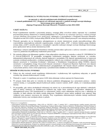 IW-1_19.2_P INSTRUKCJA WYPEŁNIANIA WNIOSKU O PRZYZNANIE POMOCY na operacje w zakresie podejmowania działalności gospodarczej w ramach poddziałania 19.2 „Wsparcie na wdrażanie operacji w ramach strategii rozwoju lokalnego kierowanego przez społeczność” objętego Programem Rozwoju Obszarów Wiejskich na lata 2014-2020 CZĘŚĆ OGÓLNA 1. Przed wypełnieniem wniosku o przyznanie pomocy, zwanego dalej wnioskiem należy zapoznać się z zasadami przyznawania pomocy finansowej w ramach poddziałania 19.2 Wsparcie na wdrażanie operacji w ramach strategii rozwoju lokalnego kierowanego przez społeczność, opisanymi w szczególności z Programie Rozwoju Obszarów Wiejskich na lata 2014-2020, zwanym dalej (PROW na lata 2014-2020) i aktach prawnych1 oraz niniejszą instrukcją. 2. Wniosek sporządza się na formularzu udostępnionym na stronie internetowej urzędu marszałkowskiego albo wojewódzkiej samorządowej jednostki organizacyjnej, zwanych dalej „UM”, z którym lokalna grupa działania (zwana dalej „LGD”) zawarła umowę o warunkach i sposobie realizacji strategii rozwoju lokalnego kierowanego przez społeczność lub na stronie internetowej LGD. Informację o miejscu udostępnienia formularza wniosku zawiera także ogłoszenie o naborze wniosków o udzielenie wsparcia, podawane do publicznej wiadomości przez LGD. 3. Do wniosku dołącza się dokumenty zgodnie z listą załączników określoną we wniosku w sekcji IV. INFORMACJA O ZAŁĄCZNIKACH. W przypadku wystąpienia rozbieżności pomiędzy danymi zawartymi we wniosku, dokumentach dołączonych do wniosku, danymi będącymi w posiadaniu UM, danymi zgromadzonymi w krajowym systemie ewidencji producentów, ewidencji gospodarstw rolnych oraz ewidencji wniosków o przyznanie płatności, danymi zawartymi w Centralnej Ewidencji i Informacji o Działalności Gospodarczej (dalej CEIDG), danymi zawartymi w przeglądarce ksiąg wieczystych danymi zawartymi w Krajowym Rejestrze Sądowym oraz danymi zawartymi w innych publicznych elektronicznych przeglądarkach lub bazach danych podmiot ubiegający się o przyznanie pomocy może zostać poproszony o przedstawienie dodatkowych dokumentów. SPOSÓB WYPEŁNIANIA WNIOSKU 4. Zaleca się, aby wniosek został wypełniony elektronicznie i wydrukowany lub wypełniony odręcznie, w sposób czytelny (np. pismem drukowanym) i trwały. 5. Wniosek w części A wypełniany jest przez LGD, która dokonuje wyboru operacji do finansowania. 6. W sytuacji, kiedy dane pole we wniosku nie dotyczy podmiotu ubiegającego się o przyznanie pomocy - należy wstawić kreskę, a w przypadku danych liczbowych należy wstawić wartość „0,00”, chyba, że w instrukcji podano inaczej. 7. W przypadku, gdy zakres niezbędnych informacji nie mieści się w przewidzianych do tego tabelach i rubrykach, dane te należy zamieścić na dodatkowych kartkach (np. kopie stron wniosku i załączników składanych na udostępnionych przez UM formularzach) ze wskazaniem, której części dokumentu dotyczą oraz z adnotacją na wniosku, że dana rubryka lub tabela została dołączona. Dodatkowe strony należy podpisać oraz opatrzyć datą i dołączyć przy pomocy zszywacza do wniosku. Przy wypełnianiu elektronicznym wniosku istnieje możliwość dodawania wierszy oraz zawijania tekstu w polach. 1 Dotyczy to w szczególności: - rozporządzenia Parlamentu Europejskiego i Rady (UE) nr 1303/2013 z dnia 17 grudnia 2013 r. ustanawiającego wspólne przepisy dotyczące Europejskiego Funduszu Rozwoju Regionalnego, Europejskiego Funduszu Społecznego, Funduszu Spójności, Europejskiego Funduszu Rolnego na rzecz Rozwoju Obszarów Wiejskich oraz Europejskiego Funduszu Morskiego i Rybackiego oraz ustanawiającego przepisy ogólne dotyczące Europejskiego Funduszu Rozwoju Regionalnego, Europejskiego Funduszu Społecznego, Funduszu Spójności i Europejskiego Funduszu Morskiego i Rybackiego oraz uchylające rozporządzenie Rady (WE) nr 1083/2006 (Dz. Urz. UE L 347 z 20.12.2013 str. 320, z późn. zm.), - rozporządzenia Parlamentu Europejskiego i Rady (UE) nr 1305/2013 z dnia 17 grudnia 2013 r. w sprawie wsparcia rozwoju obszarów wiejskich przez Europejski Fundusz Rolny na rzecz Rozwoju Obszarów Wiejskich (EFRROW) i uchylającego rozporządzenie Rady (WE) nr 1698/2005 (Dz. Urz. UE L 347 z 20.12.2013, str. 487, z późn. zm.), - ustawy z dnia 20 lutego 2015r. o wspieraniu rozwoju obszarów wiejskich z udziałem środków Europejskiego Funduszu Rolnego na rzecz Rozwoju Obszarów Wiejskich w ramach Programu Rozwoju Obszarów Wiejskich na lata 2014-2020 (Dz. U. poz. 349 i 1888 oraz z 2016 r. poz. 337), - ustawy z dnia 20 lutego 2015 r. o rozwoju lokalnym z udziałem lokalnej społeczności (Dz. U. poz. 378), - ustawy z dnia 27 maja 2015 o finansowaniu wspólnej polityki rolnej (Dz. U. poz. 1130 i z 2016 r. poz. 848), - rozporządzenia Ministra Rolnictwa i Rozwoju Wsi z dnia 24 września 2015 r. w sprawie szczegółowych warunków i trybu przyznawania pomocy finansowej w ramach poddziałania „Wsparcie na wdrażanie operacji w ramach strategii rozwoju lokalnego kierowanego przez społeczność” objętego Programem Rozwoju Obszarów Wiejskich na lata 2014–2020 (Dz. U. poz. 1570 z późn. zm.), zwanego dalej rozporządzeniem. PROW 2014-2020_19.2_P/2z Strona 1 z 16 8. Przed złożeniem wniosku należy upewnić się, czy: a) wniosek został podpisany w wyznaczonych do tego miejscach przez podmiot ubiegający się o przyznanie pomocy, pełnomocnika podmiotu ubiegającego się o przyznanie pomocy, b) wypełnione zostały wszystkie wymagane pola wniosku, c) załączone zostały wszystkie wymagane dokumenty (zgodnie z sekcją V. INFORMACJA O ZAŁĄCZNIKACH wniosku). 8. Dane finansowe podawane we wniosku, wyrażone są w złotych. Zaleca się podanie ich z dokładnością do dwóch miejsc po przecinku, za wyjątkiem wnioskowanej kwoty pomocy którą należy zaokrąglić w dół do pełnych złotych (obcięcie groszy). ZŁOŻENIE