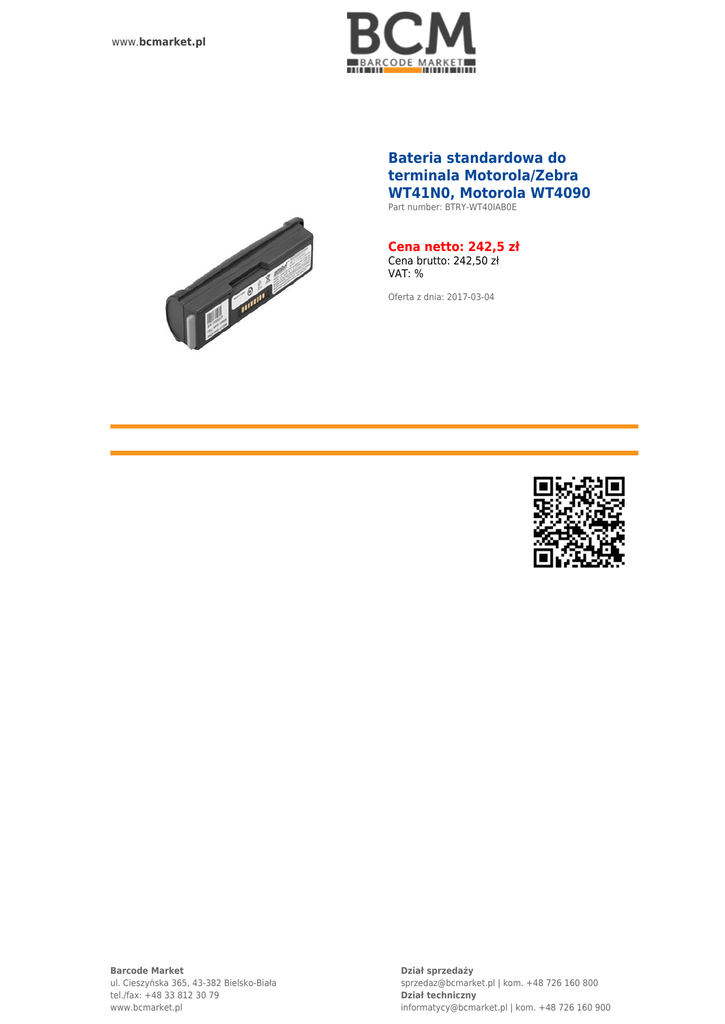 www.bcmarket.pl Bateria standardowa do terminala Motorola/Zebra WT41N0, Motorola WT4090 Part number: BTRY-WT40IAB0E Cena netto: 242,5 zł Cena brutto: 242,50 zł VAT: % Oferta z dnia: 2017-03-04 Barcode Market ul. Cieszyńska 365, 43-382 Bielsko-Biała tel./fax: +48 33 812 30 79 www.bcmarket.pl Dział sprzedaży [email protected] | kom. +48 726 160 800 Dział techniczny [email protected] | kom. +48 726 160 900