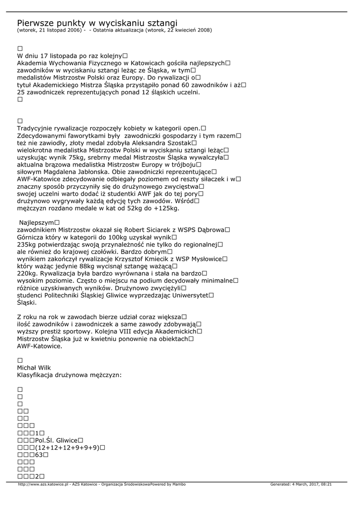 Pierwsze punkty w wyciskaniu sztangi (wtorek, 21 listopad 2006) - - Ostatnia aktualizacja (wtorek, 22 kwiecień 2008) W dniu 17 listopada po raz kolejny Akademia Wychowania Fizycznego w Katowicach gościła najlepszych zawodników w wyciskaniu sztangi leżąc ze Śląska, w tym medalistów Mistrzostw Polski oraz Europy. Do rywalizacji o tytuł Akademickiego Mistrza Śląska przystąpiło ponad 60 zawodników i aż 25 zawodniczek reprezentujących ponad 12 śląskich uczelni. Tradycyjnie rywalizacje rozpoczęły kobiety w kategorii open. Zdecydowanymi faworytkami były zawodniczki gospodarzy i tym razem też nie zawiodły, złoty medal zdobyła Aleksandra Szostak wielokrotna medalistka Mistrzostw Polski w wyciskaniu sztangi leżąc uzyskując wynik 75kg, srebrny medal Mistrzostw Śląska wywalczyła aktualna brązowa medalistka Mistrzostw Europy w trójboju siłowym Magdalena Jabłonska. Obie zawodniczki reprezentujące AWF-Katowice zdecydowanie odbiegały poziomem od reszty siłaczek i w znaczny sposób przyczyniły się do drużynowego zwycięstwa swojej uczelni warto dodać iż studentki AWF jak do tej pory drużynowo wygrywały każdą edycję tych zawodów. Wśród mężczyzn rozdano medale w kat od 52kg do +125kg. Najlepszym zawodnikiem Mistrzostw okazał się Robert Siciarek z WSPS Dąbrowa Górnicza który w kategorii do 100kg uzyskał wynik 235kg potwierdzając swoją przynależność nie tylko do regionalnej ale również do krajowej czołówki. Bardzo dobrym wynikiem zakończył rywalizacje Krzysztof Kmiecik z WSP Mysłowice który ważąc jedynie 88kg wycisnął sztangę ważącą 220kg. Rywalizacja była bardzo wyrównana i stała na bardzo wysokim poziomie. Często o miejscu na podium decydowały minimalne różnice uzyskiwanych wyników. Drużynowo zwyciężyli studenci Politechniki Śląskiej Gliwice wyprzedzając Uniwersytet Śląski. Z roku na rok w zawodach bierze udział coraz większa ilość zawodników i zawodniczek a same zawody zdobywają wyższy prestiż sportowy. Kolejna VIII edycja Akademickich Mistrzostw Śląska już w kwietniu ponownie na obiektach AWF-Katowice. Michał Wilk Klasyfikacja drużynowa mężczyzn: 1 Pol.Śl. Gliwice (12+12+12+9+9+9) 63 2 http://www.azs.katowice.pl - AZS Katowice - Organizacja ŚrodowiskowaPowered by Mambo Generated: 4 March, 2017, 08:21 UŚ Katowice (12+9+9+7+5+4) 46 3 WSB Chorzów (12+9+7+6+6+4) 44 4 AWF-Katowice (12+8+8+7+5) 40 5 Pol. Śl. Katowice (9+8+12) 29 6 AE-Katowcie (12+8+5) 25 7 GWSP Mysłowice (12+9) 21 8 GWSP Chorzów (8+6+2+2+1) 19 9 Pol. Częstochowska 12 12 10 WSPS Dąbrowa G. 12 12 11 WSEiA Bytom 8 8 12 http://www.azs.katowice.pl - AZS Katowice - Organizacja ŚrodowiskowaPowered by Mambo Generated: 4 March, 2017, 08:21 WSB D.Górnicza (3+1) 4 Klasyfikacja drużynowa kobiet: 1 AWF- Katowice 356,94 pkt wilks 2 Pol. Śląska Gliwice 244,1 pkt wilks 3 WSB D.Górnicza 182,11 pkt wilks 4 GWSP Chorzów 120,9 pkt wilks 5 WSB Chorzów 34,81 pkt wilks Zobacz wyniki zawodów (60.65 KB 21.11.2006 10:58) ZOBACZ GALERIĘ ZDJĘĆ http://www.azs.katowice.pl - AZS Katowice - Organizacja ŚrodowiskowaPowered by Mambo Generated: 4 March, 2017, 08:21