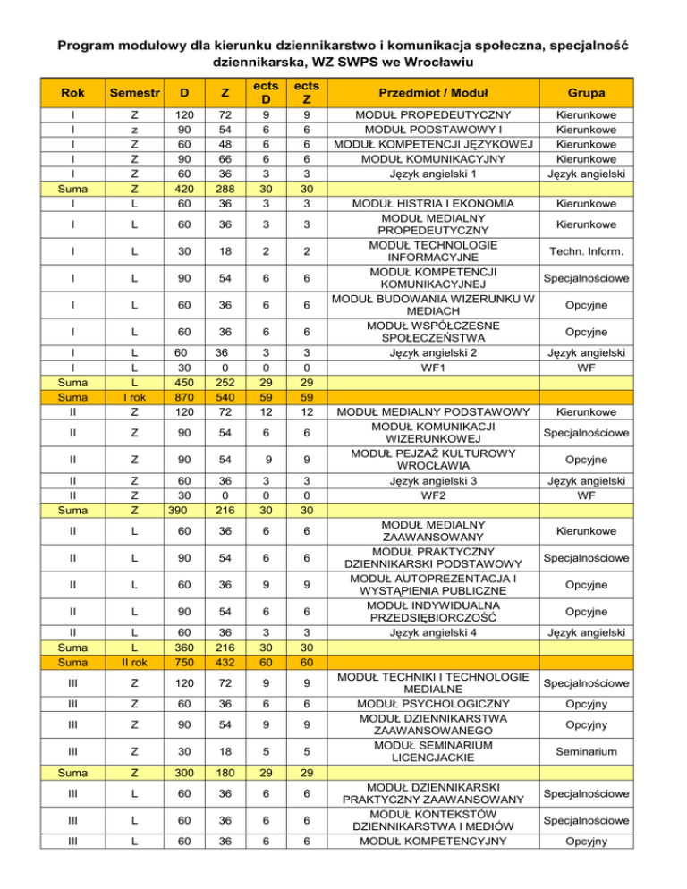 Program modułowy dla kierunku dziennikarstwo i komunikacja