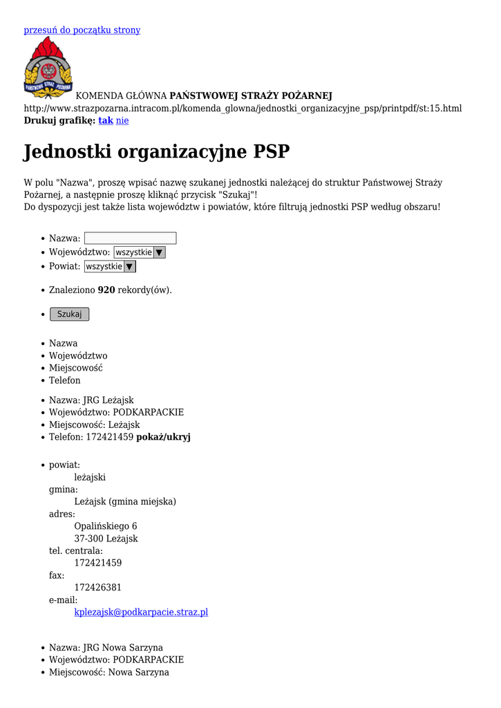 przesuń do początku strony KOMENDA GŁÓWNA PAŃSTWOWEJ STRAŻY POŻARNEJ http://www.strazpozarna.intracom.pl/komenda_glowna/jednostki_organizacyjne_psp/printpdf/st:15.html Drukuj grafikę: tak nie Jednostki organizacyjne PSP W polu "Nazwa", proszę wpisać nazwę szukanej jednostki należącej do struktur Państwowej Straży Pożarnej, a następnie proszę kliknąć przycisk "Szukaj"! Do dyspozycji jest także lista województw i powiatów, które filtrują jednostki PSP według obszaru! Nazwa: Województwo: wszystkie ▼ Powiat: wszystkie ▼ Znaleziono 920 rekordy(ów). Szukaj Nazwa Województwo Miejscowość Telefon Nazwa: JRG Leżajsk Województwo: PODKARPACKIE Miejscowość: Leżajsk Telefon: 172421459 pokaż/ukryj powiat: leżajski gmina: Leżajsk (gmina miejska) adres: Opalińskiego 6 37-300 Leżajsk tel. centrala: 172421459 fax: 172426381 e-mail: [email protected] Nazwa: JRG Nowa Sarzyna Województwo: PODKARPACKIE Miejscowość: Nowa Sarzyna Telefon: 172411466 pokaż/ukryj powiat: leżajski gmina: Nowa Sarzyna adres: Chemików 5 37-310 Nowa Sarzyna tel. centrala: 172411466 fax: 172411466 wew.: ___62 e-mail: [email protected] Nazwa: JRG Lubaczów Województwo: PODKARPACKIE Miejscowość: Lubaczów Telefon: pokaż/ukryj powiat: lubaczowski gmina: Lubaczów (gmina miejska) adres: Sobieskiego 13 37-600 Lubaczów tel. stanowisko kierowania: 166322183 fax: 166325021 e-mail: [email protected] www: www.kppsplubaczow.internetdsl.pl Nazwa: JRG Łańcut Województwo: PODKARPACKIE Miejscowość: Łańcut Telefon: pokaż/ukryj powiat: łańcucki gmina: Łańcut (gmina miejska) adres: Grunwaldzka 68 37-100 Łańcut tel. stanowisko kierowania: 172254606 wew.: 56___ fax: 172254003 e-mail: [email protected] www: www.kplancut.ires.pl Nazwa: JRG 1 Mielec Województwo: PODKARPACKIE Miejscowość: Mielec Telefon: 177800970 wew.: 17780 pokaż/ukryj powiat: mielecki gmina: Mielec (gmina miejska) adres: Sienkiewicza 54 39-300 Mielec tel. centrala: 177800970 wew.: 17780 tel. stanowisko kierowania: 177800949 wew.: 17780 fax: 177800995 wew.: 17780 Nazwa: JRG 2 Mielec Województwo: PODKARPACKIE Miejscowość: Mielec Telefon: 177800960 wew.: 17780 pokaż/ukryj powiat: mielecki gmina: Mielec (gmina miejska) adres: Wojska Polskiego 3 39-300 Mielec tel. centrala: 177800960 wew.: 17780 tel. stanowisko kierowania: 177800960 wew.: 17780 fax: 177800965 wew.: 17780 Nazwa: JRG Nisko Województwo: PODKARPACKIE Miejscowość: Nisko Telefon: 158412140 pokaż/ukryj powiat: niżański gmina: Nisko adres: Nowa 42 37-400 Nisko tel. centrala: 158412140 tel. stanowisko kierowania: 158412140 fax: 158414998 e-mail: [email protected] www: www.nisko-straz.itl.pl Nazwa: JRG Przemyśl Województwo: PODKARPACKIE Miejscowość: Przemyśl Telefon: pokaż/ukryj powiat: przemyski gmina: Przemyśl adres: Pl. Św. Floriana 1 37-700 Przemyśl tel. stanowisko kierowania: 166764600 fax: 166764602 e-mail: [email protected] www: przemysl.kmpsp.gov.pl Nazwa: JRG Przeworsk Województwo: PODKARPACKIE Miejscowość: Przeworsk Telefon: 166488233 pokaż/ukryj powiat: przeworski gmina: Przeworsk (gmina miejska) adres: Ignacego Krasickiego 7 37-200 Przeworsk tel. centrala: 166488233 tel. stanowisko kierowania: 166491180 fax: 166490170 www: www.przeworsk.info Nazwa: JRG Ropczyce Województwo: PODKARPACKIE Miejscowość: Ropczyce Telefon: 172210151 pokaż/ukryj powiat: ropczycko-sędziszowski gmina: Ropczyce adres: Św.Floriana 6 39-100 Ropczyce tel. centrala: 172210151 tel. stanowisko kierowania: 172218597 fax: 172227572 e-mail: [email protected] www: www.pspropczyce.pl Nazwa: JRG Sanok Województwo: PODKARPACKIE Miejscowość: Sanok Telefon: 134631190 pokaż/ukryj powiat: sanocki gmina: Sanok (gmina miejska) adres: Wincentego Witosa 60 38-500 Sanok tel. centrala: 134631190 tel. stanowisko kierowania: 134658998 fax: 134658910 e-mail: [email protected] www: www.straz.sanok.pl Nazwa: JRG nr 1 Stalowa Wola Województwo: PODKARPACKIE Miejscowość: Stalowa Wola Telefon: 158426511 pokaż/ukryj powiat: stalowowolski gmina: Stalowa Wola adres: Jana Pawła II 27 37-450 Stalowa Wola tel. centrala: 158426511 tel. stanowisko kierowania: 158426511 fax: 158426511 Nazwa: JRG nr 2 Stalowa Wola Województwo: PODKARPACKIE Miejscowość: Stalowa Wola Telefon: 158448917 wew.: 15844 pokaż/ukryj powiat: stalowowolski gmina: Stalowa Wola adres: Kwiatkowskiego 1 a 37-450 Stalowa Wola tel. centrala: 158448917 wew.: 15844 tel. stanowisko kierowania: 158448917 wew.: 15844 fax: 158448917 wew.: 15844 Nazwa: JRG Strzyżów Województwo: PODKARPACKIE Miejscowość: Strzyżów Telefon: 172761001 pokaż/ukryj powiat: strzyżowski gmina: Strzyżów adres: Sportowa 20 38-100 Strzyżów tel. centrala: 172761001 tel. stanowisko kierowania: 172760088 fax: 172760088 wew.: 405 e-mail: [email protected] Nazwa: JRG Tarnobrzeg Województwo: PODKARPACKIE Miejscowość: Tarnobrzeg Telefon: 158233568 wew.: 500__ pokaż/ukryj powiat: Tarnobrzeg gmina: Tarnobrzeg adres: Targowa 3 39-400 Tarnobrzeg tel. centrala: 158233568 wew.: 500__ tel. stanowisko kierowania: 158233568 wew.: 500__ fax: 158233568 wew.: 501__ Nazwa: JRG Nowa Dęba Województwo: PODKARPACKIE Miejscowość: Nowa Dęba Telefon: pokaż/ukryj powiat: tarnobrzeski gmina: Nowa Dęba adres: Szypowskiego 3 39-460 Nowa Dęba tel. stanowisko kierowania: 158465101 fax: 158465101 wew.: 69___ e-mail: [email protected] Nazwa: JRG Ustrzyki Dolne Województwo: PODKARPACKIE Miejscowość: Ustrzyki Dolne Telefon: 134608798 pokaż/ukryj powiat: bieszczadzki gmina: Ustrzyki Dolne adres: 1 Maja 22 38-700 Ustrzyki Dolne tel. centrala: 134608798 tel. stanowisko kierowania: 134611048 fax: 134608797 e-mail: [email protected] www: www.kppspustrzyki.itl.pl Nazwa: JRG Lesko Województwo: PODKARPACKIE Miejscowość: Lesko Telefon: pokaż/ukryj powiat: leski gmina: Lesko adres: Jana Pawła II 2 38-600 Lesko tel. stanowisko kierowania: 134696291 fax: 134696997 e-mail: [email protected] www: www.kppsplesko.itl.pl Nazwa: JRG nr 1 Białystok Województwo: PODLAS
