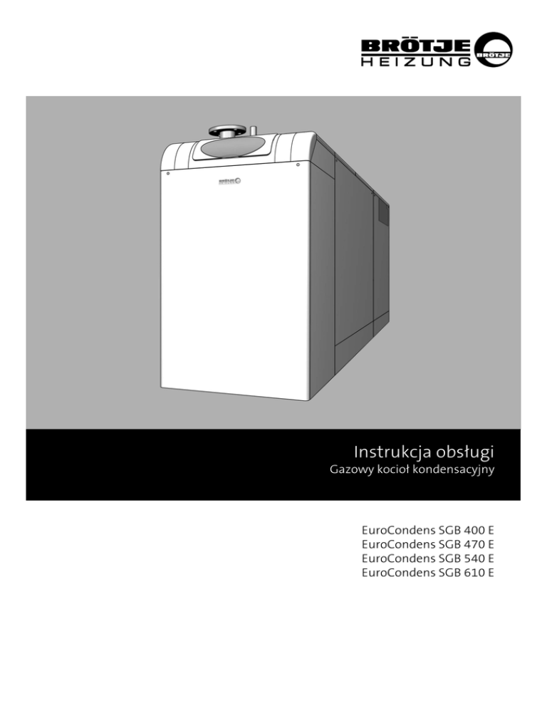 Instrukcja obsługi Gazowy kocioł kondensacyjny EuroCondens SGB 400 E EuroCondens SGB 470 E EuroCondens SGB 540 E EuroCondens SGB 610 E Spis treści 2 1. Uwagi dotyczące niniejszej instrukcji obsługi......................................................................................... 1.1 Treść niniejszej instrukcji obsługi............................................................................................... 1.2 Tabela zbiorcza........................................................................................................................ 1.3 Zastosowane symbole.............................................................................................................. 1.4 Dla kogo przeznaczona jest niniejsza instrukcja obsługi?.............................................................. 4 4 4 5 5 2. Bezpieczeństwo.................................................................................................................................. 2.1 Zastosowanie zgodnie z przeznaczeniem.................................................................................... 2.2 Ogólne wskazówki dotyczące bezpieczeństwa............................................................................ 2.3 Oznakowanie znakiem CE......................................................................................................... 6 6 6 7 3. Informacja ogólna............................................................................................................................... 3.1 Rysunek poglądowy kotła SGB E................................................................................................. 8 8 4. Obsługa.............................................................................................................................................. 4.1 Elementy obsługi...................................................................................................................... 4.2 Wyświetlane komunikaty.......................................................................................................... 4.3 Włączanie ogrzewania.............................................................................................................. 4.4 Praca w trybie podgrzewania c.w.u............................................................................................. 4.5 Regulacja temperatury zadanej w pomieszczeniu........................................................................ 4.6 Wyświetlanie informacji........................................................................................................... 4.7 Komunikat o wystąpieniu zakłócenia w pracy............................................................................. 4.8 Komunikat o konieczności przeprowadzenia konserwacji............................................................. 4.9 Tryb awaryjny (tryb ręczny)....................................................................................................... 4.10 Przywrócenie nastaw fabrycznych.............................................................................................. 9 9 10 10 11 12 12 13 13 14 14 5. Rozruch.............................................................................................................................................. 5.1 Kontrola ciśnienia wody............................................................................................................ 5.2 Uzupełnianie i spuszczanie wody z instalacji............................................................................... 5.3 Włączanie kotła....................................................................................................................... 5.4 Temperatura w instalacji c.o. i c.w.u........................................................................................... 5.5 Indywidualny program sterowania zegarowego.......................................................................... 15 15 15 16 17 17 6. Programowanie.................................................................................................................................. 6.1 Sposób programowania regulatora............................................................................................ 6.2 Zmiana parametrów................................................................................................................. 6.3 Tabela nastaw.......................................................................................................................... 6.4 Czas zegarowy i data................................................................................................................ 6.5 Jednostki................................................................................................................................. 6.6 Programy................................................................................................................................. 6.7 Programy wakacyjne................................................................................................................. 6.8 Wartości zadane temperatury w pomieszczeniu.......................................................................... 6.9 Dostosowywanie sposobu pracy instalacji ogrzewania................................................................. 6.10 Zmiana krzywej grzania............................................................................................................ 6.11 Temp. graniczna lato/zima........................................................................................................ 6.12 Tryb pracy-c.w.u....................................................................................................................... 6.13 Temperatura c.w.u.................................................................................................................... 6.14 Podgrzewanie c.w.u............................................................................