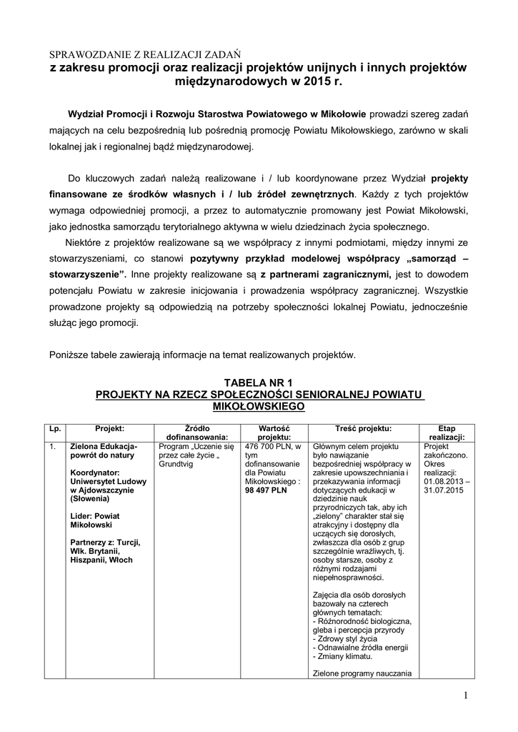 SPRAWOZDANIE Z REALIZACJI ZADAŃ z zakresu promocji oraz realizacji projektów unijnych i innych projektów międzynarodowych w 2015 r. Wydział Promocji i Rozwoju Starostwa Powiatowego w Mikołowie prowadzi szereg zadań mających na celu bezpośrednią lub pośrednią promocję Powiatu Mikołowskiego, zarówno w skali lokalnej jak i regionalnej bądź międzynarodowej. Do kluczowych zadań należą realizowane i / lub koordynowane przez Wydział projekty finansowane ze środków własnych i / lub źródeł zewnętrznych. Każdy z tych projektów wymaga odpowiedniej promocji, a przez to automatycznie promowany jest Powiat Mikołowski, jako jednostka samorządu terytorialnego aktywna w wielu dziedzinach życia społecznego. Niektóre z projektów realizowane są we współpracy z innymi podmiotami, między innymi ze stowarzyszeniami, co stanowi pozytywny przykład modelowej współpracy „samorząd – stowarzyszenie”. Inne projekty realizowane są z partnerami zagranicznymi, jest to dowodem potencjału Powiatu w zakresie inicjowania i prowadzenia współpracy zagranicznej. Wszystkie prowadzone projekty są odpowiedzią na potrzeby społeczności lokalnej Powiatu, jednocześnie służąc jego promocji. Poniższe tabele zawierają informacje na temat realizowanych projektów. TABELA NR 1 PROJEKTY NA RZECZ SPOŁECZNOŚCI SENIORALNEJ POWIATU MIKOŁOWSKIEGO Lp. 1. Projekt: Zielona Edukacjapowrót do natury Koordynator: Uniwersytet Ludowy w Ajdowszczynie (Słowenia) Lider: Powiat Mikołowski Partnerzy z: Turcji, Wlk. Brytanii, Hiszpanii, Włoch Źródło dofinansowania: Program „Uczenie się przez całe życie „ Grundtvig Wartość projektu: 476 700 PLN, w tym dofinansowanie dla Powiatu Mikołowskiego : 98 497 PLN Treść projektu: Głównym celem projektu było nawiązanie bezpośredniej współpracy w zakresie upowszechniania i przekazywania informacji dotyczących edukacji w dziedzinie nauk przyrodniczych tak, aby ich „zielony” charakter stał się atrakcyjny i dostępny dla uczących się dorosłych, zwłaszcza dla osób z grup szczególnie wrażliwych, tj. osoby starsze, osoby z różnymi rodzajami niepełnosprawności. Etap realizacji: Projekt zakończono. Okres realizacji: 01.08.2013 – 31.07.2015 Zajęcia dla osób dorosłych bazowały na czterech głównych tematach: - Różnorodność biologiczna, gleba i percepcja przyrody - Zdrowy styl życia - Odnawialne źródła energii - Zmiany klimatu. Zielone programy nauczania 1 dotyczyły m.in. zagadnień dot. podstaw komputerowych i Internetu, sportu na świeżym powietrzu i rekreacji w parkach i ogrodach, korzystania z natury jako narzędzia edukacji i terapii, itp. Zrealizowano: 7 bloków programowych z zakresu „zielonej edukacji”; w zajęciach wzięło udział 86 słuchaczy PUTW TABELA NR 2 PROGRAMY NA RZECZ ROZWOJU SZKÓŁ POWIATOWYCH Lp. 1. Projekt: Nowoczesne Liceum II – Program Rozwoju Szkół Ogólnokształcących Powiatu Mikołowskiego Źródło dofinansowania: Program Operacyjny Kapitał Ludzki, Działanie 9.1 Wyrównywanie szans edukacyjnych i zapewnienie wysokiej jakości usług edukacyjnych świadczonych w systemie oświaty, Poddziałanie 9.1.2 Wyrównywanie szans edukacyjnych uczniów z grup o utrudnionym dostępie do edukacji oraz zmniejszanie różnic w jakości usług edukacyjnych. Wartość projektu: 652.389,37 zł w tym: Europejski Fundusz Społeczny: 600 198,22 PLN Treść projektu: Projekt miał na celu kompleksowe rozszerzenie oferty edukacyjnej i trwałe podniesienie jakości usług oświatowych świadczonych przez szkoły prowadzące kształcenie ogólne (I i II LO w Mikołowie). W ramach projektu zrealizowano: - spotkania informacyjne, na których wygłoszono prelekcje dotyczące równości szans kobiet i mężczyzn na rynku pracy oraz kompetencji kluczowych, - zajęcia dodatkowe z zakresu kompetencji kluczowych (informatyka, język angielski, język niemiecki, język francuski, język rosyjski, język hiszpański, przedsiębiorczość, matematyka, przedmioty przyrodnicze). Dla każdego uczestnika/uczestniczki projektu przewidziano udział w jednym rodzaju zajęć oraz przekazano zestaw podręczników. - Program wsparcia psychologicznopedagogicznego, w ramach którego przeprowadzono 1,5godzinne indywidualne wsparcie pedagoga szkolnego oraz Program Przeciwko Patologiom Społecznym. Programem objęto105 osób. - Innowacyjny program doradztwa zawodowego skierowany do wszystkich uczniów/uczennic biorących udział w projekcie. Składał się z 8-godzinnych warsztatów pn. „Innowacyjn@ Szkoł@” i indywidualnego doradztwa zawodowego, a jego założenia Etap realizacji: Projekt zakończony . Okres realizacji: 01.08.201330.04.2015r . 2 to wdrożenie innowacyjnych form nauczania o wyższej skuteczności niż formy tradycyjne, wykorzystanie metod pracy bazujących na sprzęcie ICT (tablice interaktywne, filmy, piloty, gry symulacyjne, platforma elearningowa, lekcje multimedialne). W każdej szkole zorganizowano konferencję końcową pn. „Edukacja i praca – globalnie, regionalnie, lokalnie.” Projekt objął 570 uczniów/uczennic i 30 nauczycieli. Liczba przeprowadzonych godzin wsparcia: 2201,50h W ramach projektu uczestnicy otrzymali: - zestawy promocyjne (długopis, notatnik, smycz z USB, teczka z nadrukiem), - zestawy podręczników z zakresu kompetencji kluczowych. W ramach projektu szkoły otrzymały nowoczesne pomoce dydaktyczne. 2. Kompleksowa Edukacja Specjalna – Program Rozwoju Szkół Specjalnych Powiatu Mikołowskiego Program Operacyjny Kapitał Ludzki 20072013, Priorytet IX Rozwój wykształcenia i kompetencji w regionach, Działanie 9.1 Wyrównywanie szans edukacyjnych i zapewnienie wysokiej jakości usług edukacyjnych świadczonych w systemie oświaty, Poddziałanie 9.1.2 Wyrównywanie szans edukacyjnych uczniów z grup o utrudnionym dostępie do edukacji oraz zmniejszanie różnic w jakości usług edukacyjnych Wartość projektu 793 334,52 PLN, w tym dofinansowani e 698 134,38 