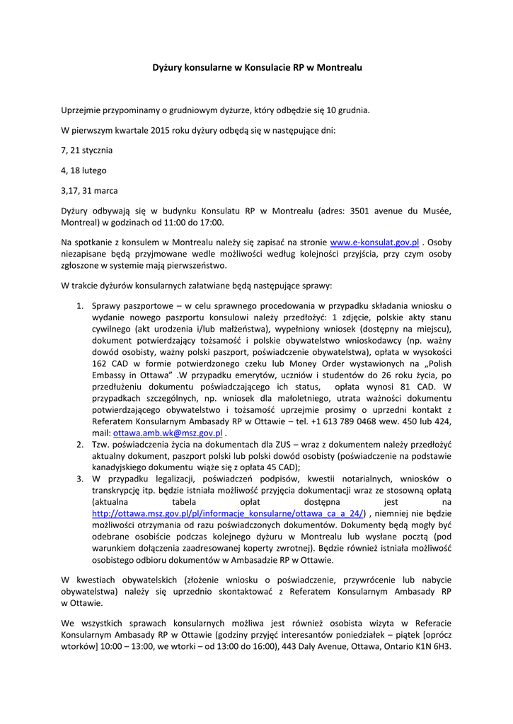 Dyżury konsularne w Konsulacie RP w Montrealu Uprzejmie przypominamy o grudniowym dyżurze, który odbędzie się 10 grudnia. W pierwszym kwartale 2015 roku dyżury odbędą się w następujące dni: 7, 21 stycznia 4, 18 lutego 3,17, 31 marca Dyżury odbywają się w budynku Konsulatu RP w Montrealu (adres: 3501 avenue du Musée, Montreal) w godzinach od 11:00 do 17:00. Na spotkanie z konsulem w Montrealu należy się zapisad na stronie www.e-konsulat.gov.pl . Osoby niezapisane będą przyjmowane wedle możliwości według kolejności przyjścia, przy czym osoby zgłoszone w systemie mają pierwszeostwo. W trakcie dyżurów konsularnych załatwiane będą następujące sprawy: 1. Sprawy paszportowe – w celu sprawnego procedowania w przypadku składania wniosku o wydanie nowego paszportu konsulowi należy przedłożyd: 1 zdjęcie, polskie akty stanu cywilnego (akt urodzenia i/lub małżeostwa), wypełniony wniosek (dostępny na miejscu), dokument potwierdzający tożsamośd i polskie obywatelstwo wnioskodawcy (np. ważny dowód osobisty, ważny polski paszport, poświadczenie obywatelstwa), opłata w wysokości 162 CAD w formie potwierdzonego czeku lub Money Order wystawionych na „Polish Embassy in Ottawa” .W przypadku emerytów, uczniów i studentów do 26 roku życia, po przedłużeniu dokumentu poświadczającego ich status, opłata wynosi 81 CAD. W przypadkach szczególnych, np. wniosek dla małoletniego, utrata ważności dokumentu potwierdzającego obywatelstwo i tożsamośd uprzejmie prosimy o uprzedni kontakt z Referatem Konsularnym Ambasady RP w Ottawie – tel. +1 613 789 0468 wew. 450 lub 424, mail: [email protected] . 2. Tzw. poświadczenia życia na dokumentach dla ZUS – wraz z dokumentem należy przedłożyd aktualny dokument, paszport polski lub polski dowód osobisty (poświadczenie na podstawie kanadyjskiego dokumentu wiąże się z opłata 45 CAD); 3. W przypadku legalizacji, poświadczeo podpisów, kwestii notarialnych, wniosków o transkrypcję itp. będzie istniała możliwośd przyjęcia dokumentacji wraz ze stosowną opłatą (aktualna tabela opłat dostępna jest na http://ottawa.msz.gov.pl/pl/informacje_konsularne/ottawa_ca_a_24/) , niemniej nie będzie możliwości otrzymania od razu poświadczonych dokumentów. Dokumenty będą mogły byd odebrane osobiście podczas kolejnego dyżuru w Montrealu lub wysłane pocztą (pod warunkiem dołączenia zaadresowanej koperty zwrotnej). Będzie również istniała możliwośd osobistego odbioru dokumentów w Ambasadzie RP w Ottawie. W kwestiach obywatelskich (złożenie wniosku o poświadczenie, przywrócenie lub nabycie obywatelstwa) należy się uprzednio skontaktowad z Referatem Konsularnym Ambasady RP w Ottawie. We wszystkich sprawach konsularnych możliwa jest również osobista wizyta w Referacie Konsularnym Ambasady RP w Ottawie (godziny przyjęd interesantów poniedziałek – piątek *oprócz wtorków] 10:00 – 13:00, we wtorki – od 13:00 do 16:00), 443 Daly Avenue, Ottawa, Ontario K1N 6H3. W przypadku jakichkolwiek pytao dotyczących nowej procedury załatwiania spraw lub wszelkich innych informacji konsularnych proszę kontaktowad się z Referatem Konsularnym Ambasady RP w Ottawie – tel. +1 613 789 0468 wew. 450 lub 424, mail: [email protected].