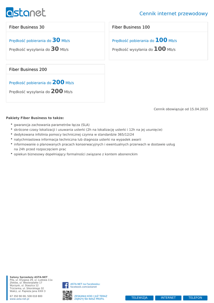 Cennik internet przewodowy Fiber Business 30 Fiber Business 100 Prędkość pobierania do Prędkość wysyłania do 30 Mb/s Prędkość pobierania do 30 Mb/s Prędkość wysyłania do 100 Mb/s 100 Mb/s Fiber Business 200 Prędkość pobierania do Prędkość wysyłania do 200 Mb/s 200 Mb/s Cennik obowiązuje od 15.04.2015 Pakiety Fiber Business to także: gwarancja zachowania parametrów łącza (SLA) skrócone czasy lokalizacji i usuwania usterki (2h na lokalizację usterki i 12h na jej usunięcie) dedykowana infolinia pomocy technicznej czynna w standardzie 365/12/24 natychmiastowa informacja techniczna lub diagnoza usterki na wypadek awarii informowanie o planowanych pracach konserwacyjnych i ewentualnych przerwach w dostawie usług na 24h przed rozpoczęciem prac opiekun biznesowy dopełniający formalności związane z kontem abonenckim Salony Sprzedaży ASTA-NET Piła, ul. Drygasa 29, ul. Ludowa 11a Złotów, ul. Westerplatte 17 Wyrzysk, ul. Staszica 12 Trzcianka, ul. Sikorskiego 32 Wałcz, ul. Papieża Jana XXIII 3 67 350 90 00; 508 018 800 www.asta-net.pl ASTA-NET na Facebooku: facebook.com/astanet ZESKANUJ KOD I JUŻ TERAZ ZAJRZYJ NA NASZ PROFIL TELEWIZJA INTERNET TELEFON