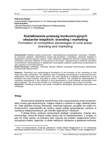 Zeszyty Naukowe UNIWERSYTETU PRZYRODNICZO-HUMANISTYCZNEGO w SIEDLCACH Seria: Administracja i Zarządzanie Nr 111 2016 PhD Inna Kulish1 Instytut Badań Regionalnych im. M. Doliszniogo Narodowej Akademii Nauk Ukrainy Iryna Kravtsiv Lwowski Narodowy Uniwersytet Medycyny Weterynaryjnej i Biotechnologii im. S. Gzhytskiego Kształtowanie przewag konkurencyjnych obszarów wiejskich: branding i marketing Formation of competitive advantages of rural areas: branding and marketing Streszczenie: Zbadano zasady teoretyczne i metodologiczne powstawania brandingu i marketingu obszarów wiejskich. Udowodniono ważną rolę brandingu i marketingu obszarów wiejskich w zwiększaniu konkurencyjności regionu i kraju. Określono podstawowe kierunki rozwoju brandingu i marketingu obszarów wiejskich w nowoczesnych warunkach. Zaproponowano środki dla wdrożenia mechanizmów marketingowych w działalności samorządów wiejskich społeczności terytorialnych w celu poprawy ich konkurencyjności. Słowa kluczowe: marketing, branding, obszary wiejskie, przewaga konkurencyjna, globalizacja, wyzwania geo-ekonomiczne Abstract: Theoretical and methodological foundations of the formation of the marketing of rural areas have been researched. The significant role of marketing rural territories in enhancing the competitiveness of the region have been proved. The main directions of marketing development of rural territories have been outlined, according to modern conditions. The activities for implementation of marketing mechanisms in the activities of local government of rural territorial communities have been proposed. The aim of the activities is to increase the competitiveness of their economies. Keywords: marketing, branding, rural areas, competitive advantages, globalization, geo-economic challenges Wstęp Wzmocnienie globalnej transformacji rynku spowodowane przez fundamentalne zmiany geo-ekonomiczne, mające miejsce w świecie w ciągu ostatniej dekady (dwa globalne kryzysy finansowe, rewolucja łupkowa, początek ery wojen hybrydycznych), doprowadziło do zmiany zasad polityki gospodarczej, zarówno w wymiarze międzynarodowym, jak również regionalnym i lokalnym. Z jednej strony, podczas opracowania strategii i programów rozwoju ekonomicznego, znacznie więcej uwagi zwraca się na bezpieczeństwo, z drugiej, co jest nie mniej ważne, na pierwszy plan wysuwa się problem zwiększenia konkurencyjności krajów, regionów, a nawet niektórych obszarów w globalnej konfrontaAdres do korespondencji: Instytucja państwowa „Instytut Badań Regionalnych im. M. Doliszniogo Narodowej Akademii Nauk Ukrainy”, ul. Kozelnicka,4, m. Lwów, Ukraina 79026, e-mail: [email protected] 1 ZN nr 111 Seria: Administracja i Zarządzanie (38) 2016 70 I. Kulish, I. Kravtsiv cji rynkowej. Zdolność do skutecznego wykorzystania dostępnych zasobów naturalnych i ludzkich, zapewnia krajom i regionom wyższy poziom stabilności gospodarczej w warunkach wzmacniania konkurencji globalnej. To także nie pozwala wpaść w uzależnienie od ekspansji importowanych towarów i usług, a jednocześnie stymuluje rozwój innowacyjny produkcji lokalnej. W niniejszym opracowaniu przedstawiono istotę konkurencyjności regionalnej, która w ostatnich latach stanowi szczególnie dotkliwy i pilny problem, o czym świadczą liczne publikacje na ten temat w ukraińskich i zagranicznych edycjach. Warto również zwrócić uwagę na badania naukowe prowadzone w tym zakresie przez I. Begg, O. Bilous, I. Vynohradchyy, A. Vlasyuk, V. Geyets B. Danylyshyn, J. Zhalilo, P. Krugman, N. Mikuła, A. Mokiy, Yu Poluneyev, M. Porter, S. Sokolenko. W niniejszym opracowaniu omówiono również skutki działań konkurencyjności regionalnej. Podstawowym celem opracowania było przedstawienie istoty brandingu i marketingu obszarów wiejskich. Geneza koncepcji I. Begg bada konkurencyjność regionu jako pochodną poziomu rozwoju gospodarczego, który określa jego zdolność do generowania wyższej jakości produktów i usług w porównaniu do innych regionów. To oznacza zdolność regionu do utrzymania osiągniętych pozycji na rynkach krajowych i międzynarodowych dla towarów i usług lub ich wzmocnienie2. Według A. Vlasyuk, konkurencyjność regionu w warunkach pogłębiającego się międzynarodowego podziału pracy i zwiększenia globalnych tendencji gospodarczych, zależy od zdolności właściwych jednostek administracyjnych do przyciągnięcia odpowiedniej ilości środków inwestycyjnych, które będą skierowane nie tylko na zwiększenie efektywności wykorzystania istniejących przewag konkurencyjnych, ale również stworzenie nowych3. Istnieje też pogląd, że konkurencja ma miejsce między regionami w różnych formach i uzyskuje inne efekty, różne od tych, które są obserwowane na poziomach mikro i makro. Jej główne obszary to: walka o zasoby ludzkie, konkurencja o kapitał inwestycyjny - zwłaszcza zagraniczny, zdolność do stymulowania działalności innowacyjnej lokalnych producentów i zapewnienia wysokiej jakości transferu technologii, przyciąganie turystów. To wszystko ma wpływ na dodatkowy popyt towarów i usług w obrębie regionu, jak również lokalizacja regionalnych centrów administracyjnych, biur, firm, placówek dyplomatycznych, które są w stanie promować potencjał i wspierać interesy gospodarcze tego regionu4. Wszystkie te aspekty konkurencji gospodarczej między regionami są ściśle powiązane z zakresem marketingu regionalnego, którego priorytetem jest określenie konkurencyjnych przewag regionów i promocji poprzez jasno określoną strategię marketingową. Poprawa konkurencyjności regionu odbywa się, przede wszyst2 I. Begg, Cities and Competitiveness, Urban Studies, Vol. 36(5), 1999, p. 795-809. O. Власюк, Конкурентоспроможність регіонів як елемент інтеграційних стратегій України, Соціально-економічні проблеми с