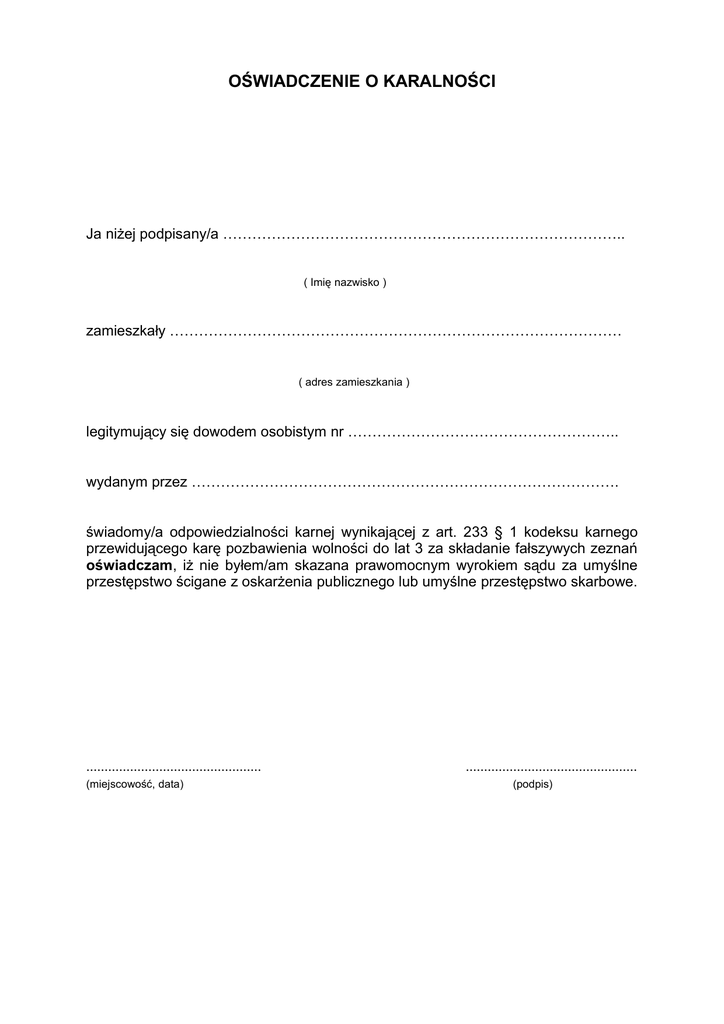 OŚWIADCZENIE O KARALNOŚCI Ja niżej podpisany/a ……………………………………………………………………….. ( Imię nazwisko ) zamieszkały ………………………………………………………………………………… ( adres zamieszkania ) legitymujący się dowodem osobistym nr ……………………………………………….. wydanym przez ……………………………………………………………………………. świadomy/a odpowiedzialności karnej wynikającej z art. 233 § 1 kodeksu karnego przewidującego karę pozbawienia wolności do lat 3 za składanie fałszywych zeznań oświadczam, iż nie byłem/am skazana prawomocnym wyrokiem sądu za umyślne przestępstwo ścigane z oskarżenia publicznego lub umyślne przestępstwo skarbowe. ................................................ (miejscowość, data) ............................................... (podpis)