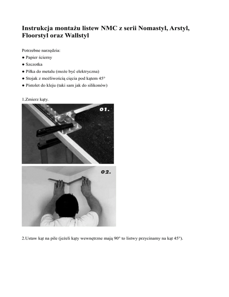 Instrukcja montażu listew NMC z serii Nomastyl, Arstyl, Floorstyl oraz Wallstyl Potrzebne narzędzia: ● Papier ścierny ● Szczotka ● Piłka do metalu (może być elektryczna) ● Stojak z możliwością cięcia pod kątem 45° ● Pistolet do kleju (taki sam jak do silikonów) 1.Zmierz kąty. 2.Ustaw kąt na pile (jeżeli kąty wewnętrzne mają 90° to listwy przycinamy na kąt 45°). 3. Przy klejeniu listew podsufitowych zaznacz odległość listwy od sufitu (w szczególności listwy z zastosowanym podświetleniem). 4. Przytnij listwy na długość pod odpowiednim kątem. 5. Przymierz listwę. 6. Ewentualnie skoryguj docięcie. 7. Wyszlifuj krawędzie papierem ściernym by były gładkie. 8. Oczyść krawędzie z pyłu. 9. Rozprowadź klej po całej długości listwy. (Końcówka powinna być nie większa niż 7mm, pamiętaj o rozprowadzeniu kleju również na łączeniach listew). 10. Jeżeli zakupiłeś klej w wiaderku rozprowadź go szpachelką (pamiętaj o rozprowadzeniu kleju również na łączeniach listew). 11. Przyklej listwę do ściany. 12. Niektóre listwy (Seria arstyl) wymagają zastosowania kołków łączeniowych NMC. 13. Po przyklejeniu listwy zbierz nadmiar kleju by go wyrównać. 14. Po zaschnięciu kleju (nie mniej niż 24h) można przeszlifować łączenia papierem ściernym by nie były widoczne. 16. Pomaluj listwy farbą (najlepiej zmywalną) w dowolnym kolorze i ciesz się przyjemniejszym wnętrzem.