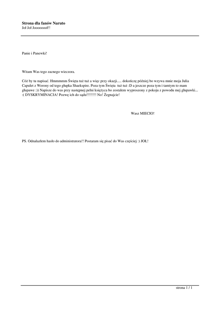 Strona dla fanów Naruto Joł Joł Joooooooł!! Panie i Panewki! Witam Was tego zacnego wieczora. Cóż by tu napisać. Hmmmmm Święta tuż tuż a więc przy okazji..... dokończę później bo wzywa mnie moja Julia Capulet z Werony od tego głupka Shaekspire. Poza tym Święta tuż tuż :D a jeszcze poza tym i tamtym to mam głupawe :)) Napisze do was przy następnej pełni księżyca bo zostałem wyproszony z pokoju z powodu mej głupawki... :( DYSKRYMINACJA! Pozwę ich do sądu!!!!!!!! No! Żegnajcie! Wasz MIECIO! PS. Odnalazłem hasło do administratora!! Postaram się pisać do Was częściej :) JOŁ! strona 1 / 1