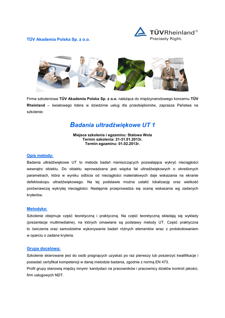 TÜV Akademia Polska Sp. z o.o. Firma szkoleniowa TÜV Akademia Polska Sp. z o.o. należąca do międzynarodowego koncernu TÜV Rheinland – światowego lidera w dziedzinie usług dla przedsiębiorstw, zaprasza Państwa na szkolenie: Badania ultradźwiękowe UT 1 Miejsce szkolenia i egzaminu: Stalowa Wola Termin szkolenia: 21-31.01.2013r. Termin egzaminu: 01.02.2013r. Opis metody: Badania ultradźwiękowe UT to metoda badań nieniszczących pozwalająca wykryć nieciągłości wewnątrz obiektu. Do obiektu wprowadzana jest wiązka fal ultradźwiękowych o określonych parametrach, która w wyniku odbicia od nieciągłości materiałowych daje wskazania na ekranie defektoskopu ultradźwiękowego. Na tej podstawie można ustalić lokalizację oraz wielkość porównawczą wykrytej nieciągłości. Następnie przeprowadza się ocenę wskazania wg zadanych kryteriów. Metodyka: Szkolenie obejmuje część teoretyczną i praktyczną. Na część teoretyczną składają się wykłady (prezentacje multimedialne), na których omawiane są podstawy metody UT. Część praktyczna to ćwiczenia oraz samodzielne wykonywanie badań różnych elementów wraz z protokołowaniem w oparciu o zadane kryteria. Grupa docelowa: Szkolenie skierowane jest do osób pragnących uzyskać po raz pierwszy lub poszerzyć kwalifikacje i posiadać certyfikat kompetencji w danej metodzie badania, zgodnie z normą EN 473. Profil grupy stanowią między innymi: kandydaci na pracowników i pracownicy działów kontroli jakości, firm usługowych NDT. Uczestnicy po odbytym szkoleniu otrzymują zaświadczenie o jego ukończeniu wystawiane przez uznaną jednostkę szkoleniową TÜV Akademia Polska Sp z. o.o., którego pozytywny wynik upoważnia do przystąpienia do egzaminu UT 1 przeprowadzanego w następnym dniu po zakończeniu szkolenia przez niezależną Jednostkę Certyfikującą Personel Badań Nieniszczących TÜV Rheinland – TÜV Rheinland Industrie Service GmbH przy TÜV Akademia Polska Sp. z. o.o. Pozytywne zdanie egzaminu jest niezbędnym warunkiem ubiegania się o certyfikat kompetencji. Wymagania: Aby uczestnik mógł w pełni uczestniczyć w szkoleniu oraz w prosty i łatwy sposób przyswoić wymaganą programem szkoleniowym wiedzę, preferowany jest techniczny kierunek wykształcenia lub wieloletnie doświadczenie zawodowe na stanowiskach technicznych. Ponadto od kandydata wymaga się: • wykształcenia minimum zawodowego • umiejętności wykonywania podstawowych obliczeń matematycznych • posiadania kalkulatora technicznego i znajomości jego obsługi Program szkolenia: Wiedza teoretyczna: • Podstawy fizyczne (rodzaje fal, charakterystyka wiązki, zjawiska występujące na granicach ośrodków) • Charakterystyka sprzętu do badań (defektoskop, głowice, wzorce, ośrodki sprzęgające) • Obsługa defektoskopu oraz kontrola aparatury badawczej • Techniki badań ultradźwiękowych oraz techniki oceny • Ultradźwiękowe pomiary grubości • Charakterystyka obiektów badania oraz występujących w nich niezgodności (wyroby przerabiane plastycznie, odkuwki, złącza spawane, odlewy, rury) • Normy związane z obiektami badań oraz kontrolą aparatury • Certyfikacja i kwalifikacja personelu badań nieniszczących wg EN 473 Umiejętności praktyczne: • Skalowanie zakresu obserwacji • Proste skalowanie czułości badania • Badanie własności systemu defektoskop – głowica • Lokalizacja wad głowicami normalnymi podwójnymi i skośnymi • Klasyfikacja wskazań (punktowe, liniowe) • Ocena wielkości wad punktowych przy pomocy AVG • Ocena wielkości wad rozległych przy pomocy spadku 6dB • Wyznaczanie strat przeniesienia • Ultradźwiękowy pomiar grubości ścianki różnych materiałów Normy związane: EN 583-1, 583-2, 583-3, EN 12668-3 Cena szkolenia: 5 325 zł netto*/1 uczestnik * W w/w cenie zawarte jest szkolenie w dniach 21-31.01.2013 r. oraz egzamin, który odbędzie się 01.02.2013r., ponadto do ceny należy doliczyć 23% podatku VAT. Płatności należy dokonać przelewem na 7 dni przed szkoleniem na numer konta: Deutsche Bank PBC S.A. O/Katowice 80 1910 1048 2518 0166 0755 0001. Zgłoszenie: W przypadku pytań prosimy o bezpośredni kontakt z Panią Darią Hawrot pod numerem telefonu 32/ 271-64-87 lub 601 784 165. W przypadku zainteresowania uczestnictwem w szkoleniu, prosimy o uzupełnienie Karty Zgłoszenia oraz przesłanie jej pod numer faksu 32/ 376-29-66 lub skanu na adres e-mail [email protected]. Oryginał Karty prosimy odesłać pocztą na adres: TÜV Akademia Polska Sp. z o.o., ul. Wolności 327, 41-800 Zabrze.