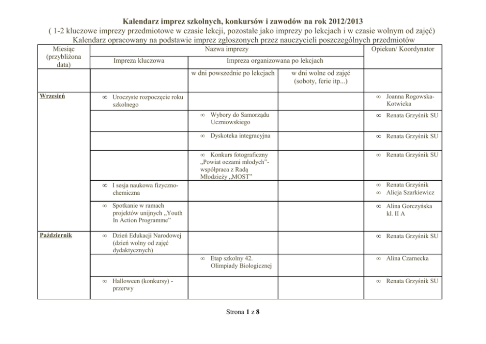 Kalendarz imprez szkolnych, konkursów i zawodów na rok 2012/2013 ( 1-2 kluczowe imprezy przedmiotowe w czasie lekcji, pozostałe jako imprezy po lekcjach i w czasie wolnym od zajęć) Kalendarz opracowany na podstawie imprez zgłoszonych przez nauczycieli poszczególnych przedmiotów Miesiąc (przybliżona data) Nazwa imprezy Impreza kluczowa Impreza organizowana po lekcjach w dni powszednie po lekcjach Wrzesień Opiekun/ Koordynator • Uroczyste rozpoczęcie roku w dni wolne od zajęć (soboty, ferie itp...) • szkolnego • Wybory do Samorządu Uczniowskiego • Renata Grzyśnik SU • Dyskoteka integracyjna • Renata Grzyśnik SU • Konkurs fotograficzny „Powiat oczami młodych”współpraca z Radą Młodzieży „MOST” • Renata Grzyśnik SU • I sesja naukowa fizyczno- • • Renata Grzyśnik Alicja Szarkiewicz • Spotkanie w ramach projektów unijnych „Youth In Action Programme” • Alina Gorczyńska Dzień Edukacji Narodowej (dzień wolny od zajęć dydaktycznych) • Renata Grzyśnik SU chemiczna Październik Joanna RogowskaKotwicka • kl. II A • • Etap szkolny 42. Olimpiady Biologicznej Halloween (konkursy) przerwy Strona 1 z 8 • Alina Czarnecka • Renata Grzyśnik SU • Konkurs Przyrodniczy „ Na tropach przyrody” (październik- maj 2013)soboty, niedziele • XXXIX Olimpiada • Alina Czarnecka • Agnieszka Jurczyńska • • Alina Gorczyńska Marta BzdręgaFelcyn Renata Grzyśnik Geograficzna- etap szkolny (pisanie prac, konsultacje) Listopad • Olimpiada z języka niemieckiego- etap szkolny • Olimpiada Chemiczna- • sobota • Olimpiada Literatury • Edyta PędzichKorabiewska • Olimpiada Języka • Ewa Lachowicz • Konkurs „ O niepodległą • • Wawrzyniec Sulewski Dorota Barczak • • • Elżbieta Rzepka Malwina Niezborała Sylwia Krzyśko • Agnieszka Jurczyńska kl. II B • Agnieszka Jurczyńska i Języka Polskiego- etap szkolny Angielskiego- etap szkolny (19 listopada) Polskę” Przekazanie historii organizacji Grunwald • • Dzień Patrona Szkoły • XXXIX Olimpiada Geograficzna- etap szkolny (sprawdzanie i ocenianie prac) Strona 2 z 8 „Supermatematyk” – konkurs matematyczny (I, II etap) - sobota • • Renata Grzyśnik SU • Renata Grzyśnik SU • Renata Grzyśnik SU • Alina Czarnecka • Uczniowie oraz rodzice i wychowawcy klas II • Andrzej Tyrka • Kawiarenka Mikołajkowa- 6 • Dorota Barczak • • Renata Grzyśnik SU Wybory do Rady Młodzieży „MOST” – przerwy • Konkursy świąteczne (np. ozdoba choinkowa) – przerwy • Renata Grzyśnik SU • Renata Grzyśnik SU • • Renata Grzyśnik SU • Andrzejki ( dyskoteka) Otrzęsiny klas pierwszych Akcja „Pamiętamy…” Grudzień • Powiatowy etap Olimpiady Wiedzy o HIV/ AIDS • • Połowinki klas drugich Dialogi Młodych grudnia (na przerwach) Mikołajki • Świąteczna zbiórka żywności - przerwy • Styczeń Studniówka • Olimpiada Biologiczna Zawody II stopnia w Poznaniu- sobota Strona 3 z 8 • Uczniowie klas maturalnych i ich rodzice, przy pomocy wychowawców • Alina Czarnecka • • Alina Czarnecka • Olimpiada chemiczna- • Renata Grzyśnik • Olimpiada Języka • Ewa Lachowicz • • Dorota Barczak • Joanna RogowskaKotwicka • Edyta PędzichKorabiewska Etap szkolny Olimpiady Wiedzy Ekologicznej II etap- sobota Luty • angielskiego- II etap okręgowy (21 stycznia) XXI Finał Wielkiej Orkiestry Świątecznej Pomocy Powiatowy Konkurs Ortograficzny (Luty/ Marzec) • Olimpiada Literatury i Języka Polskiegoetap okręgowy- sobota • • Zbigniew Młodzież zapobiega pożarom (Luty/Marzec) Maćkowiak • • Wyjazd na zajęcia laboratoryjne- UAM Poznań (wiosna) • Powiatowy konkurs wiedzy „Supermatematyk” III etap- powiatowysobota • • • Elżbieta Rzepka Malwina Niezborała Sylwia Krzyśko • Renata Grzyśnik • Agnieszka Jurczyńska • Renata Grzyśnik SU „I Ty możesz zostać Omnibusem” (LO Czarnków) • Bal Karnawałowy Strona 4 z 8 • Poczta Walentynkowa - przerwy • • „Dni z filmem” • Renata Grzyśnik SU • Otwarty Turniej • Janusz BiałynickiBirulo Siatkówki Dziewcząt o Puchar Starosty CzarnkowskoTrzcianeckiego (16 lutego 2013) – sobota Marzec Renata Grzyśnik SU • Turniej Wiedzy o Ziemi Trzcianeckiej • Wawrzyniec Sulewski • Powiatowy Konkurs Historyczny • Wawrzyniec Sulewski • „Lwiątko” – konkurs • Alicja Szarkiewicz • • Alina Czarnecka fizyczny Powiatowy Konkurs Przyrodniczy • „Kangur”- ogólnopolski konkurs matematyczny • • • Elżbieta Rzepka Malwina Niezborała Sylwia Krzyśko • „Matematyczny Orzeł” (WSB) • • • • • Elżbieta Rzepka Malwina Niezborała Sylwia Krzyśko Alina Gorczyńska Marta BzdręgaFelcyn • Wymiana Międzynarodowa • Język niemiecki na scenie Turniej Małych Form Scenicznych - sobota Strona 5 z 8 • II sesja naukowa fizyczno – chemiczna • • Renata Grzyśnik Alicja Szarkiewicz • Rekolekcje wielkopostne • • Dzień Wiosny (IV Szkolny Przegląd Talentów „Mam talent”) • Ks. Grzegorz Szczygieł Renata Grzyśnik SU • Dorota Barczak • • • Ewa Lachowicz Magdalena Dziedzic Jarosław Stępniewski • Janusz BiałynickiBirulo • Janusz BiałynickiBirulo Zbigniew Szpak • Konkurs Fotograficzny XII edycja- „Miejsca, ludzie, zdarzenia” • Tydzień kultury Krajów Anglojęzycznych • Otwarty Turniej Koszykówki Dziewcząt o Puchar Starosty CzarnkowskoTrzcianeckiego (2 marca) - sobota • Otwarty Turniej Koszykówki Chłopców o Puchar Starosty CzarnkowskoTrzcianeckiego (9 marca) - sobota • Otwarty Turniej Siatkówki Chłopców o Puchar Starosty CzarnkowskoTrzcianeckiego (16 marca) - sobota Strona 6 z 8 • • Janusz BiałynickiBirulo Kwiecień • • • • Elżbieta Rzepka Malwina Niezborała Sylwia Krzyśko • • • Elżbieta Rzepka Malwina Niezborałą Sylwia Krzyśko • Alina Czarnecka • Dorota Barczak kl. II D • Agnieszka Jurczyńska • Świąteczna zbiórka