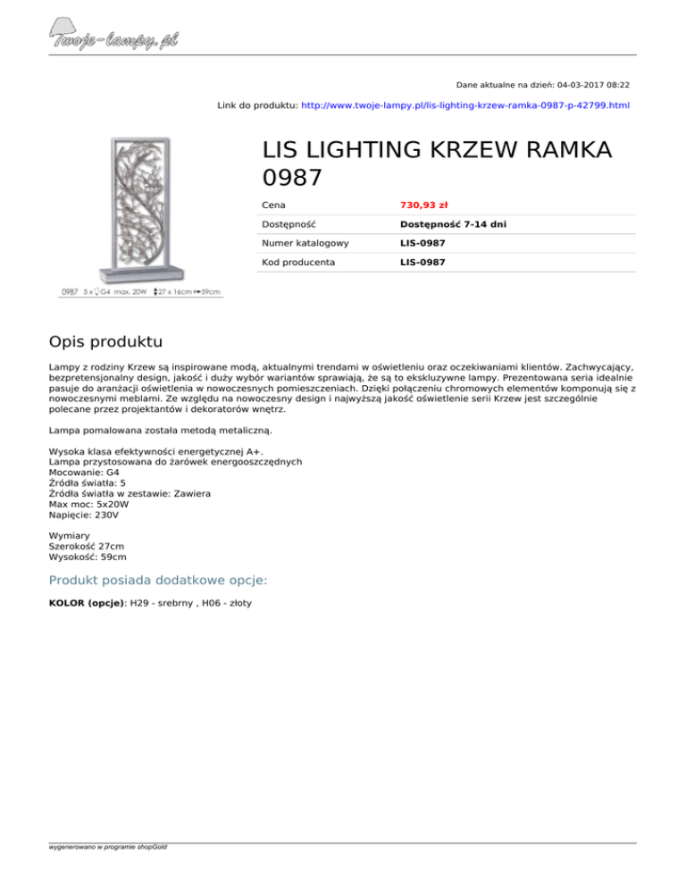 Dane aktualne na dzień: 04-03-2017 08:22 Link do produktu: http://www.twoje-lampy.pl/lis-lighting-krzew-ramka-0987-p-42799.html LIS LIGHTING KRZEW RAMKA 0987 Cena 730,93 zł Dostępność Dostępność 7-14 dni Numer katalogowy LIS-0987 Kod producenta LIS-0987 Opis produktu Lampy z rodziny Krzew są inspirowane modą, aktualnymi trendami w oświetleniu oraz oczekiwaniami klientów. Zachwycający, bezpretensjonalny design, jakość i duży wybór wariantów sprawiają, że są to ekskluzywne lampy. Prezentowana seria idealnie pasuje do aranżacji oświetlenia w nowoczesnych pomieszczeniach. Dzięki połączeniu chromowych elementów komponują się z nowoczesnymi meblami. Ze względu na nowoczesny design i najwyższą jakość oświetlenie serii Krzew jest szczególnie polecane przez projektantów i dekoratorów wnętrz. Lampa pomalowana została metodą metaliczną. Wysoka klasa efektywności energetycznej A+. Lampa przystosowana do żarówek energooszczędnych Mocowanie: G4 Źródła światła: 5 Źródła światła w zestawie: Zawiera Max moc: 5x20W Napięcie: 230V Wymiary Szerokość 27cm Wysokość: 59cm Produkt posiada dodatkowe opcje: KOLOR (opcje): H29 - srebrny , H06 - złoty wygenerowano w programie shopGold Powered by TCPDF (www.tcpdf.org)