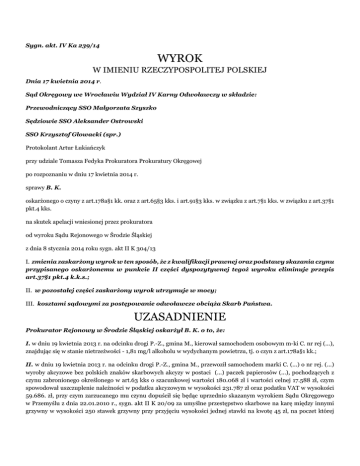 Sygn. akt. IV Ka 239/14 WYROK W IMIENIU RZECZYPOSPOLITEJ POLSKIEJ Dnia 17 kwietnia 2014 r. Sąd Okręgowy we Wrocławiu Wydział IV Karny Odwoławczy w składzie: Przewodniczący SSO Małgorzata Szyszko Sędziowie SSO Aleksander Ostrowski SSO Krzysztof Głowacki (spr.) Protokolant Artur Łukiańczyk przy udziale Tomasza Fedyka Prokuratora Prokuratury Okręgowej po rozpoznaniu w dniu 17 kwietnia 2014 r. sprawy B. K. oskarżonego o czyny z art.178a§1 kk. oraz z art.65§3 kks. i art.91§3 kks. w związku z art.7§1 kks. w związku z art.37§1 pkt.4 kks. na skutek apelacji wniesionej przez prokuratora od wyroku Sądu Rejonowego w Środzie Śląskiej z dnia 8 stycznia 2014 roku sygn. akt II K 304/13 I. zmienia zaskarżony wyrok w ten sposób, że z kwalifikacji prawnej oraz podstawy skazania czynu przypisanego oskarżonemu w punkcie II części dyspozytywnej tegoż wyroku eliminuje przepis art.37§1 pkt.4 k.k.s.; II. w pozostałej części zaskarżony wyrok utrzymuje w mocy; III. kosztami sądowymi za postępowanie odwoławcze obciąża Skarb Państwa. UZASADNIENIE Prokurator Rejonowy w Środzie Śląskiej oskarżył B. K. o to, że: I. w dniu 19 kwietnia 2013 r. na odcinku drogi P.-Z., gmina M., kierował samochodem osobowym m-ki C. nr rej (...), znajdując się w stanie nietrzeźwości - 1,81 mg/l alkoholu w wydychanym powietrzu, tj. o czyn z art.178a§1 kk.; II. w dniu 19 kwietnia 2013 r. na odcinku drogi P.-Z., gmina M., przewoził samochodem marki C. (...) o nr rej. (...) wyroby akcyzowe bez polskich znaków skarbowych akcyzy w postaci (...) paczek papierosów (...), pochodzących z czynu zabronionego określonego w art.63 kks o szacunkowej wartości 180.068 zł i wartości celnej 17.588 zł, czym spowodował uszczuplenie należności w podatku akcyzowym w wysokości 231.787 zł oraz podatku VAT w wysokości 59.686. zł, przy czym zarzucanego mu czynu dopuścił się będąc uprzednio skazanym wyrokiem Sądu Okręgowego w Przemyślu z dnia 22.01.2010 r., sygn. akt II K 20/09 za umyślne przestępstwo skarbowe na karę między innymi grzywny w wysokości 250 stawek grzywny przy przyjęciu wysokości jednej stawki na kwotę 45 zł, na poczet której kary zaliczono okres tymczasowego aresztowania w okresie 10.10.2007 r., do 04.03.2008 r., tj. o czyn z art.65§3 kks. i art.91§3 kks. w związku z art.7§1 kks. w związku z art.37§1 pkt.4 kks. Sąd Rejonowy w Środzie Śląskiej wyrokiem z dnia 8 stycznia 2014 r., sygn. akt II K 304/13,: I. uznał oskarżonego B. K. za winnego popełnienia czynu opisanego w punkcie I części wstępnej wyroku tj. przestępstwa z art.178a§1 kk. i za to na podstawie art.178a§1 kk. wymierzył mu karę 1 (jednego) roku pozbawienia wolności; II. uznał oskarżonego B. K. za winnego popełnienia czynu opisanego w punkcie II części wstępnej wyroku tj. przestępstwa z art.65§3 kks. i art.91§3 kks. w związku z art.7§1 kks. w związku z art.37§1 pkt.4 kks. i za to na podstawie art.65§3 kks. i art.91§3 kks. w związku z art.7§1 kks. w związku z art.37§1 pkt.4 kks. wymierzył mu karę grzywny w wysokości 90 (dziewięćdziesięciu) stawek dziennych, przy określeniu jednej stawki dziennej na kwotę 50 (pięćdziesiąt) złotych; III. na podstawie art.69§1 i §2 kk. oraz art.70§1 pkt.1 kk. warunkowo zawiesił oskarżonemu wykonanie orzeczonej kary pozbawienia wolności na okres 3 (trzech) lat próby; IV. na podstawie art.42§2 kk. oraz art.43§1 kk. orzekł wobec oskarżonego zakaz prowadzenia wszelkich pojazdów mechanicznych w ruchu lądowym na okres 2 (dwóch) lat; V. na podstawie art.49§2 kk. orzekł od oskarżonego na rzecz Funduszu Pomocy Pokrzywdzonym oraz Pomocy Postpenitencjarnej świadczenie pieniężne w kwocie 300 (trzystu) złotych; VI. na podstawie art.30§2 kks. orzekł przepadek dowodów rzeczowych ujętych w wykazie dowodów rzeczowych Drz 247/13 poz.1, k.109 a.s. zarządzając ich zniszczenie; VII. zasądził od oskarżonego na rzecz Skarbu Państwa zwrot kosztów postępowania i wymierzył mu opłatę w kwocie 630 zł. Wyżej wskazany wyrok zaskarżył Prokurator i po zmodyfikowaniu na rozprawie apelacyjnej zarzutu obrazy przepisu prawa materialnego, a to art.37§1 pkt.4 kks. przyjętego jako podstawę wymiaru kary za drugi z przypisanych oskarżonemu czynów, wniósł o zmianę zaskarżonego w wyroku w części dotyczącej tego czynu poprzez wyeliminowanie z kwalifikacji prawnej art.37§1 pkt.4 kks. Sąd Okręgowy zważył, co następuje. Apelacja Prokuratora w zakresie zawartego w niej wniosku o wyeliminowanie przepisu art.37§1 pkt.4 kks. z kwalifikacji prawnej i podstawy skazania czynu przypisanego oskarżonemu w punkcie II części dyspozytywnej zaskarżonego wyroku zasługiwała na uwzględnienie. Zgodnie z art.37§1 pkt.4 kks. przesłankami recydywy karnej skarbowej są: 1. uprzednie skazanie za umyślne przestępstwo skarbowe na karę pozbawienia wolności lub karę ograniczenia wolności albo karę grzywny, 2. odbycie co najmniej 6 miesięcy kary pozbawienia wolności lub 6 miesięcy kary ograniczenia wolności albo uiszczenie co najmniej 120 stawek dziennych grzywny, 3. popełnienie w ciągu 5 lat po odbyciu kary (po uiszczeniu grzywny) umyślnego przestępstwa skarbowego tego samego rodzaju. Sąd Rejonowy przyjął za podstawę skazania cytowany wyżej przepis i błędnie przyjął, że czynu przypisanego oskarżonemu w punkcie II zaskarżonego wyroku dopuścił się on w warunkach powrotu do przestępstwa, o których mowa w art.37§1 pkt.4 kks., a w konsekwencji błędnie zakwalifikował ten czyn z art.65§3 kks. i art.91§3 kks. w zw. z art.7§1 kks. w zw. z art.37§1 pkt.4 kks., nie mniej jednak w uzasadnieniu zaskarżonego wyroku wskazał na omyłkę tejże kwalifikacji. Sąd I instancji, opierając się na dowodach z dokumentów w postaci danych o karalności z Krajowego Rejestru Karnego oraz odpisów wyroków prawidłowo ustalił, że oskarżony był skazany wyrokiem Sądu Okręgowego w Przemyślu z dnia 22 stycznia