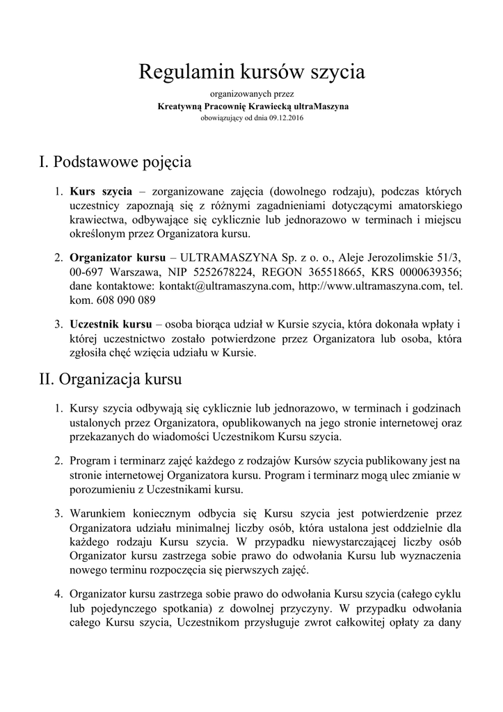 Regulamin kursów szycia organizowanych przez Kreatywną Pracownię Krawiecką ultraMaszyna obowiązujący od dnia 09.12.2016 I. Podstawowe pojęcia 1. Kurs szycia – zorganizowane zajęcia (dowolnego rodzaju), podczas których uczestnicy zapoznają się z różnymi zagadnieniami dotyczącymi amatorskiego krawiectwa, odbywające się cyklicznie lub jednorazowo w terminach i miejscu określonym przez Organizatora kursu. 2. Organizator kursu – ULTRAMASZYNA Sp. z o. o., Aleje Jerozolimskie 51/3, 00-697 Warszawa, NIP 5252678224, REGON 365518665, KRS 0000639356; dane kontaktowe: [email protected], http://www.ultramaszyna.com, tel. kom. 608 090 089 3. Uczestnik kursu – osoba biorąca udział w Kursie szycia, która dokonała wpłaty i której uczestnictwo zostało potwierdzone przez Organizatora lub osoba, która zgłosiła chęć wzięcia udziału w Kursie. II. Organizacja kursu 1. Kursy szycia odbywają się cyklicznie lub jednorazowo, w terminach i godzinach ustalonych przez Organizatora, opublikowanych na jego stronie internetowej oraz przekazanych do wiadomości Uczestnikom Kursu szycia. 2. Program i terminarz zajęć każdego z rodzajów Kursów szycia publikowany jest na stronie internetowej Organizatora kursu. Program i terminarz mogą ulec zmianie w porozumieniu z Uczestnikami kursu. 3. Warunkiem koniecznym odbycia się Kursu szycia jest potwierdzenie przez Organizatora udziału minimalnej liczby osób, która ustalona jest oddzielnie dla każdego rodzaju Kursu szycia. W przypadku niewystarczającej liczby osób Organizator kursu zastrzega sobie prawo do odwołania Kursu lub wyznaczenia nowego terminu rozpoczęcia się pierwszych zajęć. 4. Organizator kursu zastrzega sobie prawo do odwołania Kursu szycia (całego cyklu lub pojedynczego spotkania) z dowolnej przyczyny. W przypadku odwołania całego Kursu szycia, Uczestnikom przysługuje zwrot całkowitej opłaty za dany Kurs szycia, natomiast w przypadku odwołania tylko części Kursu, uczestnikom przysługuje zwrot opłaty w wysokości proporcjonalnej do nieodbytych zajęć. 5. O przydziale wolnych miejsc na Kursie szycia decyduje kolejność zgłoszeń. 6. Organizator zapewnia przeprowadzenia zajęć. pełne wyposażenie i materiały niezbędne do 7. Kurs szycia prowadzony jest przez upoważnione przez Organizatora osoby. 8. Organizator na pierwszych zajęciach zapoznaje Uczestników z zasadami bezpieczeństwa i higieny pracy oraz prawidłowej obsługi sprzętów dostępnych w pracowni. 9. Organizator nie ponosi odpowiedzialności za zdarzenia losowe oraz wypadki powstałe w trakcie trwania zajęć i wynikające z nieprzestrzegania zasad bezpieczeństwa i higieny pracy. 10.Organizator nie ponosi odpowiedzialności za rzeczy Uczestników pozostawione w miejscu odbywania się Kursu. III. Warunki uczestnictwa 1. Warunkiem udziału w Kursie szycia jest akceptacja przez Uczestnika niniejszego regulaminu oraz indywidualne zgłoszenie i wniesienie opłaty za Kurs w terminie ustalonym przez Organizatora kursu. 2. W Kursie szycia może brać udział jedynie osoba do niego zgłoszona, której uczestnictwo zostało potwierdzone przez Organizatora. Nie jest możliwe odstępowanie udziału w zajęciach osobom trzecim, których uczestnictwo nie zostało uprzednio potwierdzone. 3. Uczestnik zobowiązany jest do przestrzegania postanowień niniejszego regulaminu oraz stosowania się do zaleceń prowadzących zajęcia w zakresie dotyczącym bezpieczeństwa i porządku zajęć odbywających się w ramach Kursu szycia. IV. Zgłoszenia udziału, rezygnacja i opłaty 1. Zgłoszenia udziału w Kursie szycia dokonywane mogą być przez: a. wysłanie wiadomości na adres [email protected], zawierającej imię i nazwisko uczestnika, numer telefonu kontaktowego, nazwę Kursu szycia oraz numer grupy, b. wybranie konkretnej grupy na stronie internetowej z ofertą danego kursu i wypełnienie formularza zgłoszeniowego, do którego następuje przekierowanie po wciśnięciu przycisku “Zapisz się” przy danej grupie kursowej. 2. Każde zgłoszenie zostaje potwierdzone przez Organizatora wiadomością zawierającą informację o dostępności miejsc. Dopiero po otrzymaniu informacji o dostępnych miejscach Uczestnik powinien dokonać opłaty za Kurs. 3. Opłata za Kurs szycia publikowana jest na stronie internetowej Organizatora, w opisie danego Kursu szycia. 4. Opłata za Kurs szycia obejmuje uczestnictwo w zajęciach, możliwość korzystania z całego wyposażenia pracowni oraz ze wszystkich materiałów krawieckich, zapewnionych przez Organizatora. Zasady korzystania z wyposażenia i materiałów określa Organizator podczas zajęć. 5. Organizator daje możliwość korzystania z własnych materiałów i sprzętu Uczestnika kursu, jednak nie wpływa to w żaden sposób na opłatę za Kurs szycia. 6. Ze względu na ograniczoną ilość miejsc na Kursie, uczestnik może dokonać bezpłatnej rezerwacji swojego udziału. 7. Dokonana rezerwacja może być odwołana przez Uczestnika przed rozpoczęciem się Kursu szycia. 8. Zwrot wniesionej opłaty (w tym zadatku) za Kurs przysługuje Uczestnikowi tylko w przypadku, gdy rezygnacja zostanie zgłoszona nie później niż na 7 dni przed rozpoczęciem się pierwszych zajęć przewidzianych w opublikowanym przez Organizatora terminarzu. 9. W przypadku: − zgłoszenia rezygnacji później niż na 7 dni przed rozpoczęciem się pierwszych zajęć przewidzianych w opublikowanym przez Organizatora programie, − nieobecności na zajęciach Uczestnikowi nie przysługuje prawo do zwrotu wniesionej opłaty za Kurs. 10.Opłaty powinny być wnoszone przelewem na konto bankowe Organizatora: ULTRAMASZYNA Sp. z o. o. Aleje Jerozolimskie 51/3, 00-697 Warszawa 24 1140 2004 0000 3802 7647 5632 mBank Tytuł przelewu powinien zawierać imię i nazwisko Uczestnika oraz numer wybranej grupy, do której został przypisany przez Organizatora po wysłaniu zgłoszenia. 11.W przypadku dostępnych miejsc na Kursie szycia w dniu jego