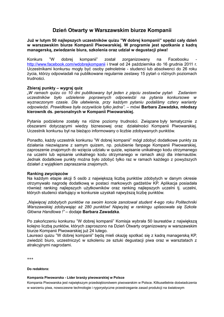 Dzień Otwarty w Warszawskim biurze Kompanii Już w lutym 50 najlepszych uczestników quizu ”W dobrej kompanii” spędzi cały dzień w warszawskim biurze Kompanii Piwowarskiej. W programie jest spotkanie z kadrą managerską, zwiedzanie biura, szkolenia oraz udział w degustacji piwa! Konkurs ”W dobrej kompanii” został zorganizowany na Facebooku http://www.facebook.com/wdobrejkompanii i trwał od 24 października do 16 grudnia 2011 r. Uczestnikami konkursu mogły być osoby pełnoletnie - studenci lub absolwenci do 26 roku życia, którzy odpowiadali na publikowane regularnie zestawy 15 pytań o różnych poziomach trudności. Zbieraj punkty – wygraj quiz „W ramach quizu co 10 dni publikowany był jeden z pięciu zestawów pytań Zadaniem uczestników było udzielenie poprawnych odpowiedzi na pytania konkursowe w wyznaczonym czasie. Dla ułatwienia, przy każdym pytaniu podaliśmy cztery warianty odpowiedzi. Prawidłowa była oczywiście tylko jedna”. – mówi Barbara Zawadzka, młodszy kierownik ds. personalnych w Kompanii Piwowarskiej. Pytania podzielone zostały na różne poziomy trudności. Związane były tematycznie z obszarami dotyczącymi wiedzy biznesowej oraz działalności Kompanii Piwowarskiej. Uczestnik konkursu był na bieżąco informowany o liczbie zdobywanych punktów. Ponadto, każdy uczestnik konkursu ”W dobrej kompanii” mógł zdobyć dodatkowe punkty za działania niezwiązane z samym quizem, np. polubienie fanpage Kompanii Piwowarskiej, zaproszenie znajomych do wzięcia udziału w quizie, wpisanie unikalnego kodu otrzymanego na uczelni lub wpisanie unikalnego kodu otrzymanego w ramach akcji dla internautów. Jednak dodatkowe punkty można było zdobyć tylko raz w ramach każdego z powyższych działań z wyjątkiem zapraszania znajomych. Ranking zwycięzców Na każdym etapie akcji 5 osób z największą liczbą punktów zdobytych w danym okresie otrzymywało nagrodę dodatkową w postaci markowych gadżetów KP. Aplikacja posiadała również ranking najlepszych użytkowników oraz ranking najlepszych uczelni tj. uczelni, których studenci startujący w konkursie uzyskali najwyższą liczbę punktów. „Najwięcej zdobytych punktów na swoim koncie zanotował student 4-ego roku Politechniki Warszawskiej zdobywając aż 280 punktów! Najwyżej w rankingu uplasowała się Szkoła Główna Handlowa !” – dodaje Barbara Zawadzka. Po zakończeniu konkursu ”W dobrej kompanii” Komisja wybrała 50 laureatów z największą kolejno liczbą punktów, których zaproszono na Dzień Otwarty organizowany w warszawskim biurze Kompanii Piwowarskiej już 24 lutego. Laureaci quizu ”W dobrej kompanii” będą mieli okazję spotkać się z kadrą managerską KP, zwiedzić biuro, uczestniczyć w szkoleniu ze sztuki degustacji piwa oraz w warsztatach z atrakcyjnymi nagrodami. *** Do redaktora: Kompania Piwowarska - Lider branży piwowarskiej w Polsce Kompania Piwowarska jest największym przedsiębiorstwem piwowarskim w Polsce. Kilkusetletnie doświadczenia w warzeniu piwa, nowoczesne technologie i rygorystyczne przestrzeganie zasad produkcji na światowym poziomie gwarantują najwyższą jakość naszych produktów. Do portfela marek KP należą najpopularniejsze polskie piwa - m.in. Tyskie, Żubr, Lech, Dębowe Mocne, Redd's, a także międzynarodowe marki premium: Pilsner Urquell, Grolsch oraz Peroni Nastro Azzurro. Kompania Piwowarska (utworzona w 1999 roku) posiada trzy browary (w Tychach, Poznaniu i Białymstoku) oraz oddziały handlowe na terenie całego kraju. Kompania Piwowarska prowadzi także działalność społeczną nastawioną na walkę z wykluczeniem społecznym na tle ubóstwa oraz programy edukacyjne popularyzujące odpowiedzialność i umiar w konsumowaniu alkoholu. Wielkość sprzedaży osiągniętej przez KP w roku finansowym zakończonym 31 marca 2011 r. wyniosła 14,1 mln hektolitrów piwa. SABMiller – jeden z największych na świecie producentów piwa Kompania Piwowarska jest częścią jednego z największych na świecie producentów piwa - SABMiller plc. Grupa produkuje lub dystrybuuje piwo na sześciu kontynentach, a jej ogólnoświatowy portfel obejmuje międzynarodowe piwa premium, takie jak Grolsch, Miller Genuine Draft, Peroni Nastro Azzurro czy Pilsner Urquell oraz czołowe marki lokalne, takie jak Aquila, Castle, Miller Lite, Snow czy Tyskie. SABMiller jest jedną z największych na świecie (poza USA) firm rozlewających produkty Coca-Coli. W roku finansowym zakończonym 31 marca 2011 SABMiller osiągnął przychody w wysokości 28,3 mld USD oraz wypracował zysk brutto (EBITA) w wysokości 5 mld USD. SABMiller plc jest notowany na giełdach papierów wartościowych w Londynie i Johannesburgu. Dodatkowych informacji udziela: Wojciech Mrugalski kierownik ds. komunikacji [email protected]| Tel. + 48 61 667 7667 tel. kom. + 48 601 91 11 44 Fax + 48 61 667 7850