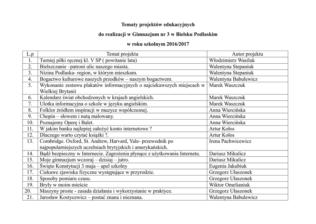 Tematy projektów edukacyjnych do realizacji w Gimnazjum nr 3 w Bielsku Podlaskim w roku szkolnym 2016/2017 L.p 1. 2. 3. 4. 5. 6. 7. 8. 9. 10. 11. 12. 13. 14. 15. 16. 17. 18. 19. 20. 21. Temat projektu Turniej piłki ręcznej kl. V SP ( powitanie lata) Bielszczanie –patroni ulic naszego miasta. Nizina Podlaska- region, w którym mieszkam. Bogactwo kulturowe naszych przodków – naszym bogactwem. Wykonanie zestawu plakatów informacyjnych o najciekawszych miejscach w Wielkiej Brytanii Kalendarz świat obchodzonych w krajach angielskich. Ulotka informacyjna o szkole w języku angielskim. Folklor źródłem inspiracji w muzyce współczesnej. Chopin – słowem i nutą malowany. Poznajemy Operę i Balet. W jakim banku najlepiej założyć konto internetowe ? Dlaczego warto czytać książki ?. Combridge. Oxford, St. Andrew, Harvard, Yale- przewodnik po najpopularniejszych uczelniach brytyjskich i amerykańskich. Bądź bezpieczny w Internecie. Zagrożenia płynące z użytkowania Internetu. Moje gimnazjum wczoraj – dzisiaj – jutro. Święto Konstytucji 3 maja – apel szkolny Ciekawe zjawiska fizyczne występujące w przyrodzie. Sposoby pomiaru czasu. Bryły w moim mieście Maszyny proste - zasada działania i wykorzystanie w praktyce. Jarosław Kostycewicz – postać znana i nieznana. Autor projektu Włodzimierz Wasiluk Walentyna Stepaniuk Walentyna Stepaniuk Walentyna Babulewicz Marek Waszczuk Marek Waszczuk Marek Waszczuk Anna Wiercińska Anna Wiercińska Anna Wiercińska Artur Kołos Artur Kołos Irena Pachwicewicz Dariusz Mikulicz Dariusz Mikulicz Eugenia Jakubiuk Grzegorz Ułaszonek Grzegorz Ułaszonek Wiktor Omelianiuk Grzegorz Ułaszonek Walentyna Babulewicz 22. 23. 24. 25. 26. 27. 28. 29. 30. 31. 32. 33. 34. 35. 36. 37. 38. 39. 40. 41. 42. Poeci i pisarze Podlasia. Ewakuacja w mojej szkole. Bielsk Podlaski w liczbach (struktura demograficzna ludności naszego miasta) Bezpieczne lato 2017 nad wodą Najlepsi wśród nas. Poznajemy filmowych bohaterów dzieci z Rosji. Opracowanie i zorganizowanie wycieczki po Bielsku Podlaskim i okolicach dla gości z Rosji w języku rosyjskim. Zorganizowanie wycieczki do Moskwy. Chcemy wiedzieć jakim powietrzem oddychamy w naszym mieście? Związki chemiczne w żywieniu i ich wpływ na zdrowie człowieka. Halowy Meeting w Trójboju Lekkoatletycznym – organizacja i przeprowadzenie. Historia nowożytnych igrzysk olimpijskich - przygotowanie apelu i gazetki szkolnej. Indywidualne biegi przełajowe w gimnazjum – organizacja i przeprowadzenie. Jarosław Kostycewicz – patron naszej szkoły. Nasza Mała Ojczyzna- przyroda, architektura i poezja. Mój pomysł na szkolne zawody w halową piłkę nożną – organizacja oraz przeprowadzenie. Mój pomysł na szkolne zawody w piłkę koszykową – organizacja oraz przeprowadzenie. Mój pomysł na szkolne zawody w piłkę ręczną – organizacja oraz przeprowadzenie. Dni kultury brytyjskiej Najciekawsze miejsca w Stanach Zjednoczonych Gra rekreacyjna w piłkę palantową Krystyna Szerenos Katarzyna Aleksiejuk Alina Jakubiuk Walery Mieszczeriakow Walery Mieszczeriakow Helena Mieszczeriakowa Helena Mieszczeriakowa Lidia Momotko Helena Mieszczeriakowa Lidia Momotko Helena Chilimoniuk Helena Chilimoniuk Barbara Borowik Barbara Borowik Włodzimierz Borowik Mirosława Markiewicz Mirosława Markiewicz Piotr Nikołajuk - Stasiuk Piotr Nikołajuk- Stasiuk Piotr Nikołajuk- Stasiuk Wiesława Wasiluk Wiesława Wasiluk Włodzimierz Borowik 43. 44. 45. 46. 47. 48. 49. 50. 51. 52. 53. 54. 55. 56. 57. 58. 59. 60. 61. Woda- białe bogactwo Poszukiwanie złotego podziału w otaczającym świecie. Obrzędy ludowe Podlasia. Grzyby- bogactwo naszych lasów. Narodowe Święto Niepodległości – uroczysta akademia i oprawa plastyczna Organizacje pozarządowe na terenie mojego miasta Jak w demokracji rozwiązuje się spory. Piramida Cheopsa jako bryła geometryczna. Wielcy matematycy starożytności. Język naszych przodków – wywiady ze starszymi mieszkańcami naszego miasta. Język współczesnej młodzieży. Różne rodzaje graniastosłupów w moim otoczeniu. Nauczyciele naszej szkoły – historia i współczesność Zasłużeni absolwenci naszej szkoły. Geometria w przestrzeni – pola i objętości. Style w architekturze – X – XVIII w. Czy potrafię ratować czyjeś życie? Pierwsza pomoc przedmedyczna. Opis Podlasia w białoruskiej gazecie „Niwa” Białoruskie święta ludowe w opowiadaniach naszych babć. Helena Chilimoniuk Alina Jakubiuk Elżbieta Nowacka Elżbieta Nowacka Alina Parfieniuk Alina Parfieniuk Alina Parfieniuk Halina Fiedoruk Halina Fiedoruk Monika Lewczuk Monika Lewczuk Wiktor Omelianiuk Alina Bańkowska Alina Bańkowska Wiktor Omelianiuk Eugenia Jakubiuk Katarzyna Aleksiejuk Andrzej Moroz Andrzej Moroz