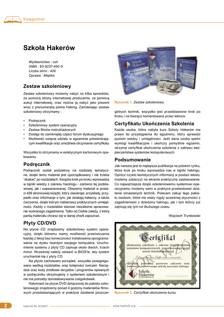 Księgozbiór Szkoła Hakerów Wydawnictwo : csh ISBN : 83-9237-450-9 Liczba stron : 426 Oprawa : Miękka Zestaw szkoleniowy Zestaw szkoleniowy możemy nabyć na kilka sposobów, za pomocą strony internetowej producenta, za pomocą aukcji internetowej, oraz można ją nabyć jako prezent wraz z prenumeratą pisma Haking. Zamawiając zestaw szkoleniowy otrzymamy : • • • • • Podręcznik Szkoleniowy system operacyjny Zestaw filmów instruktażowych Dostęp do zamkniętej części forum dyskusyjnego Możliwość wzięcia udziału w egzaminie potwierdzającym kwalifikacje oraz umożliwia otrzymanie certyfikatu Wszystko to otrzymamy w estetycznym kartonowym opakowaniu. Podręcznik Podręcznik został podzielony na rozdziały tematyczne, dzięki temu materiał jest uporządkowany i nie trzeba “skakać” po rozdziałach. Książka krok po kroku wprowadza w tajniki wiedzy z zakresu hackingu - zarówno tej podstawowej, jak i zaawansowanej. Obszerny materiał w postaci 426 stronicowej książki, który zawieraja: przykłady, przypadki oraz informacje o tym, jak działają hakerzy, a także ćwiczenia, dzięki którym nabierzesz praktycznych umiejętności. Każdy z rozdziałów stanowi niezależne opracowanie wybranego zagadnienia. Tylko od Ciebie zależy, z którą partią materiału chcesz się w danej chwili zapoznać. Rysunek 1. Zestaw szkoleniowy gólnych technik, wszystko jest przedstawione krok po kroku i na bieżąco komentowane przez lektora. Certyfikatu Ukończenia Szkolenia Każda osoba, która nabyła kurs Szkoły Hakerów ma prawo do przystąpienia do egzaminu, który sprawdzi poziom wiedzy i umiejętności. Jeśli dana osoba spełni wymogi kwalifikacyjne i ukończy pomyślnie egzamin, otrzyma certyfikat ukończenia szkolenia z zakresu bezpieczeństwa systemów komputerowych Podsumowanie Jak narazie jest to najlepsza publikacja na polskim rynku, która krok po kroku wprowadza nas w tajniki hakingu. Oprócz czysto teoretycznych informacji w postaci tekstu, możemy zobaczyć na ekranie praktyczne zastosowanie. Co najważniejsze dzięki szkoleniowemu systemowi operacyjnemu możemy sami w praktyce przetestować działanie omawianych technik. Polecam zakup tego pakietu osobom, które nie miały nigdy wcześniej styczności z zagadnieniami z dziedziny hakingu, jak i tym którzy już zajmują się tym od dłuższego czasu. Wojciech Trynkowski Płyty CD/DVD Na płycie CD znajdziemy szkoleniowy system operacyjny, dzięki któremu mamy możliwość przećwiczenia każdej z lekcji bez konieczności instalowania oprogramowania na dysku twardym swojego komputera. Uruchomienie systemu z płyty CD zajmuje około dwóch, trzech minut. Wcześniej należy ustawić w BIOS'ie, aby system uruchamiał się z płyty CD. Na płycie zachowano porządek, wszystko posegregowano według rozdziałów, oraz kolejności ćwiczeń. Narzędzia oraz kody źródłowe skryptów i programów opisanych w podręczniku otrzymujemy z systemem szkoleniowym i nie ma potrzeby doinstalowywania czegokolwiek. Natomiast na płycie DVD dołączonej do pakietu szkoleniowego znajdziemy ponad 4 godziny materiałów filmowych przedstawiających w praktyce działanie poszcze- 2 hakin9 Nr 4/2007 Rysunek 2. Certyfikat ukończenia kursu www.hakin9.org